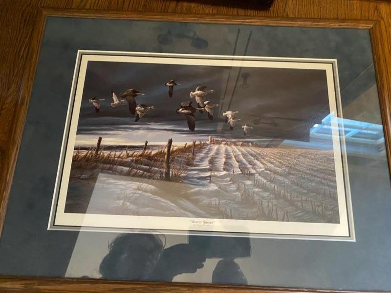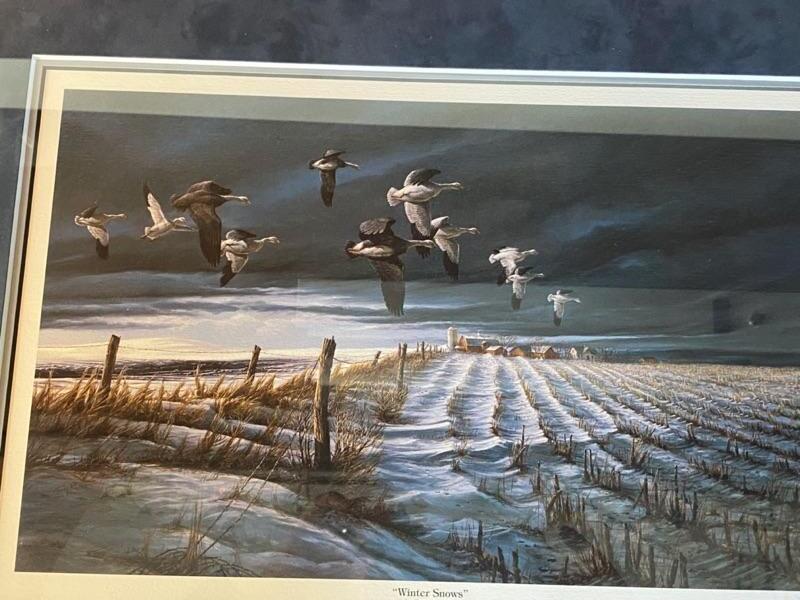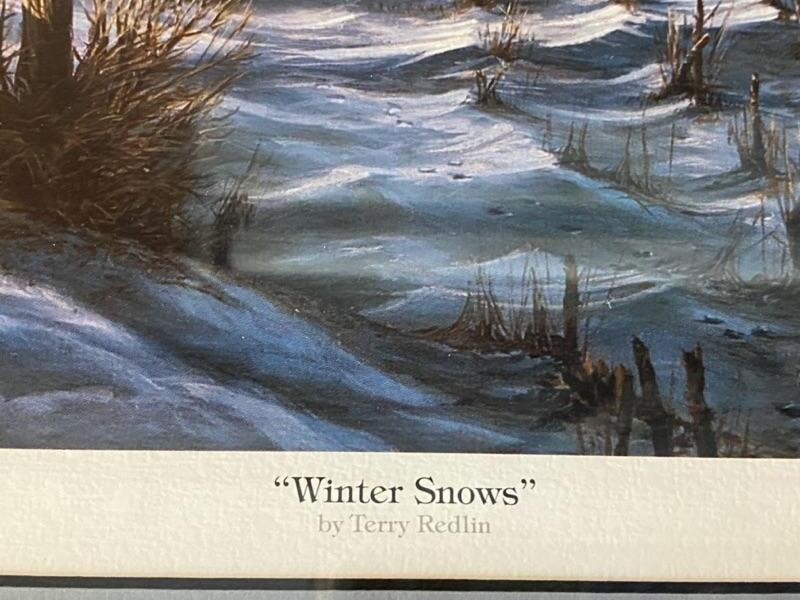 Framed print by Terry Redlin. Canadian geese flying ove a winter field. 23" X 30"
