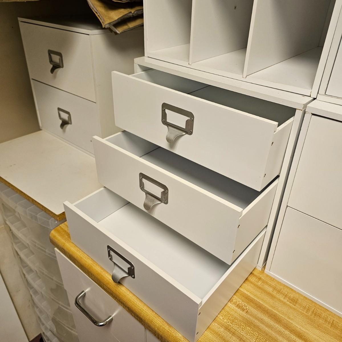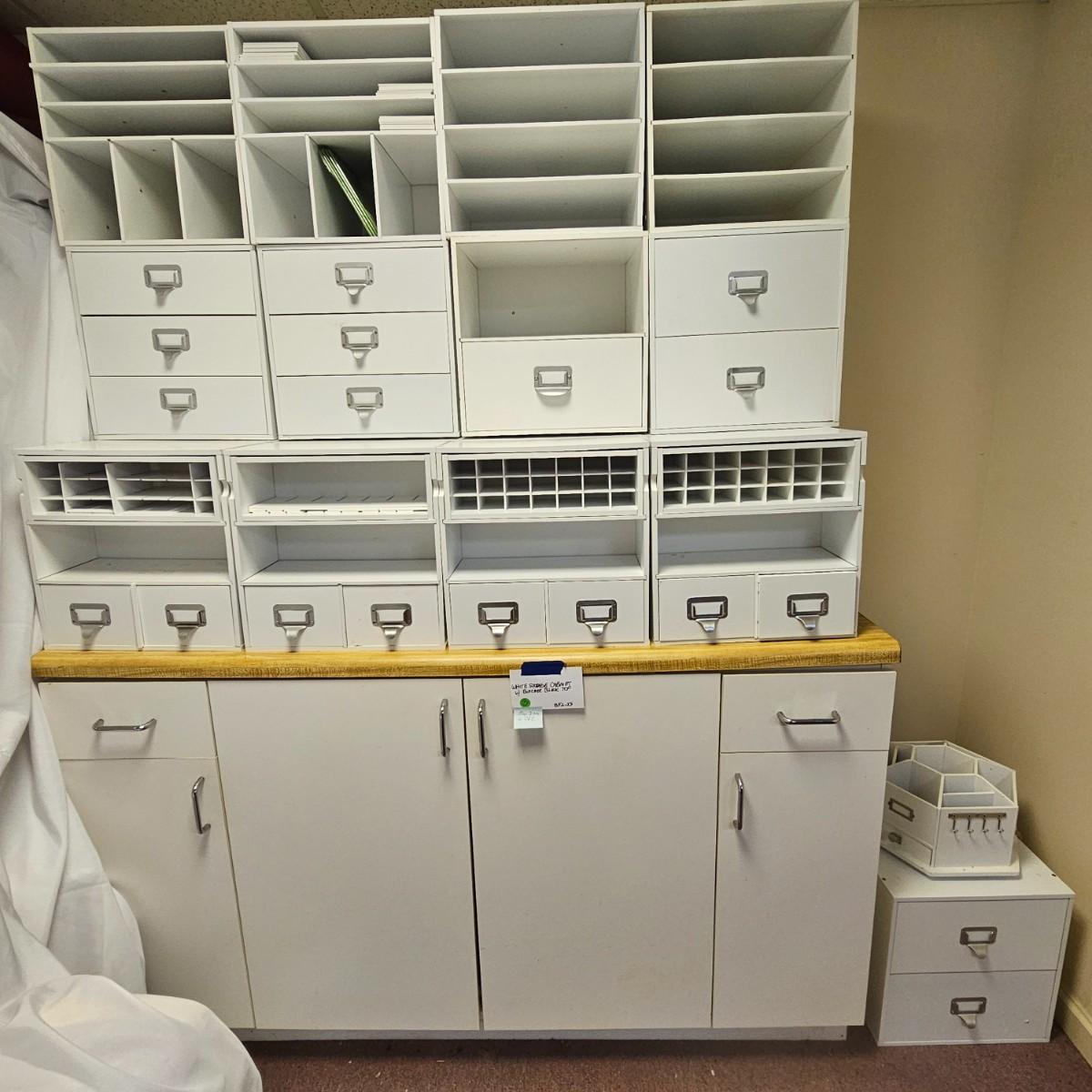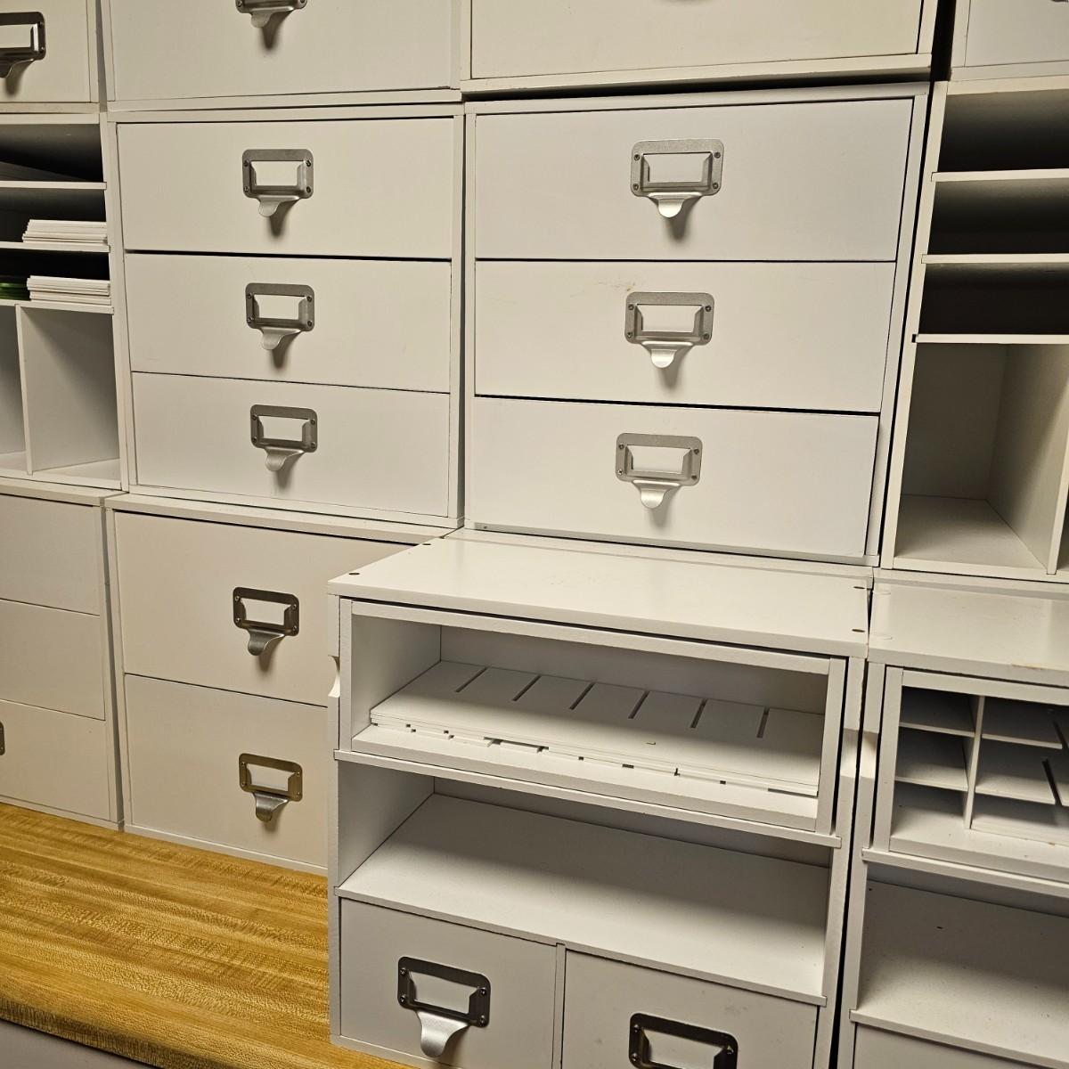 Cube style stacking drawer and shelf combo units. Large drawers and cubby pieces are adjustable with dividers and insert pieces as shown. Only the stack units are part of this lot, the base cabinet and counter top are a separate listing in this auction. Drawers have metal pulls and placard insert areas, measure 14.25" x 14.5" x 14.25"H. Cubby units are 14.25" x 7.25" x 14.25"H. All work together to make a nice arrangement. 18 pieces total. The short hexagon piece is 12"W x 8"H, has a lazy Susan base and storage. See photos for details. Local pickup only.