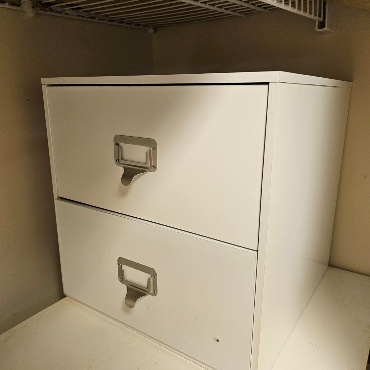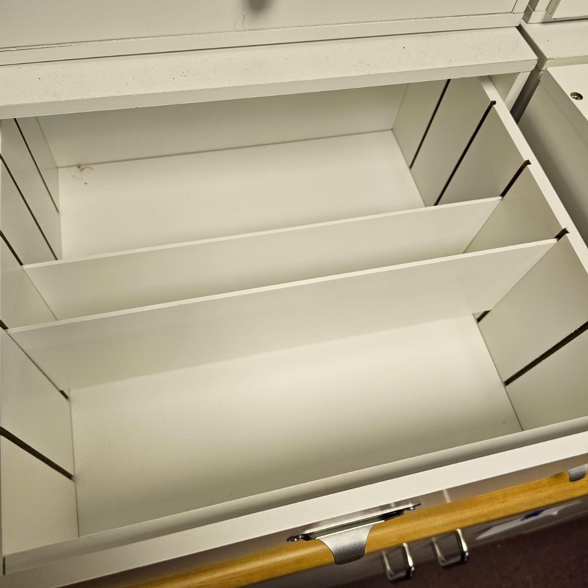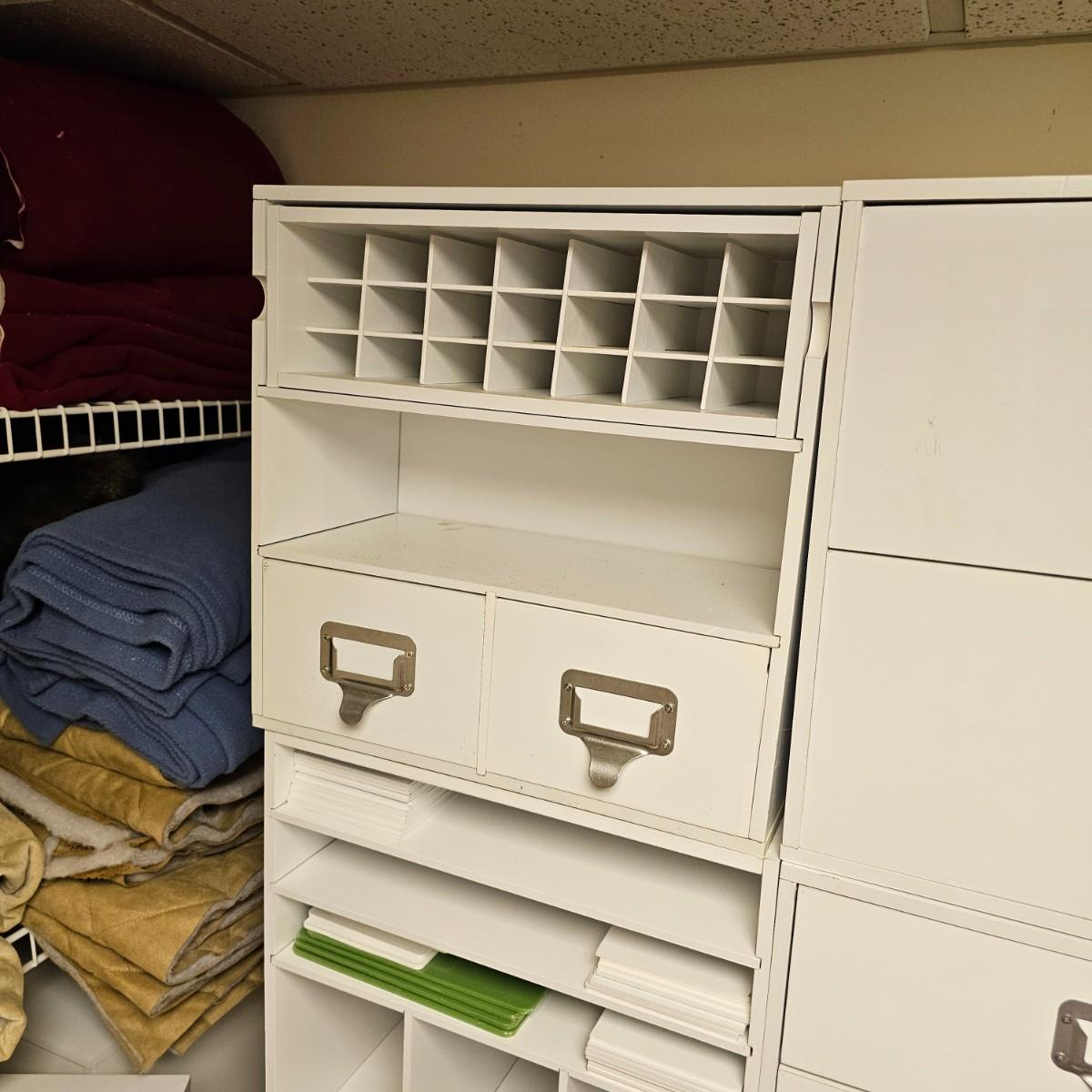 Cube style stacking drawer and shelf combo units. Large drawers and cubby pieces are adjustable with dividers and insert pieces as shown. Only the stack units are part of this lot, the base cabinet and counter top are a separate listing in this auction. Drawers have metal pulls and placard insert areas, measure 14.25" x 14.5" x 14.25"H. Cubby units are 14.25" x 7.25" x 14.25"H. All work together to make a nice arrangement. 18 pieces total. The short hexagon piece is 12"W x 8"H, has a lazy Susan base and storage. See photos for details. Local pickup only.