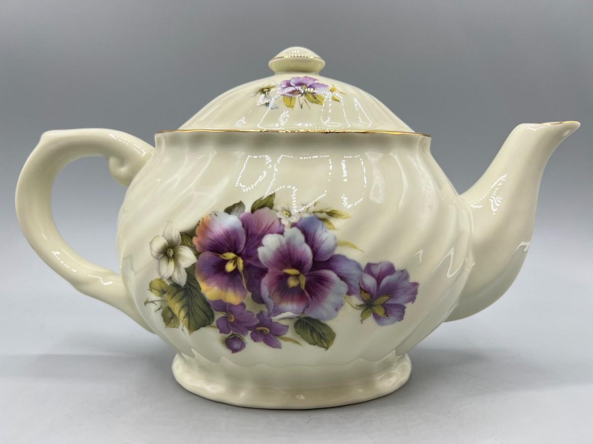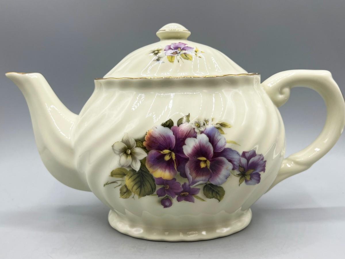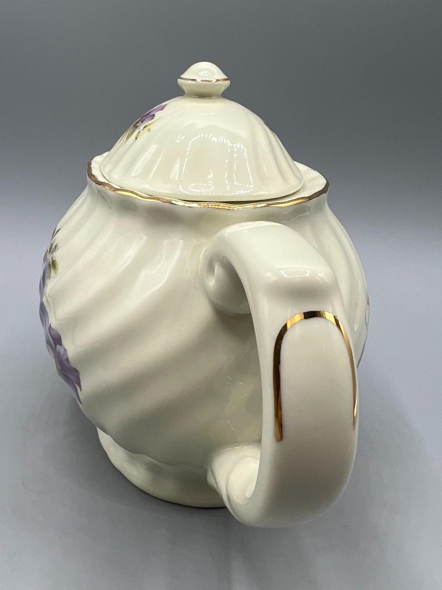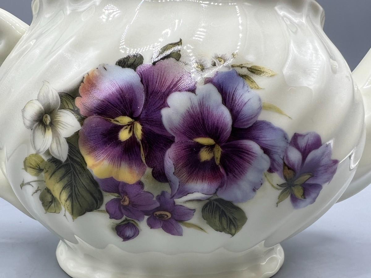 White Swirled Ceramic Teapot with Purple Violet Flowers