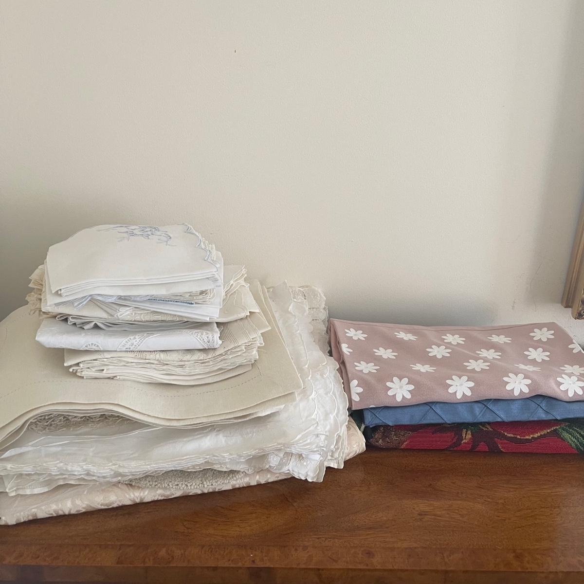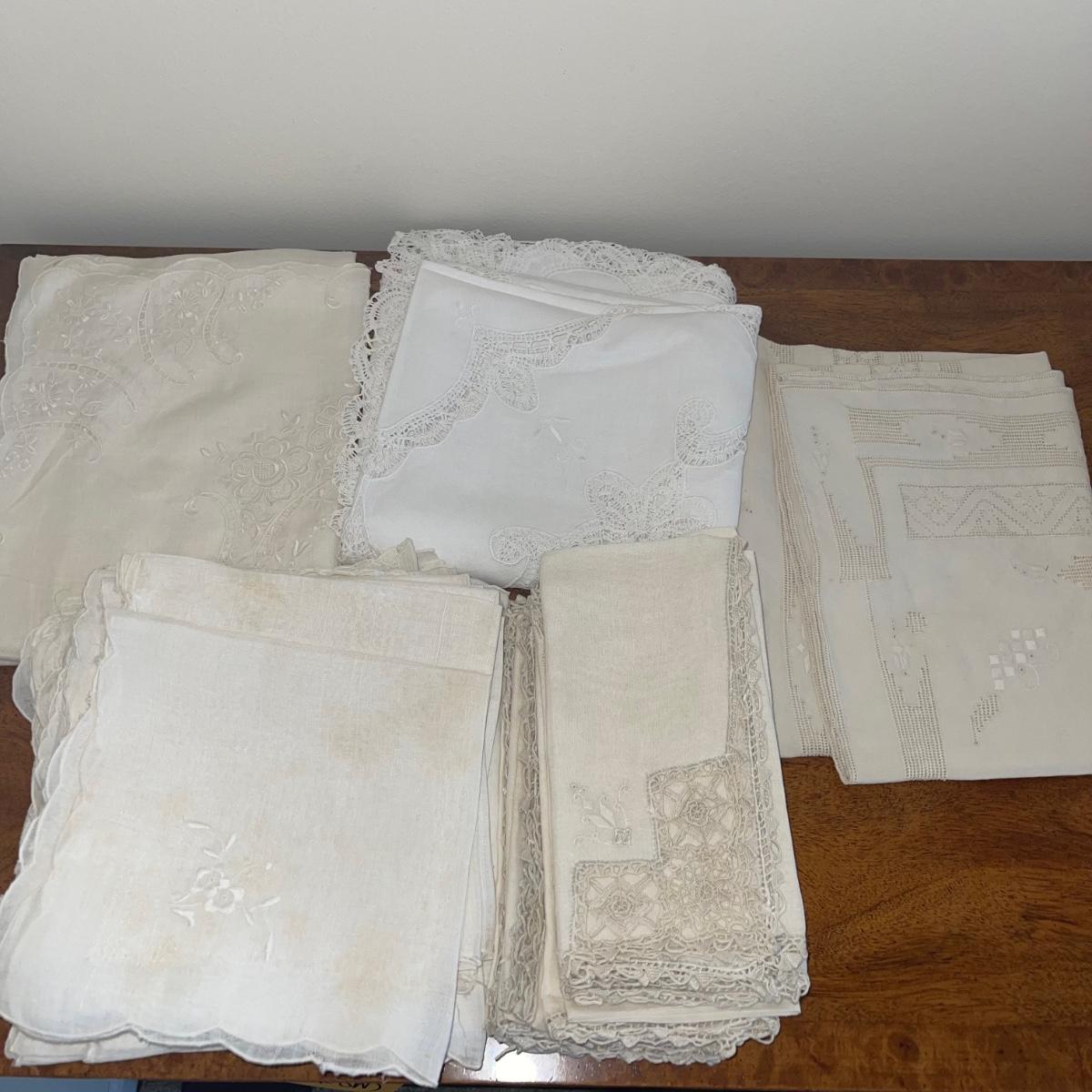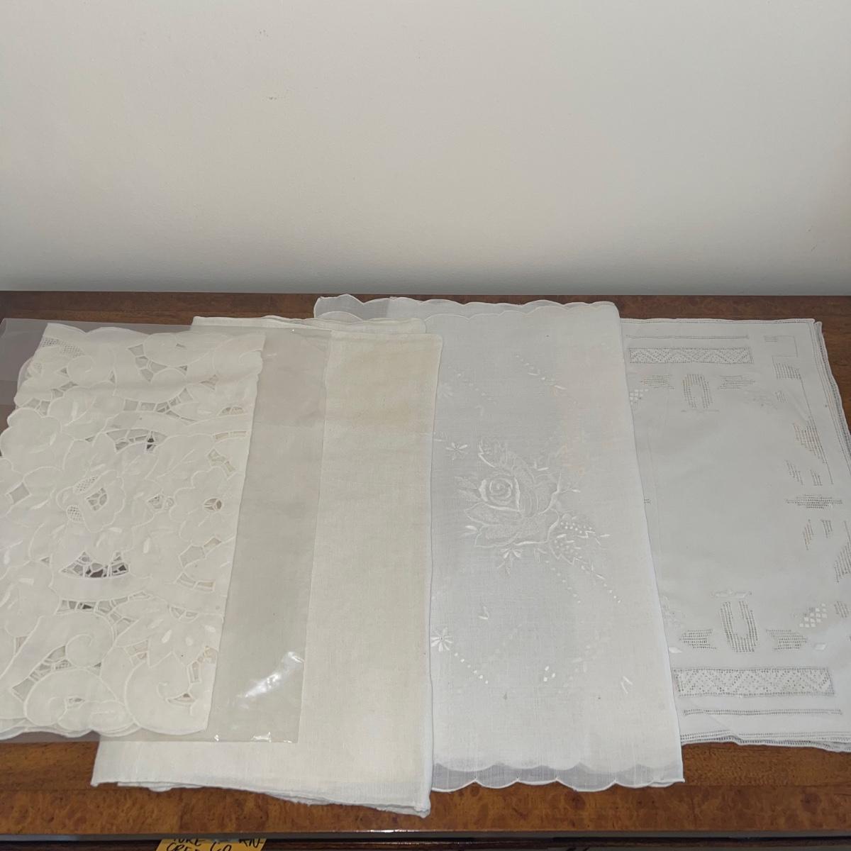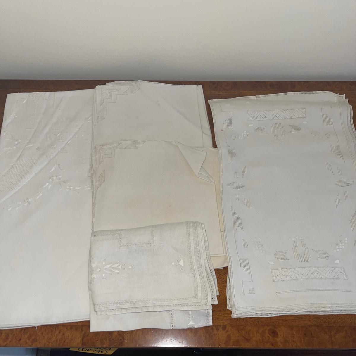 A variety of cloth napkins, placemats, doilies, table runners, table cloths; some in sets and some in few or singles. Some of them have embrodery detailing. The three colorful table runners measure 70 inches long.