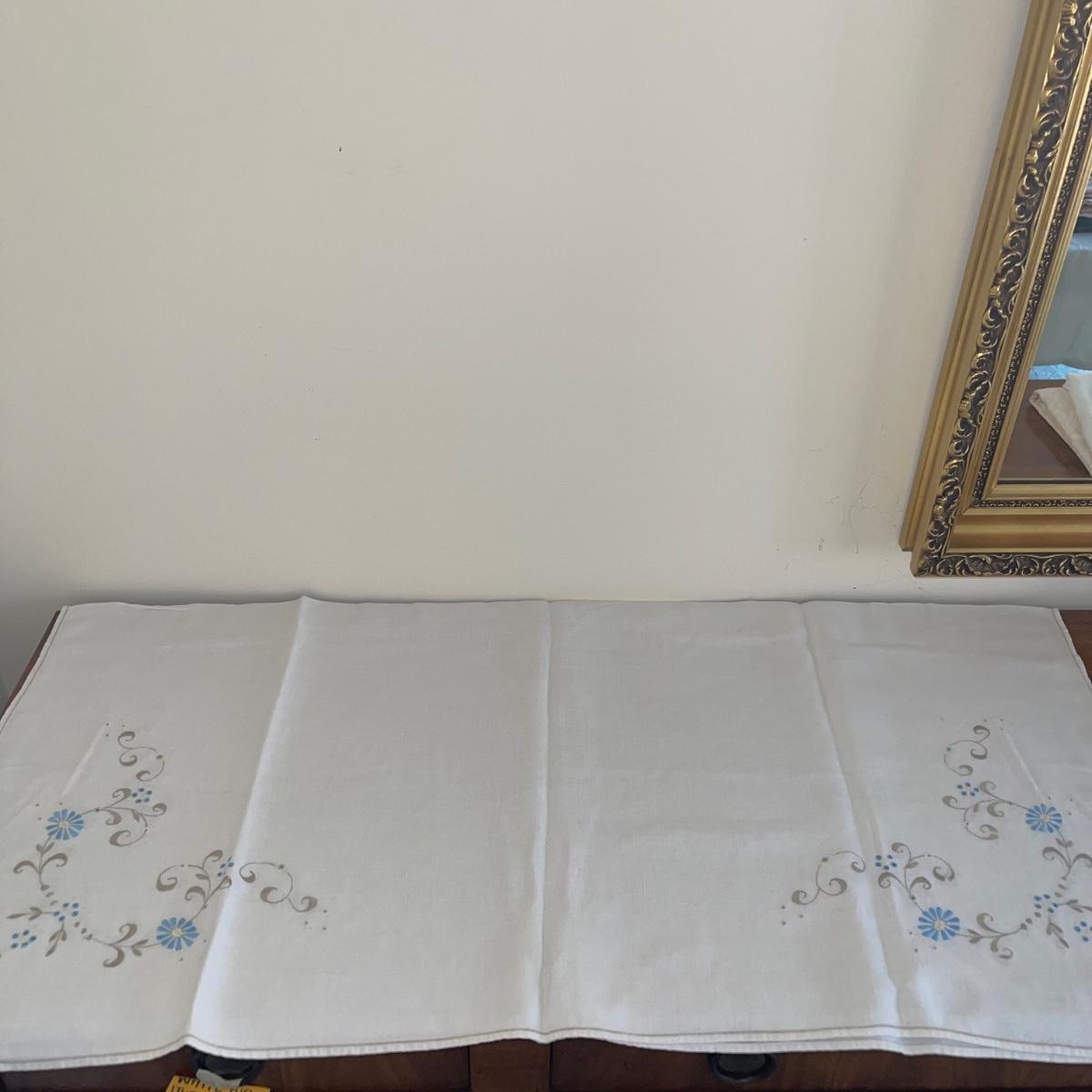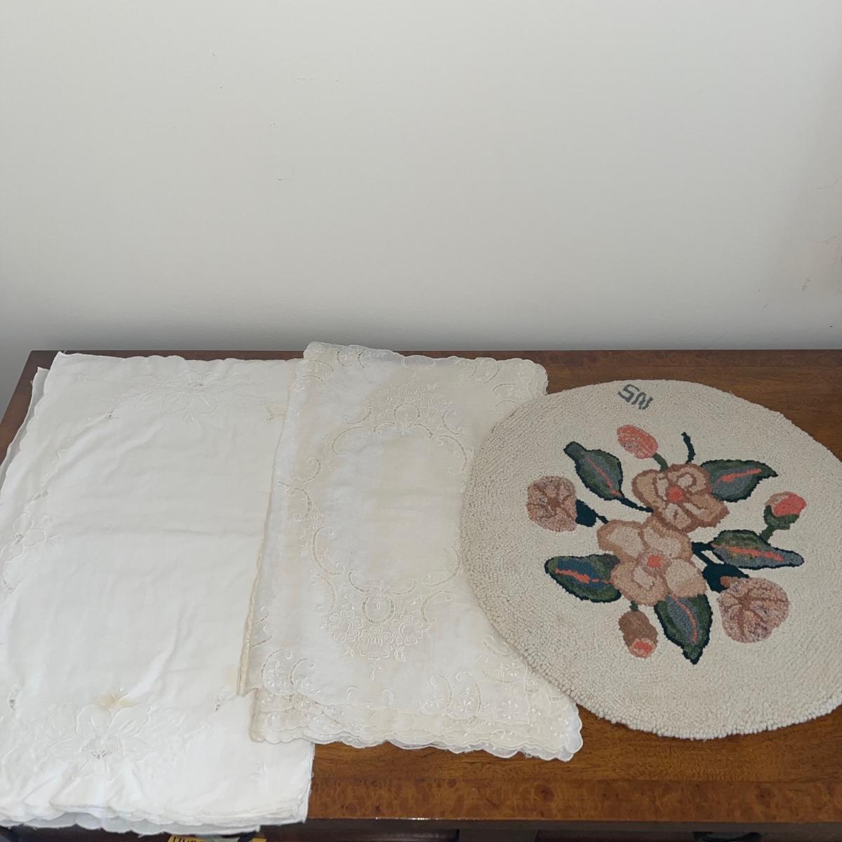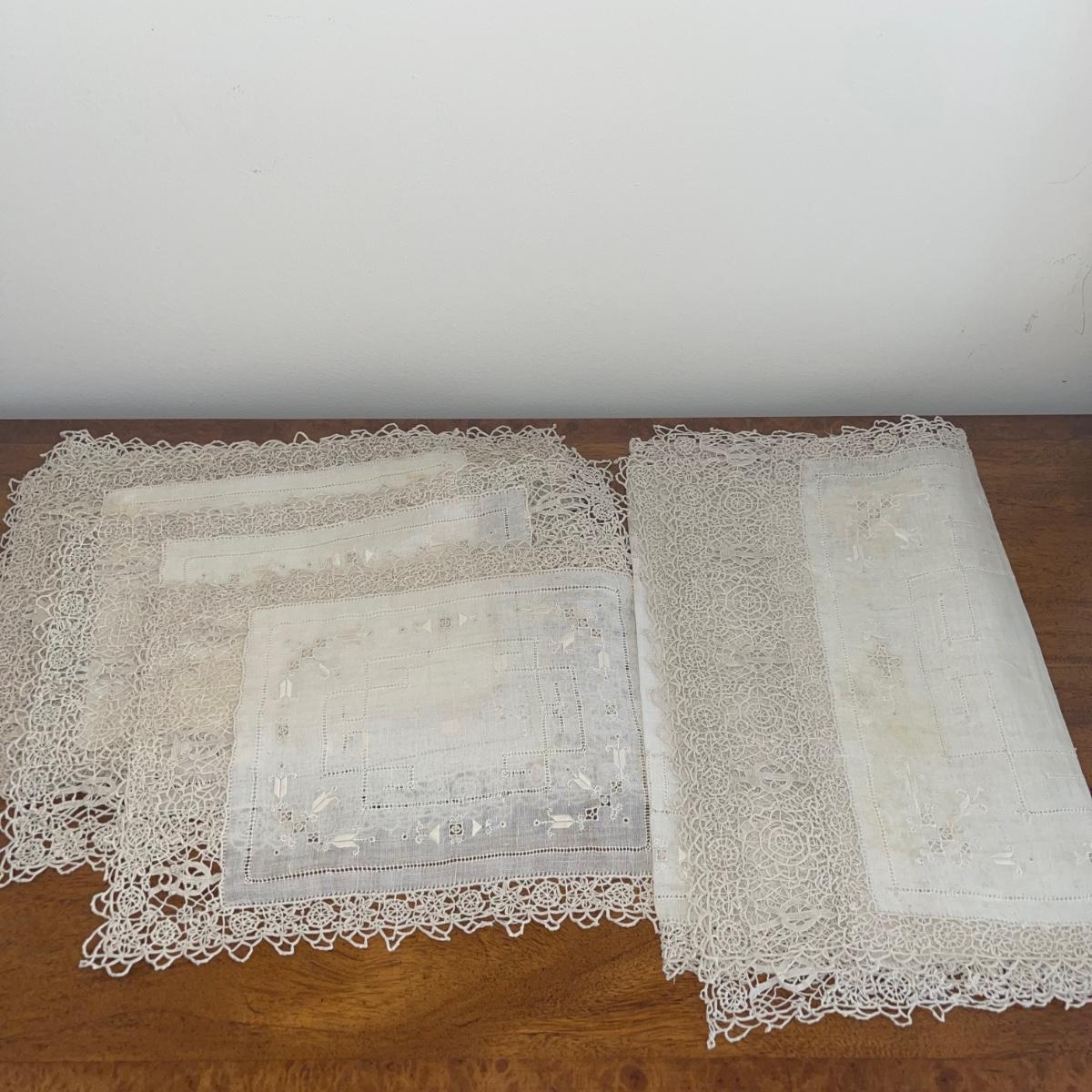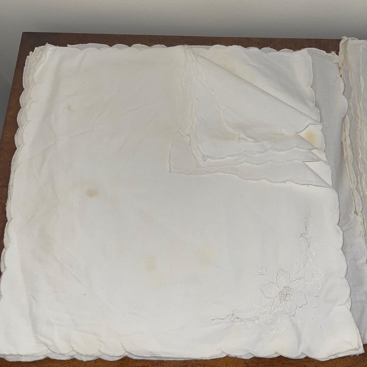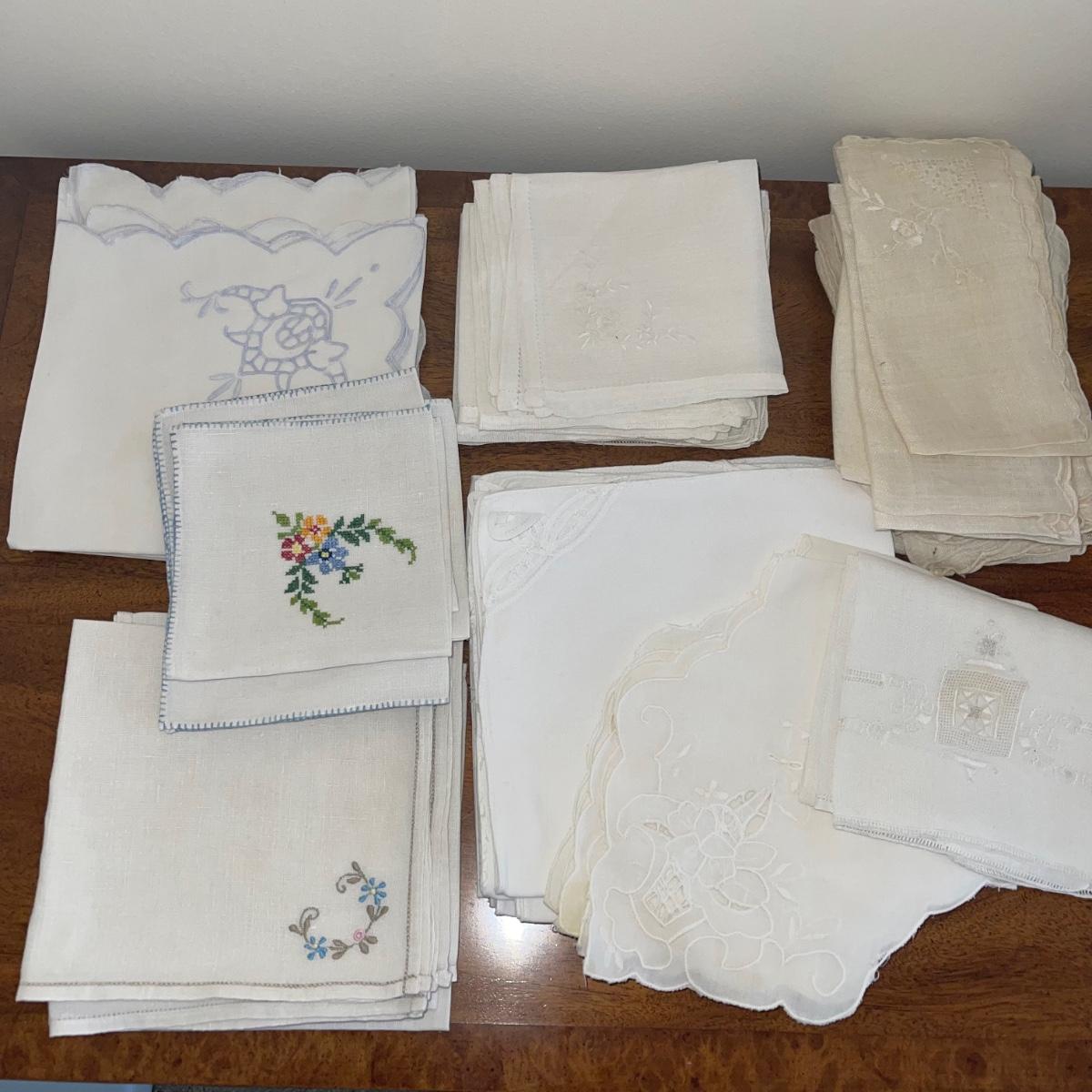 A variety of cloth napkins, placemats, doilies, table runners, table cloths; some in sets and some in few or singles. Some of them have embrodery detailing. The three colorful table runners measure 70 inches long.
