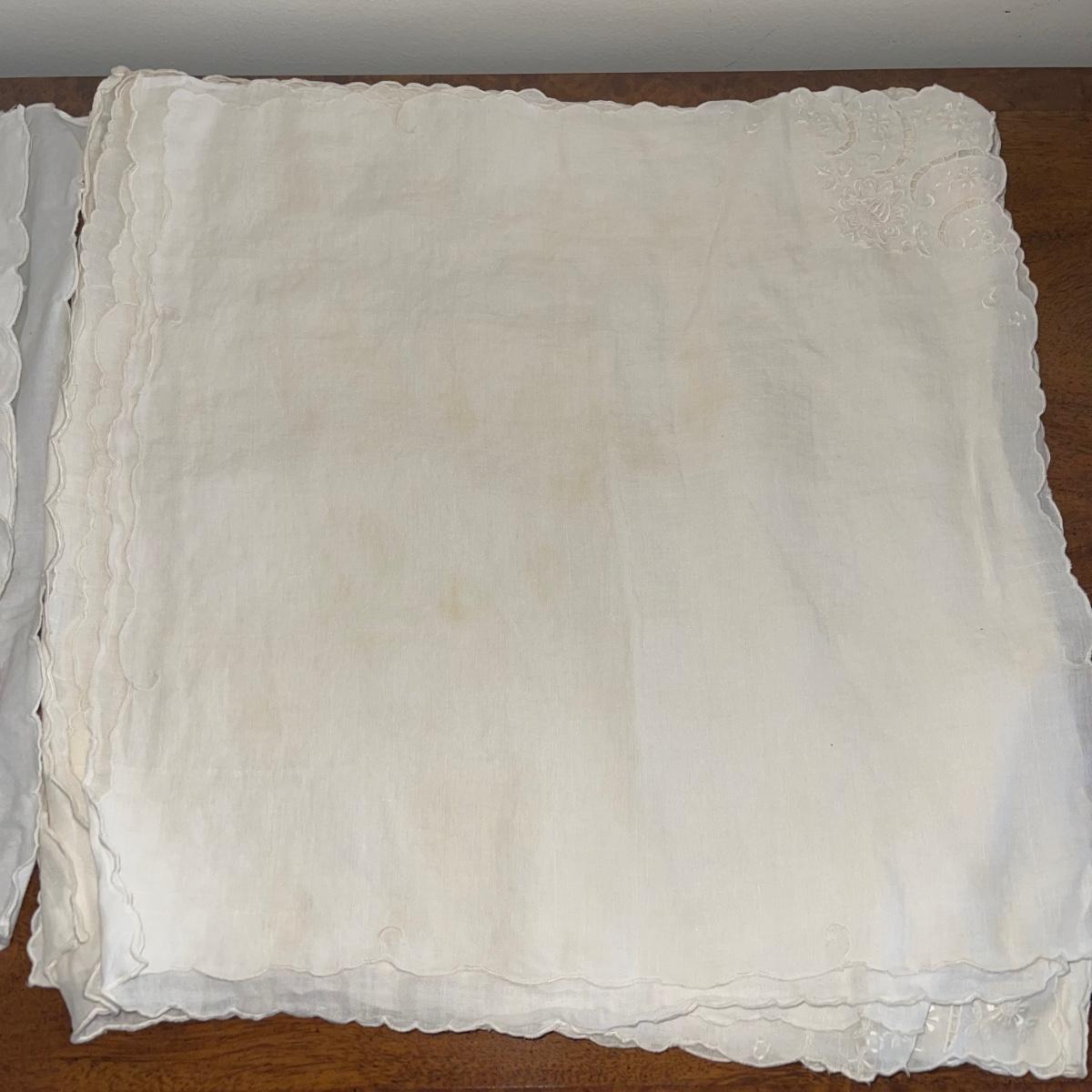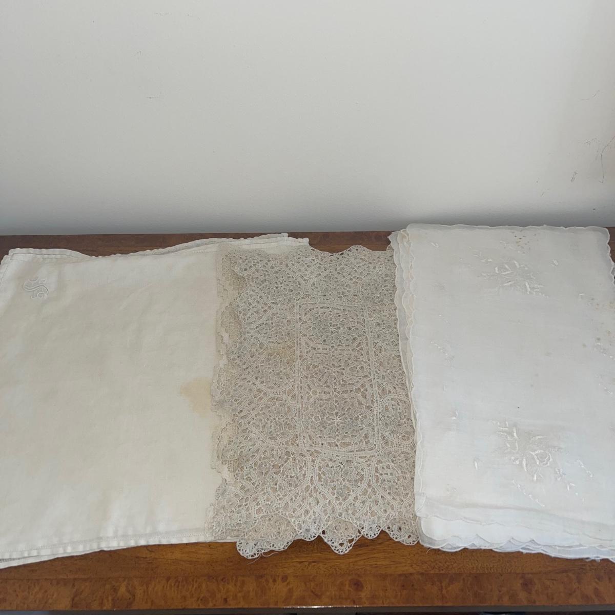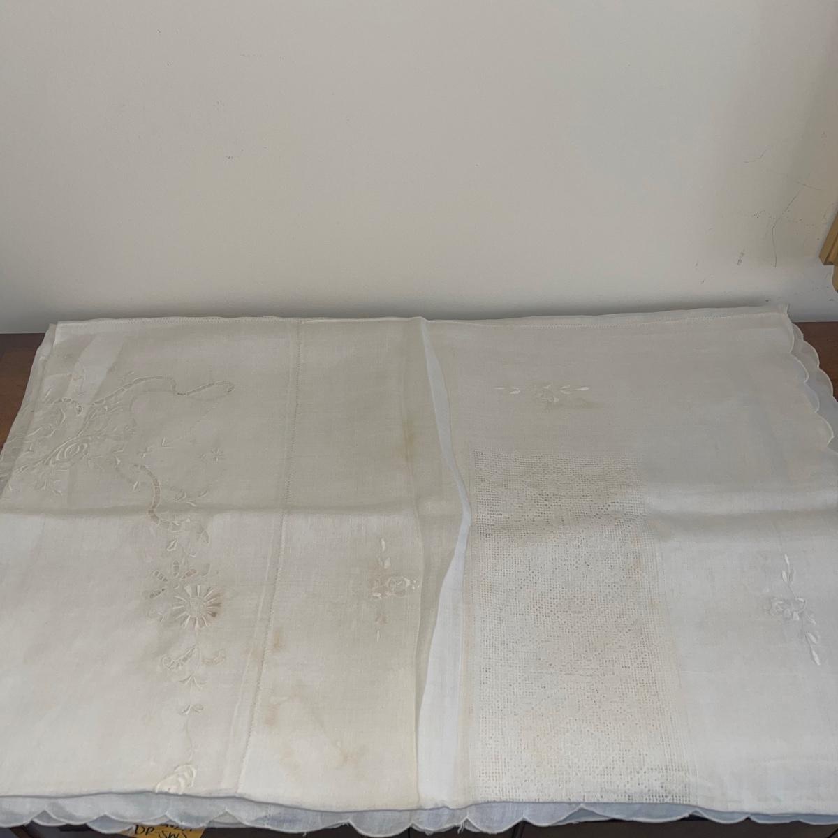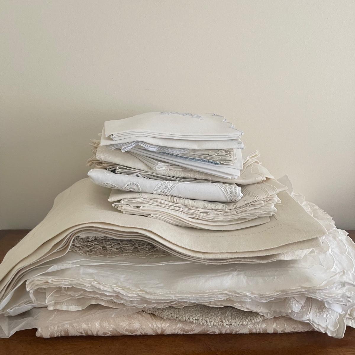 A variety of cloth napkins, placemats, doilies, table runners, table cloths; some in sets and some in few or singles. Some of them have embrodery detailing. The three colorful table runners measure 70 inches long.
