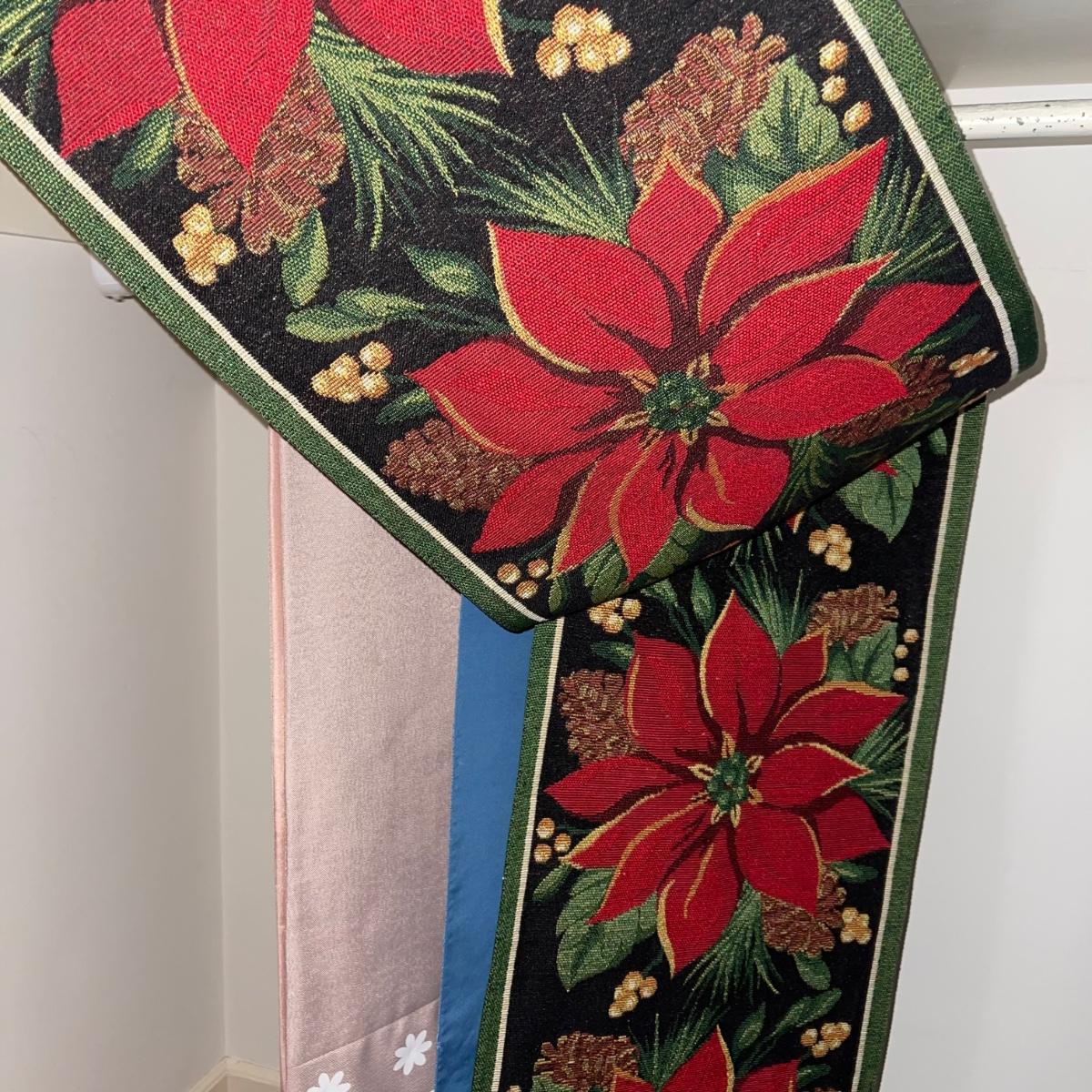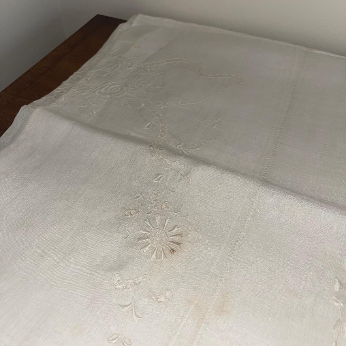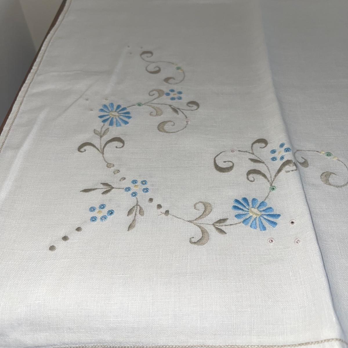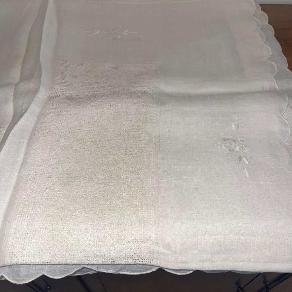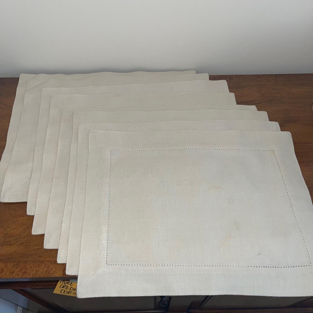 A variety of cloth napkins, placemats, doilies, table runners, table cloths; some in sets and some in few or singles. Some of them have embrodery detailing. The three colorful table runners measure 70 inches long.