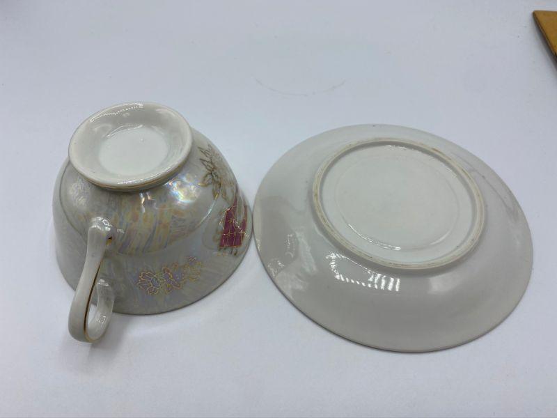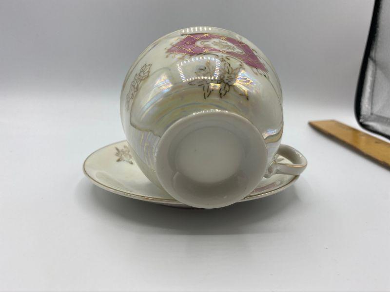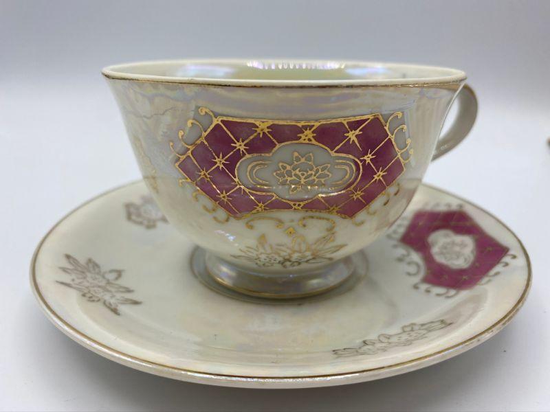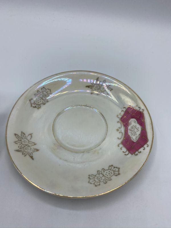 White tea cup & saucer. Small red pattern with gold details. Good condition, no chips. No makers mark.