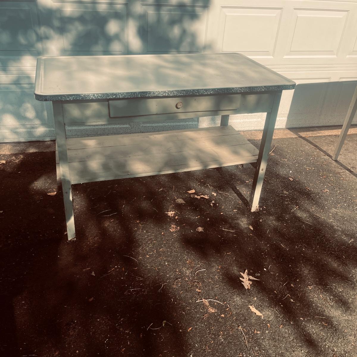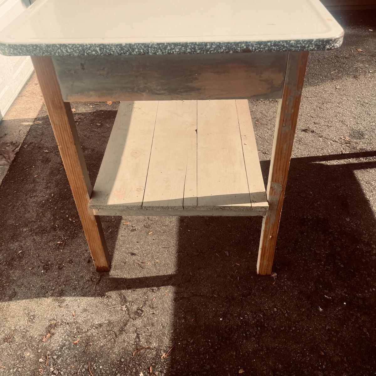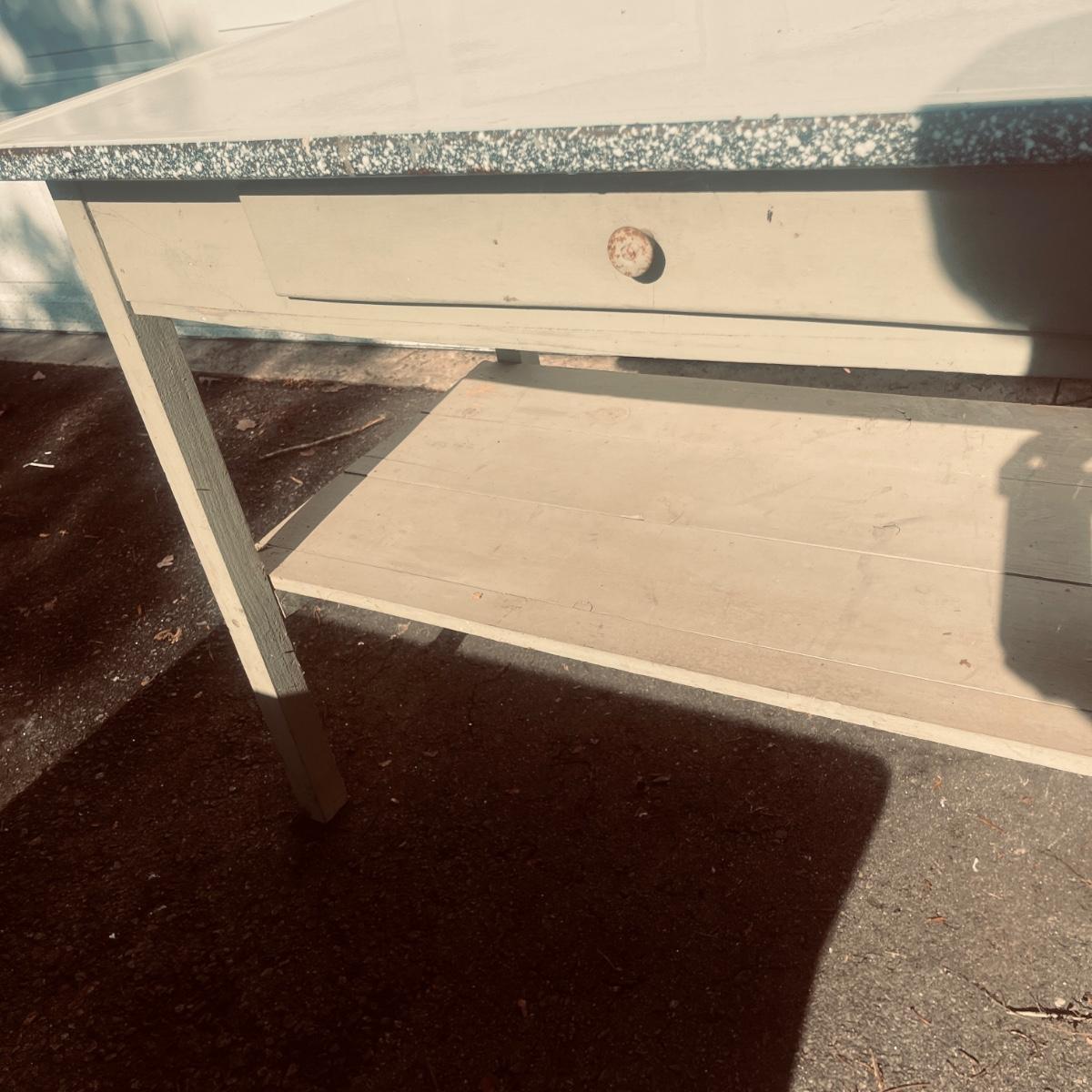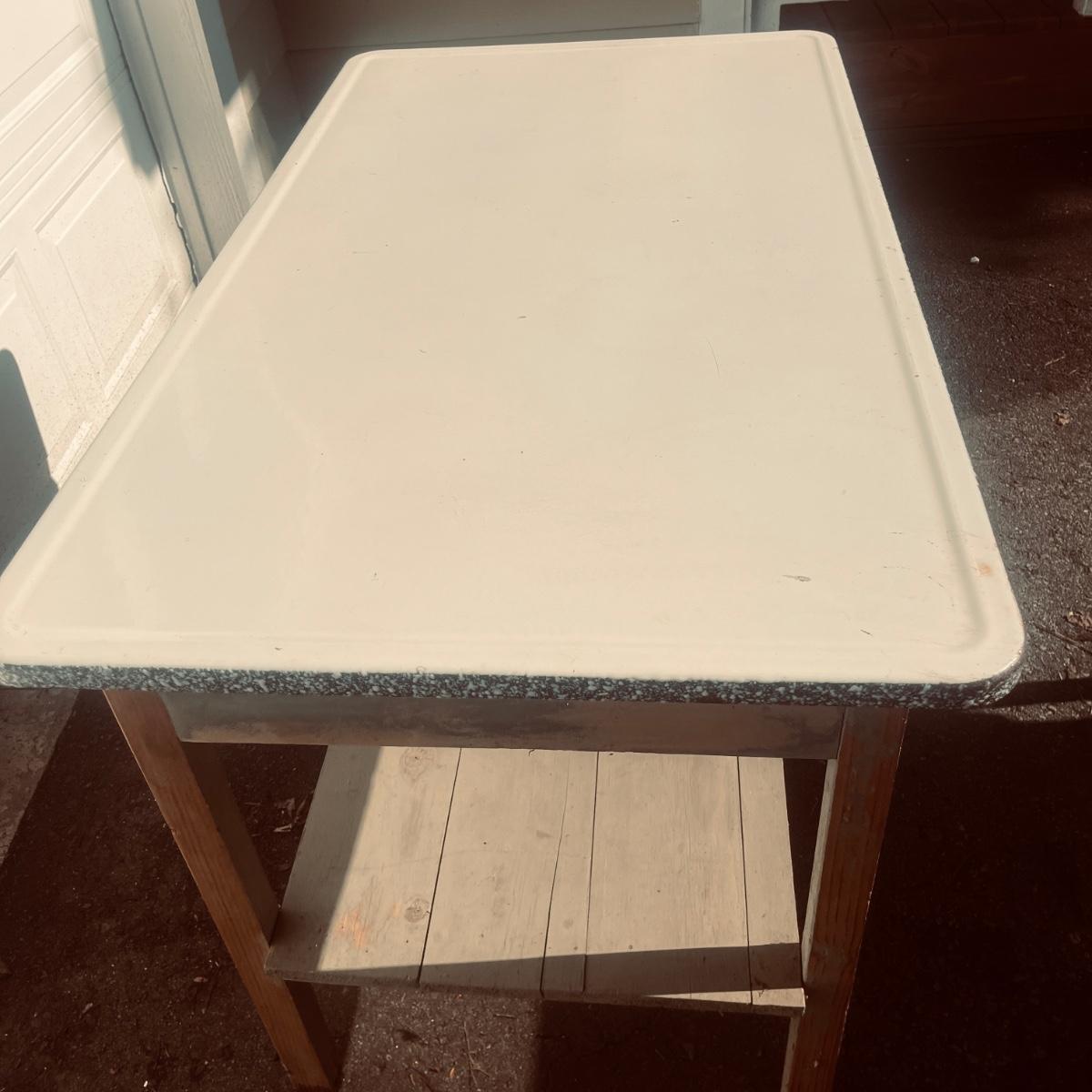 Lot includes an enamel white topped table with speckled sides. Table has a wooden base with one drawer and a shelf underneath. Table measures 48” x 27” x 31”H. Base has wear and scratches, see pictures.