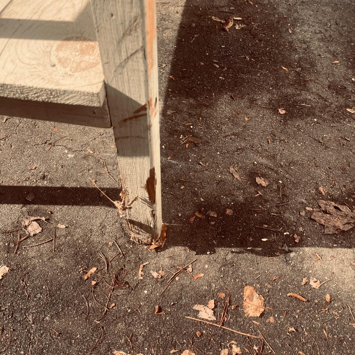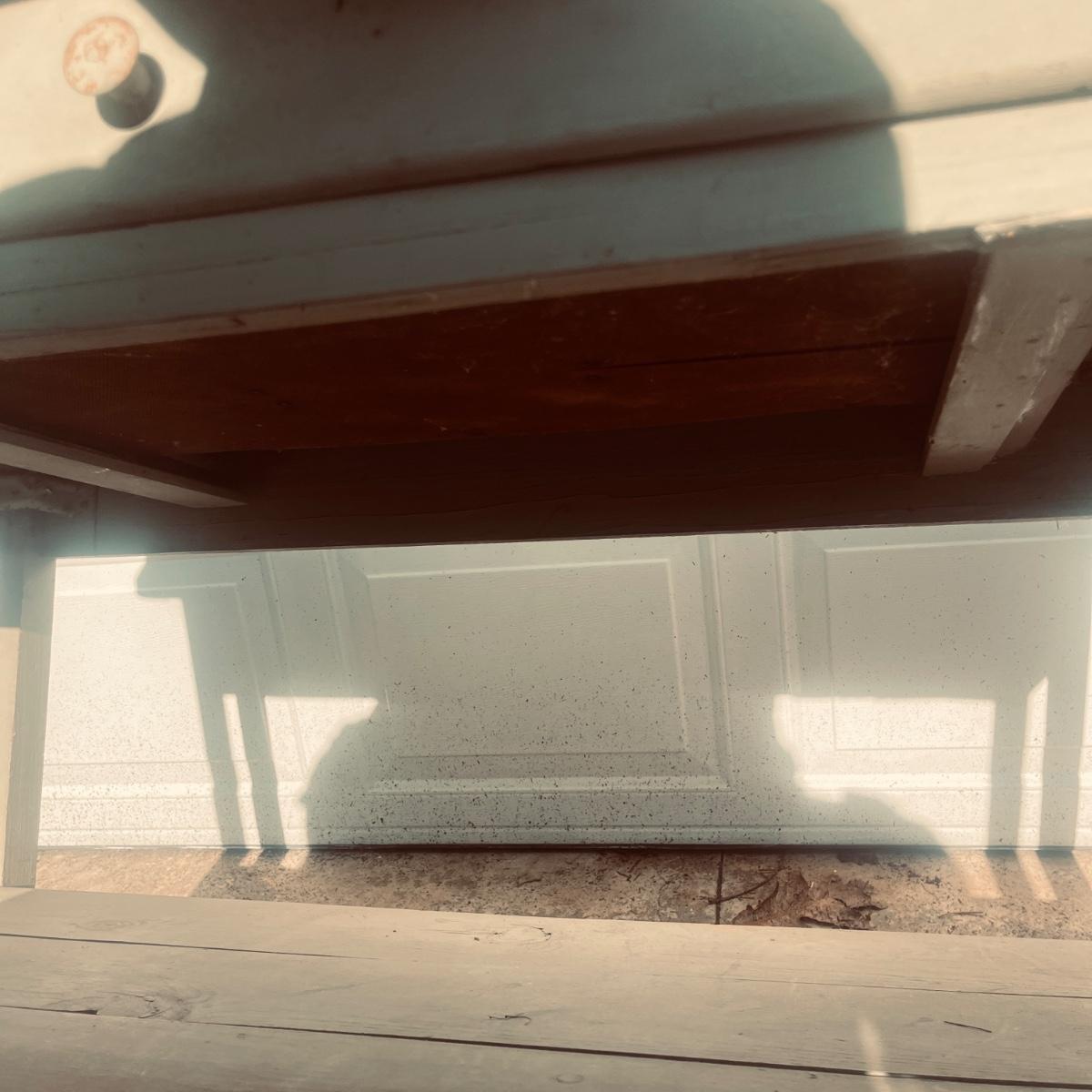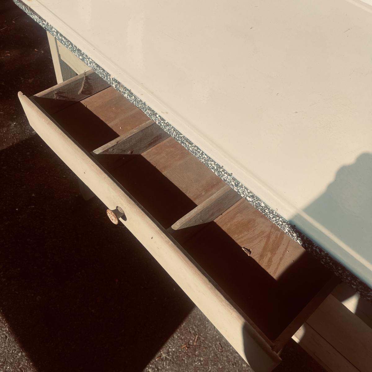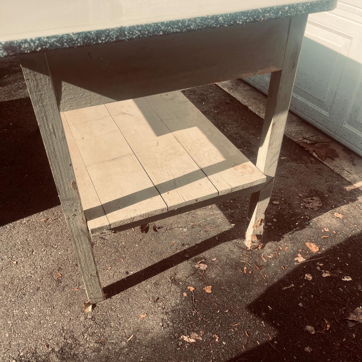 Lot includes an enamel white topped table with speckled sides. Table has a wooden base with one drawer and a shelf underneath. Table measures 48” x 27” x 31”H. Base has wear and scratches, see pictures.