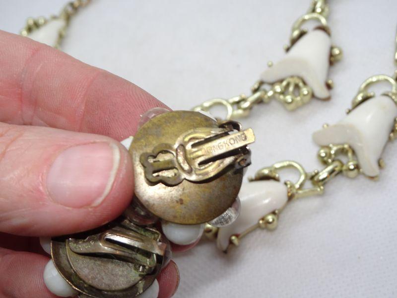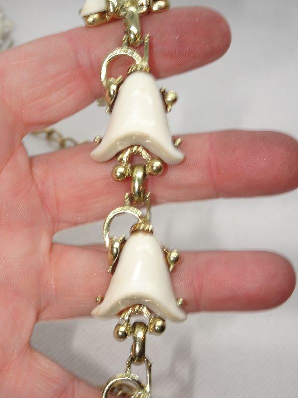 White Tulip Shaped Thermoplastic Necklace & Matching Bracelet, Beaded Clip Earrings - Reserve