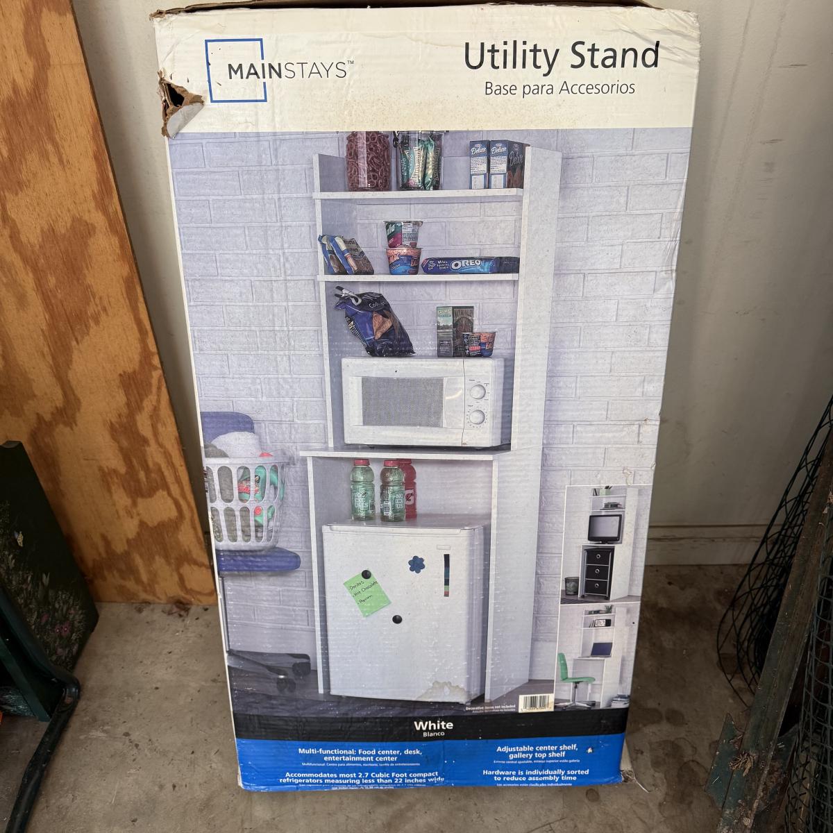 This lot contains a white utility stand. It is still in its original box and would need to be assembled. See pictures for measurements and details. Local pick up only.