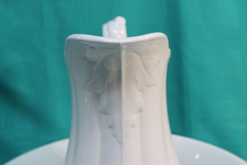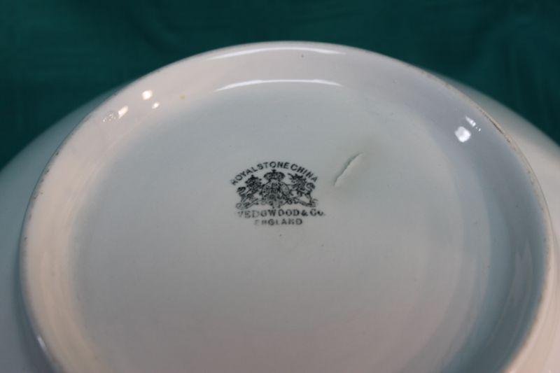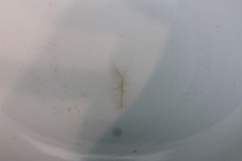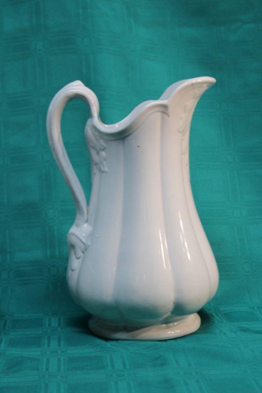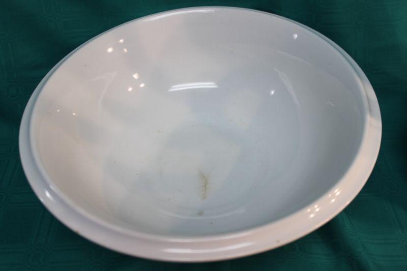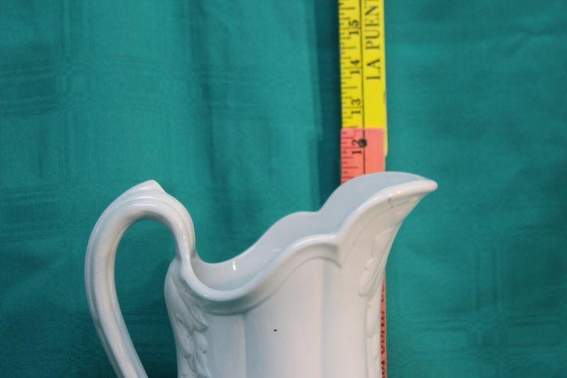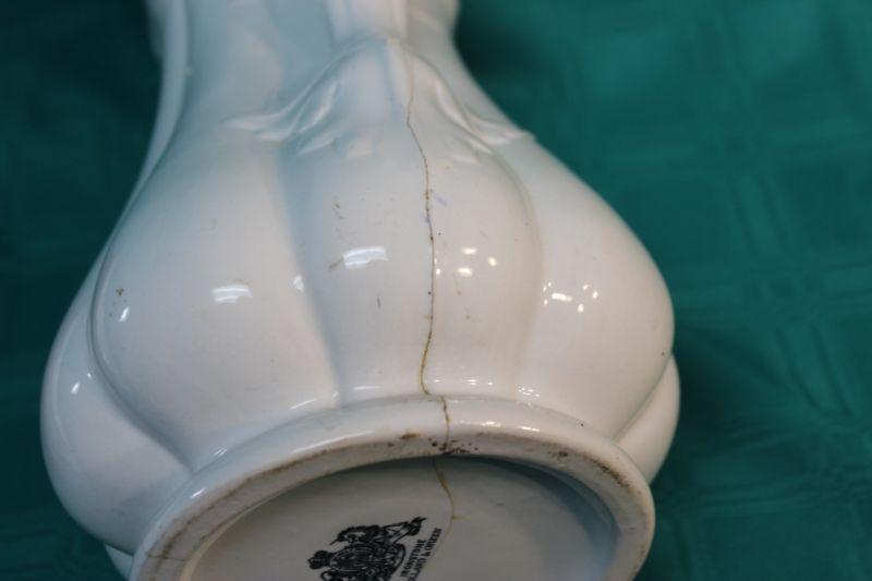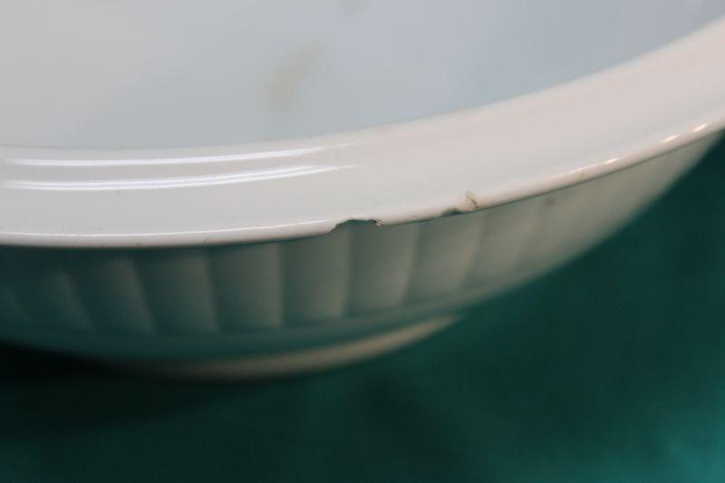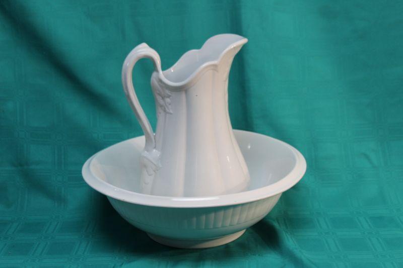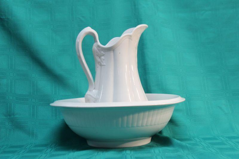 Wash basin bowl with pitcher. Good for decor. There is a crack in the bottom of the basin and in the pitcher. Small chip in bowl edge. Turned the right way and you wouldn't notice any of the flaws. Good size.
