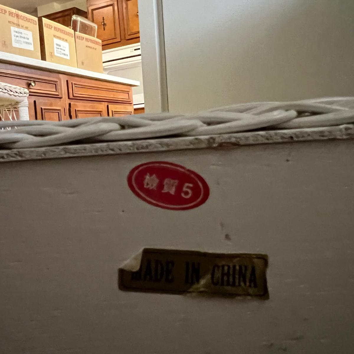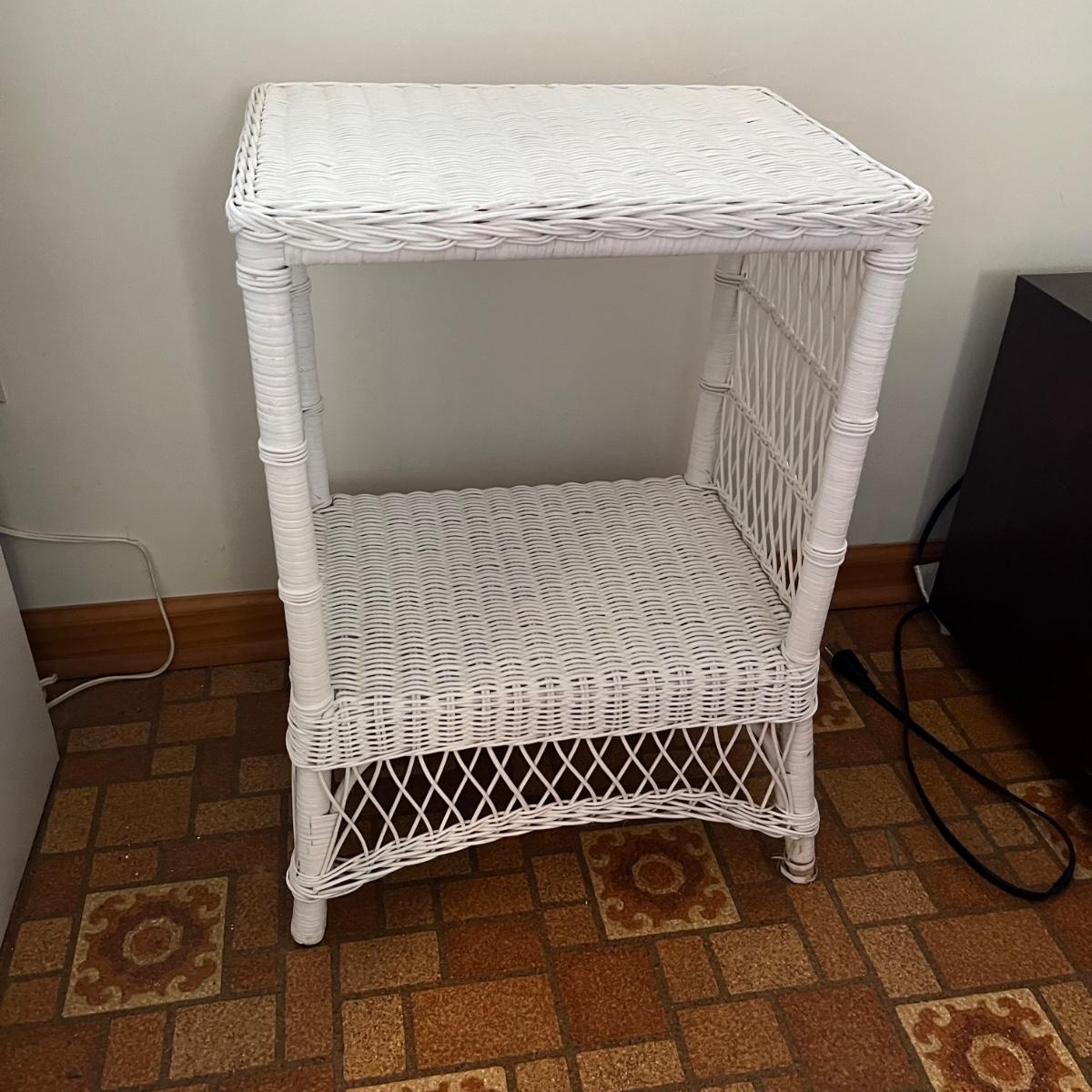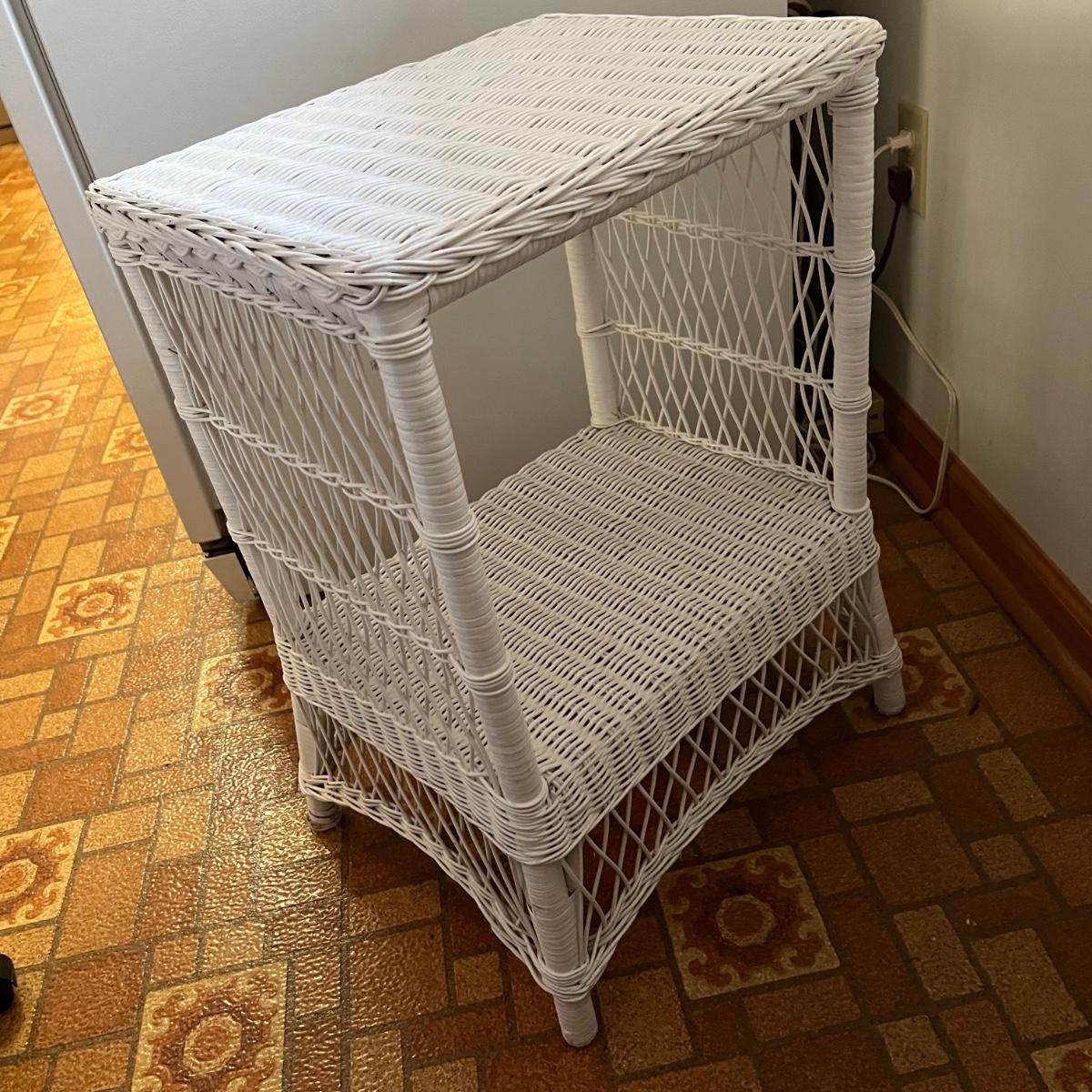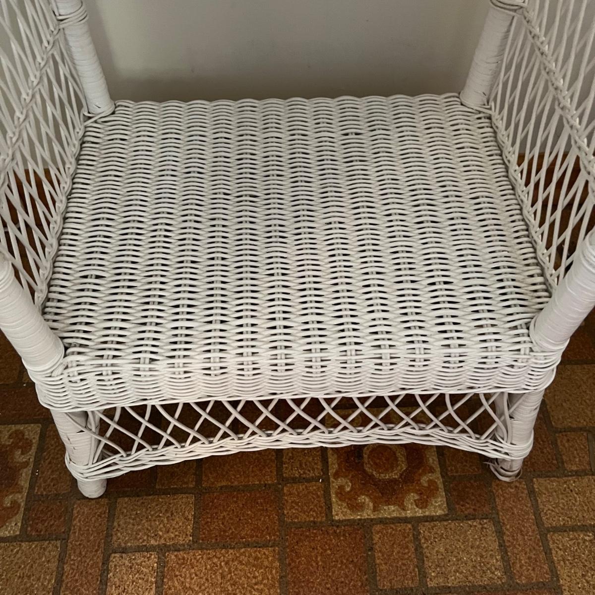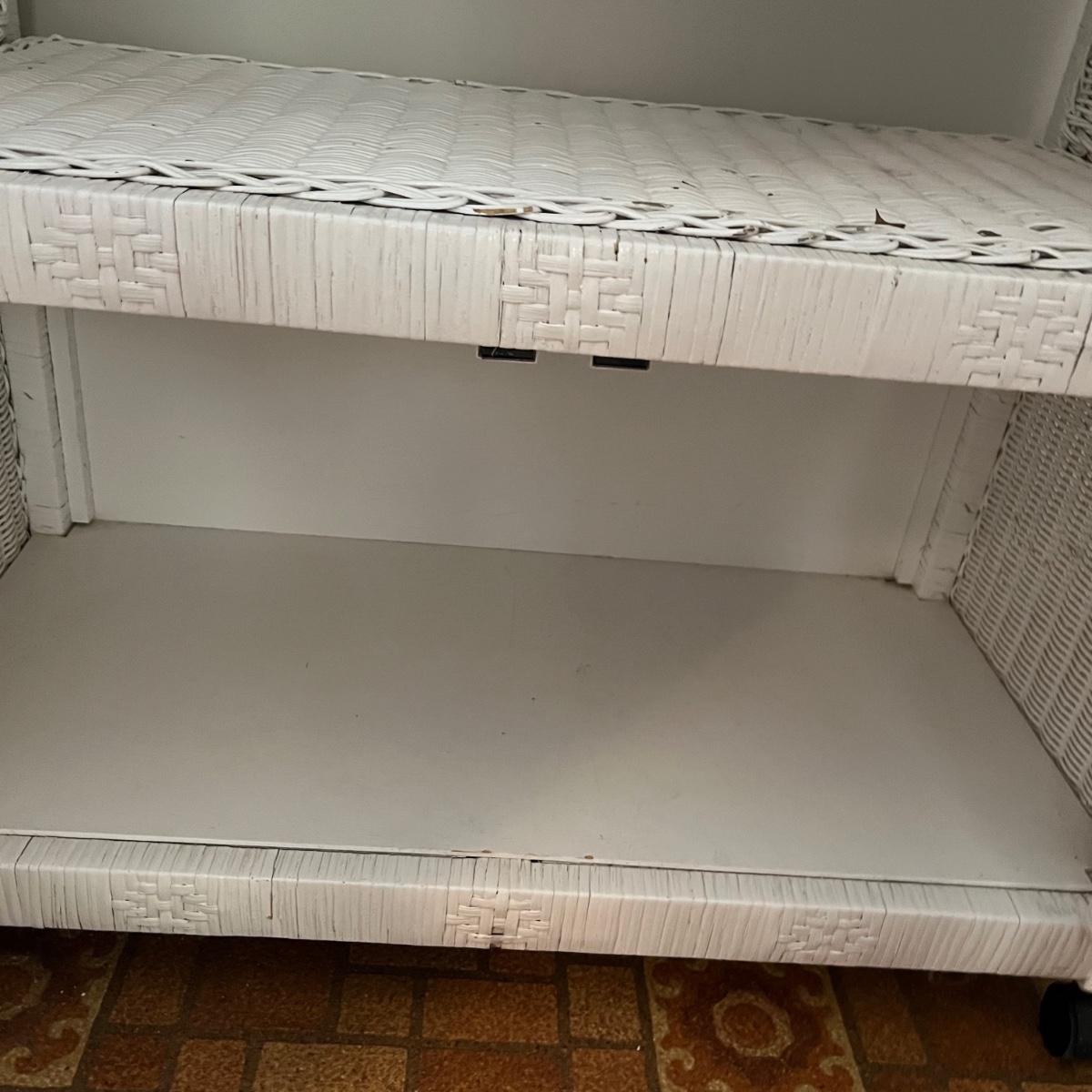 These 2 wicker pieces are both in great condition. The cabinet is on plastic casters and features a lower cabinet with a shelf above and another shelf above that, which is the top surface. This cabinet measures 30” x 15” x 33.5”H. Side table with lower shelf measures 17” x 14” x 26”H.