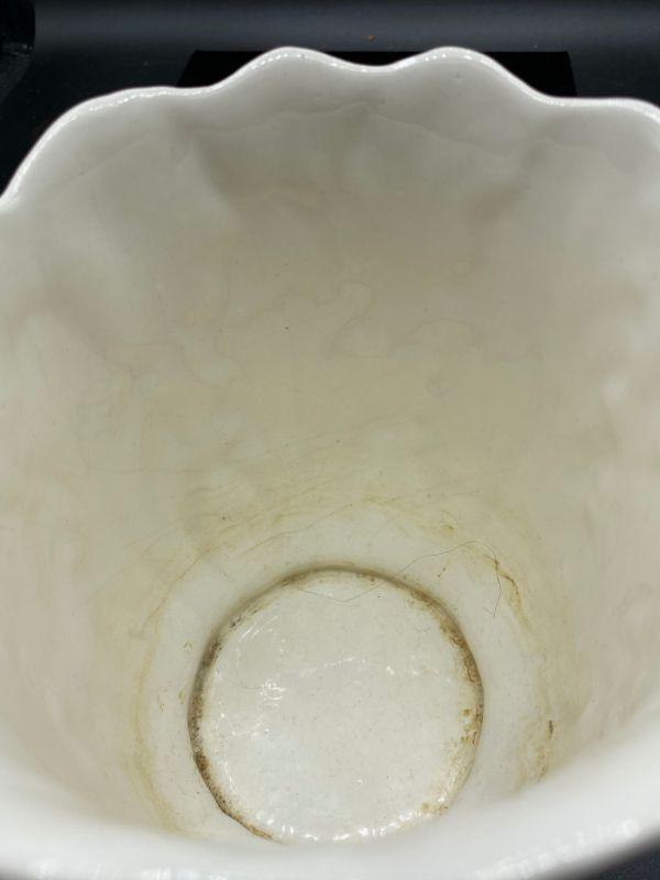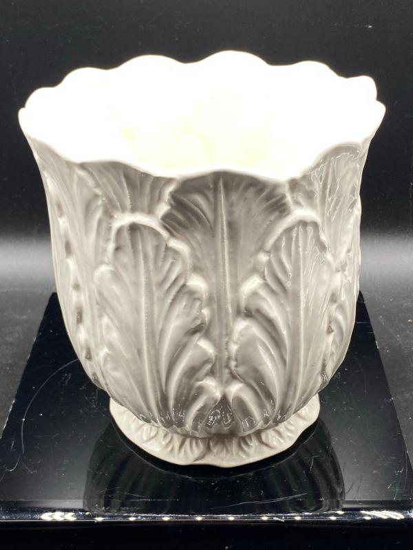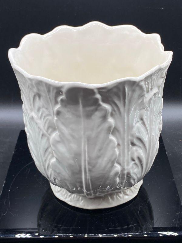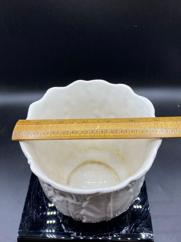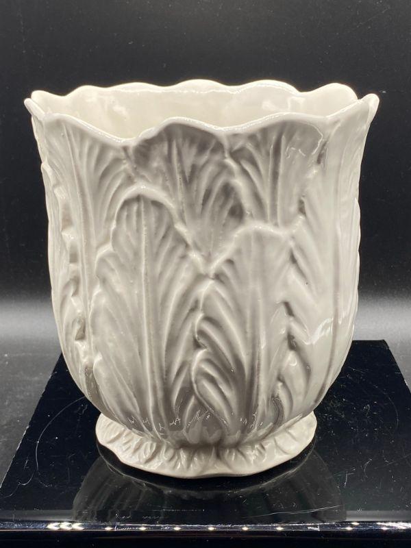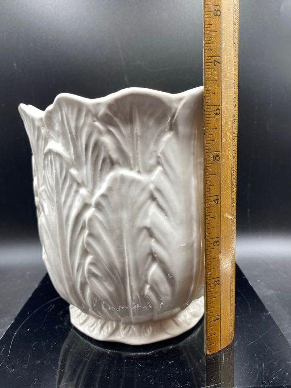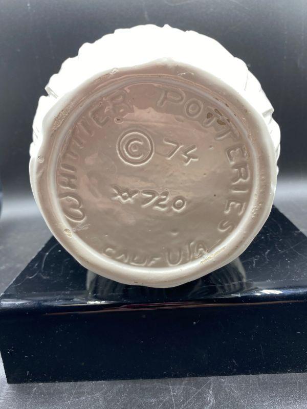 White planter with an embossed layered leaf design to it. Signed on the bottom, Whittier Potteries 1974. Previously used as a planter. No chips. Stands 6.5".