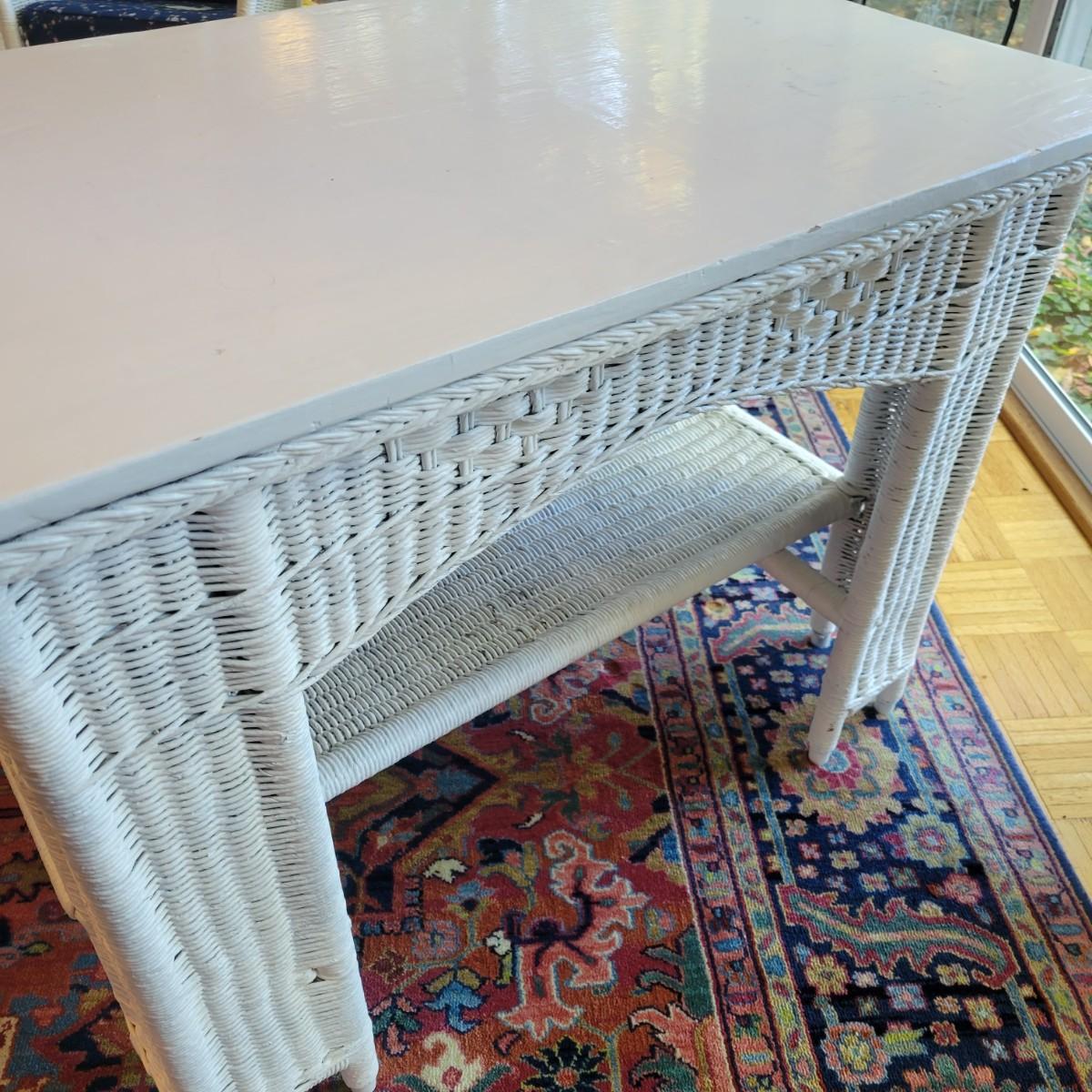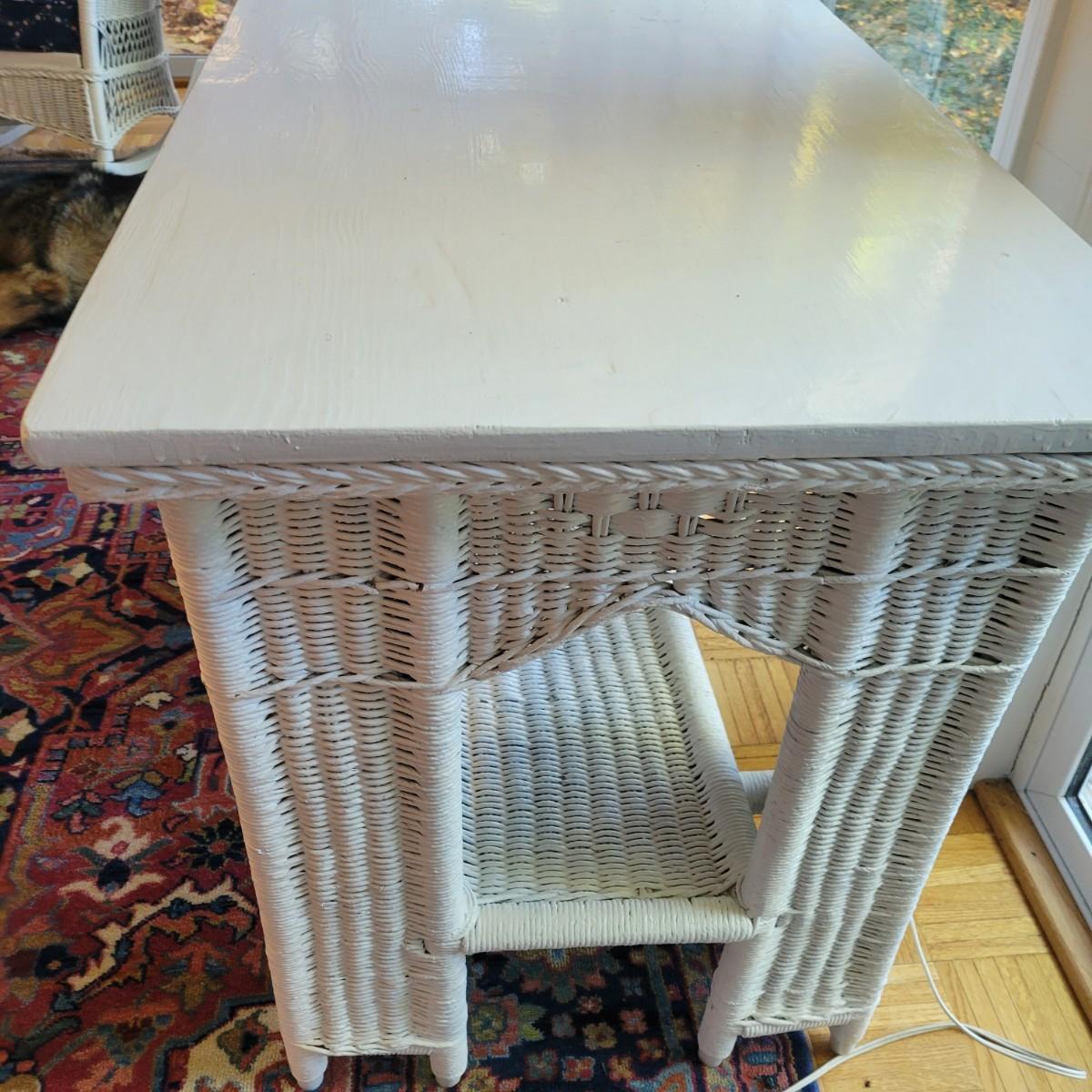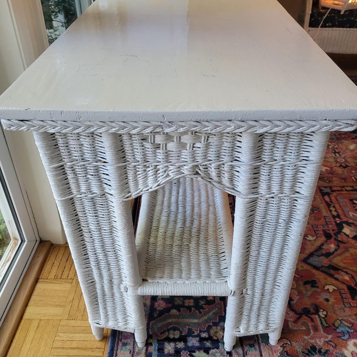 A white wicker bar table in good condition with a minor amount of paint missing, but all wicker is intact. This piece features a wooden top and lower shelf. It could also be used as a high top table. Measures approximately 40" x 24.5" x 30". Winning bidder will need to bring assistance to move and load as this piece is bulky and will go up a flight of stairs. Local pickup only