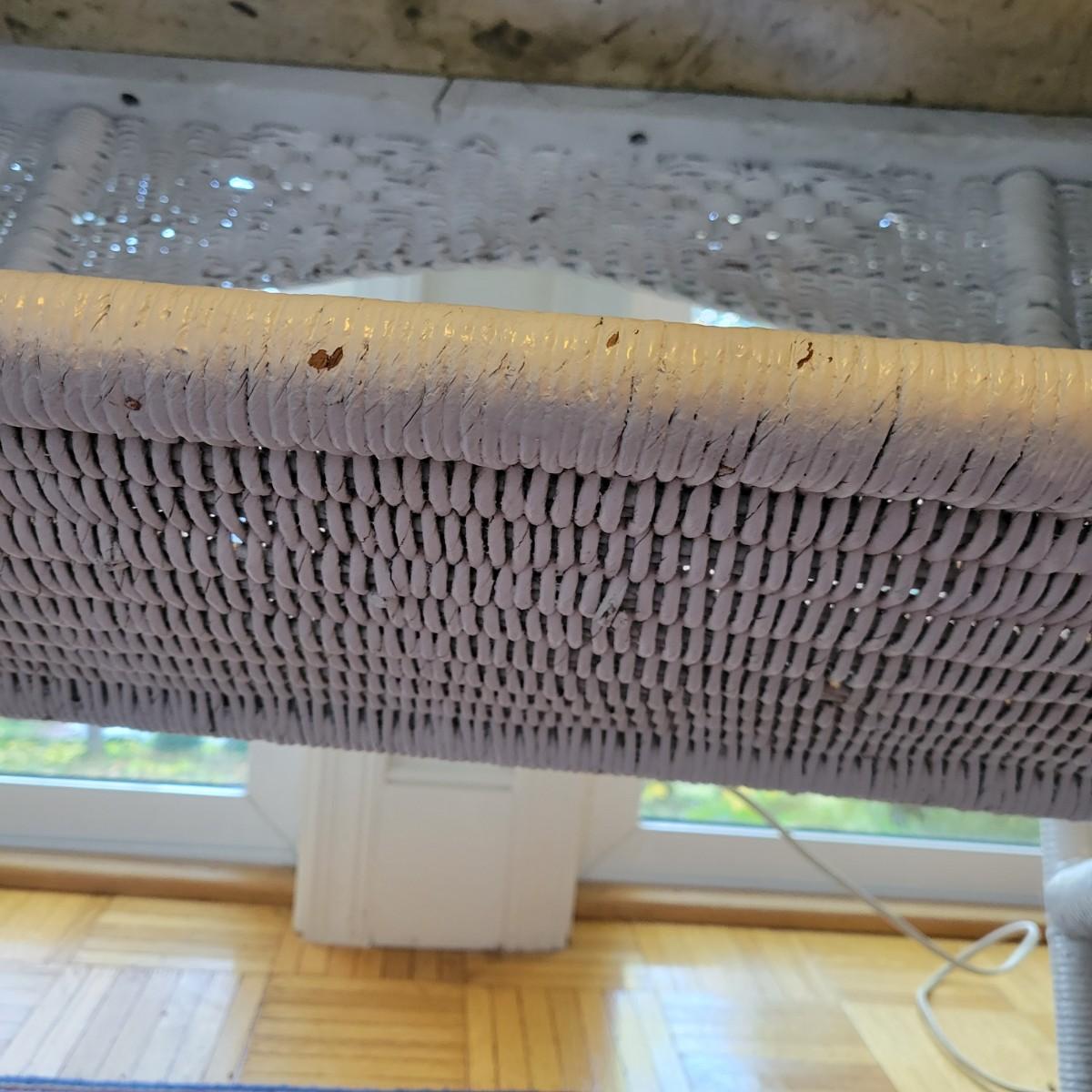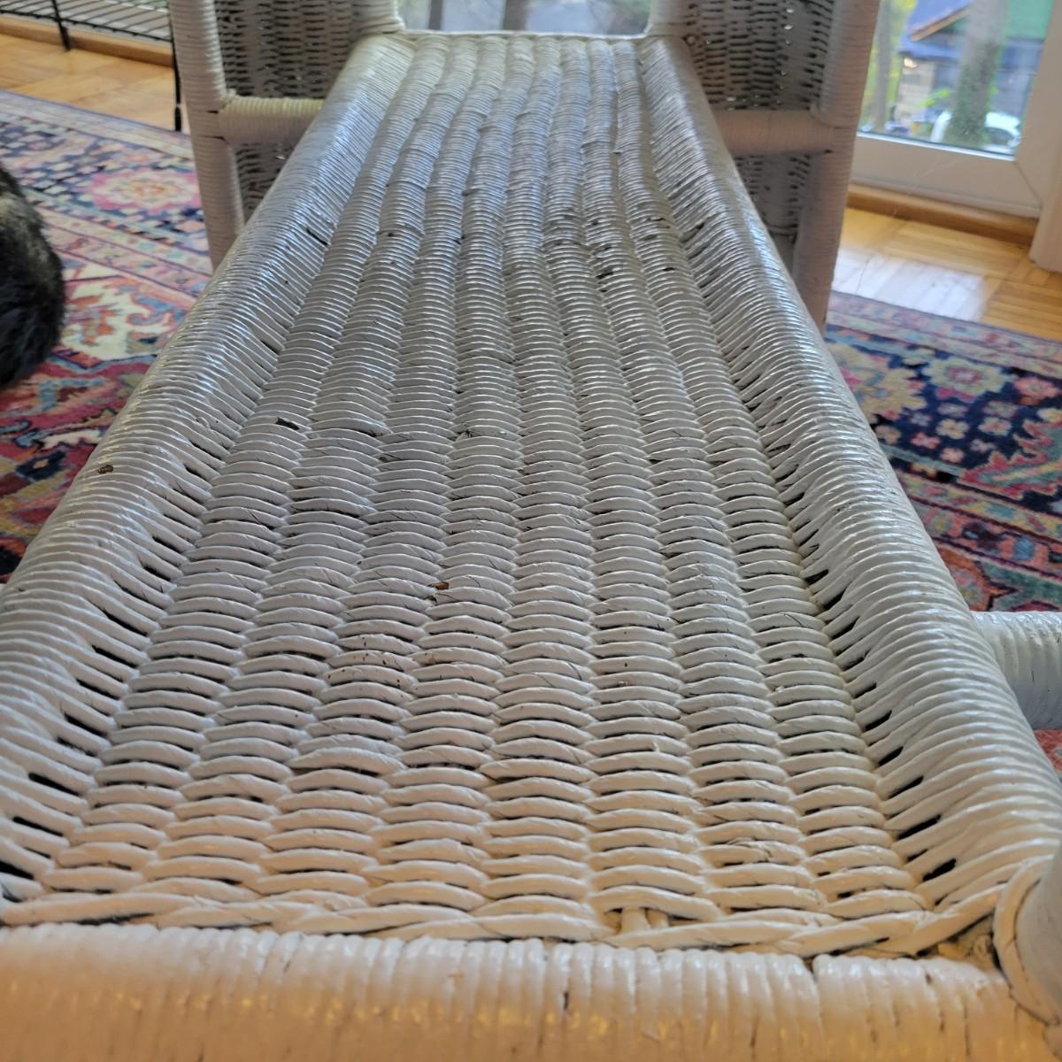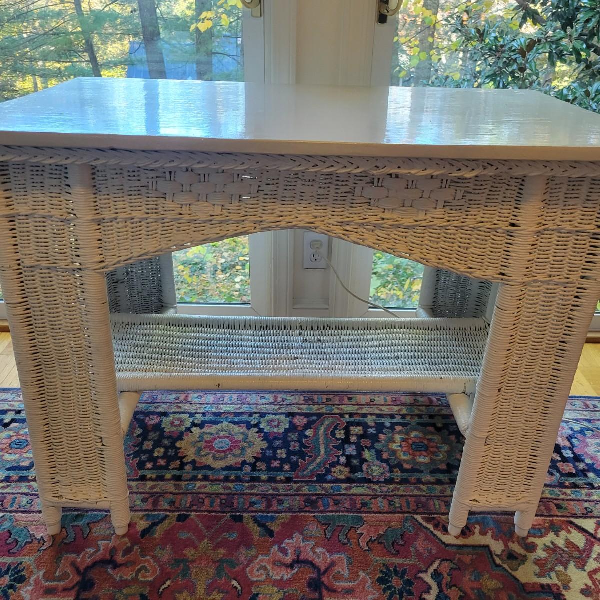 A white wicker bar table in good condition with a minor amount of paint missing, but all wicker is intact. This piece features a wooden top and lower shelf. It could also be used as a high top table. Measures approximately 40" x 24.5" x 30". Winning bidder will need to bring assistance to move and load as this piece is bulky and will go up a flight of stairs. Local pickup only