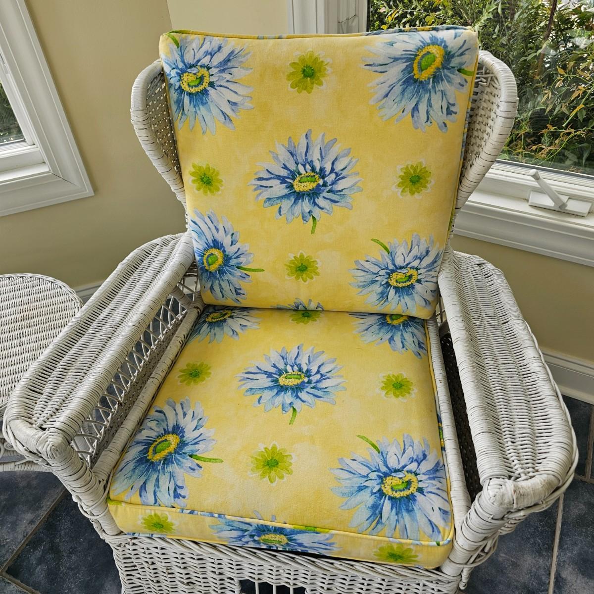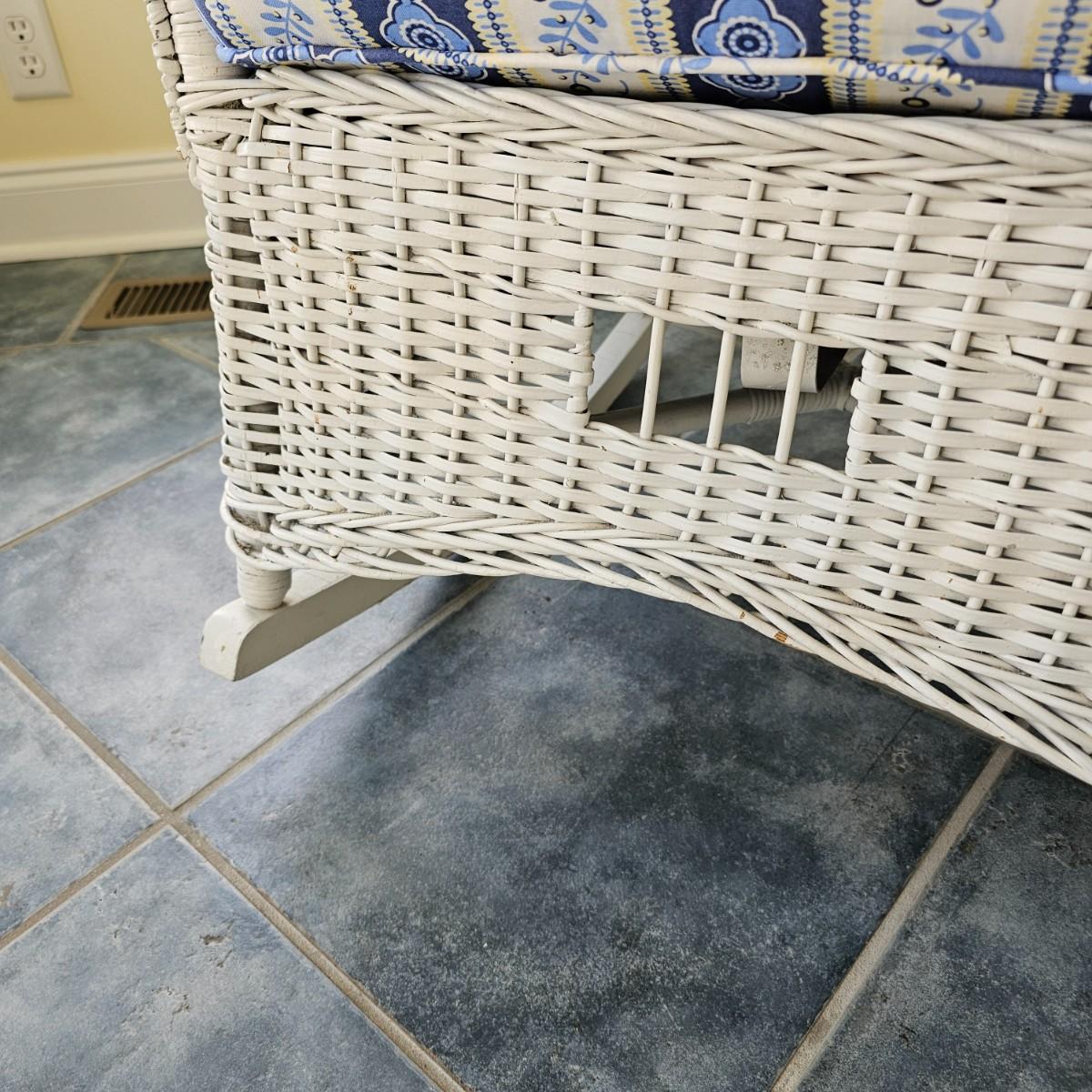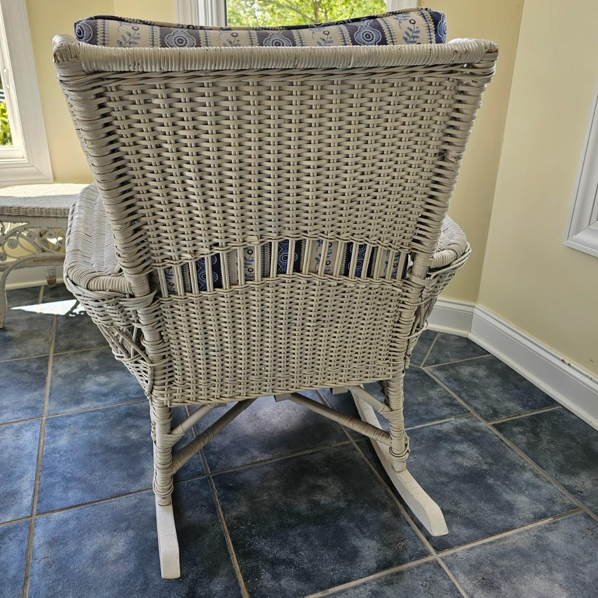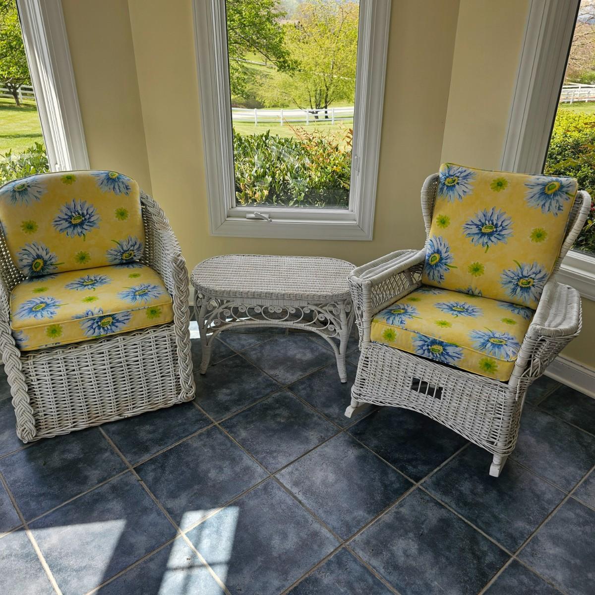 Solid white wicker ensemble of rocker, pedestal chair and side table. Pedestal chair measures 30" x 27" x 33"H, has 18" seat height. Rocker is 31" x 31" x 34"H, 19" seat height. Table is 15" x 30" x 17"H. Two sets of cushions, one set blue/ white pattern, the other set yellow with cheery flowers. Some scratched paint on lower parts of items, and tops of blue cushions are sun faded. See photos for details. Local pickup only.