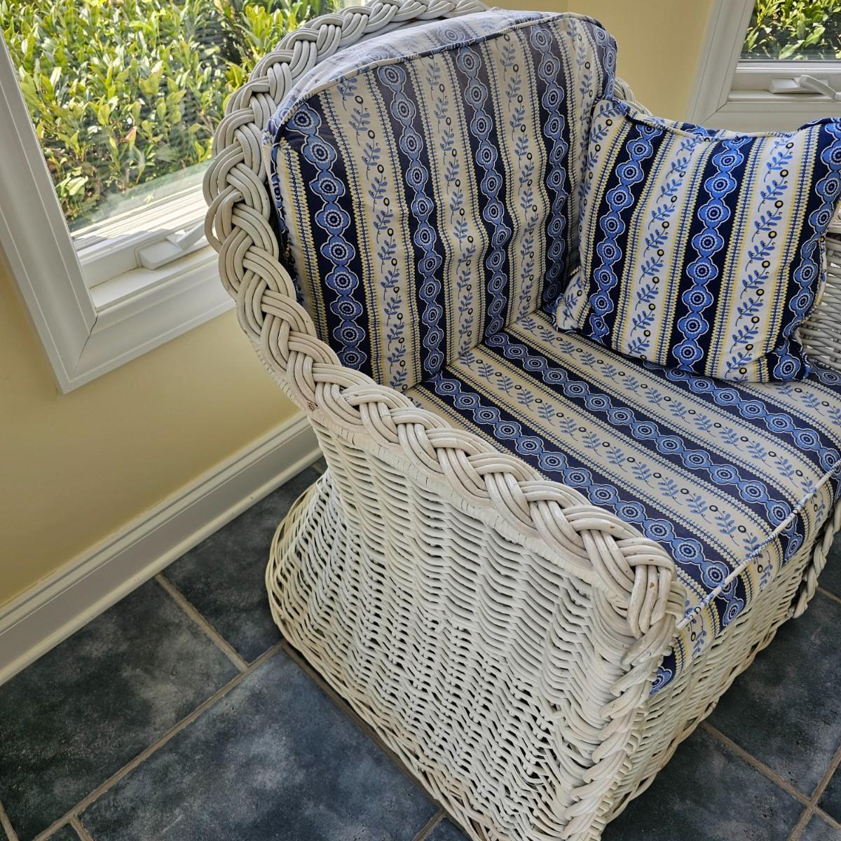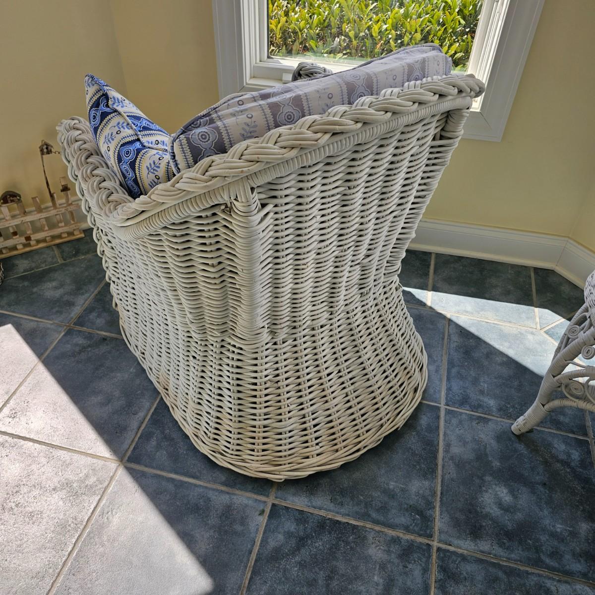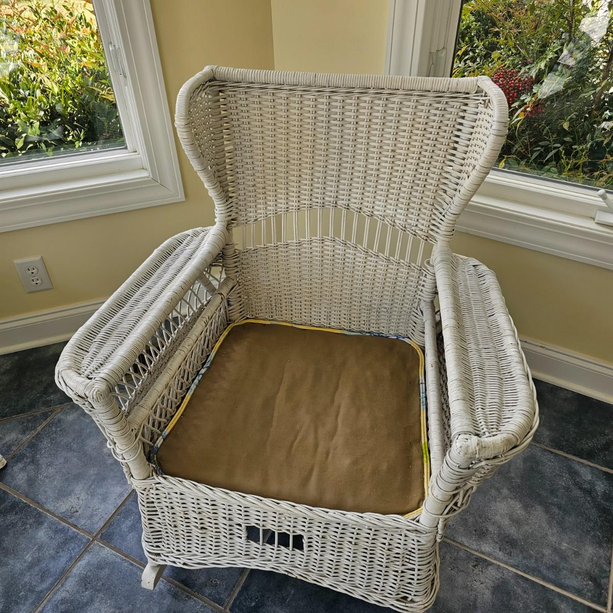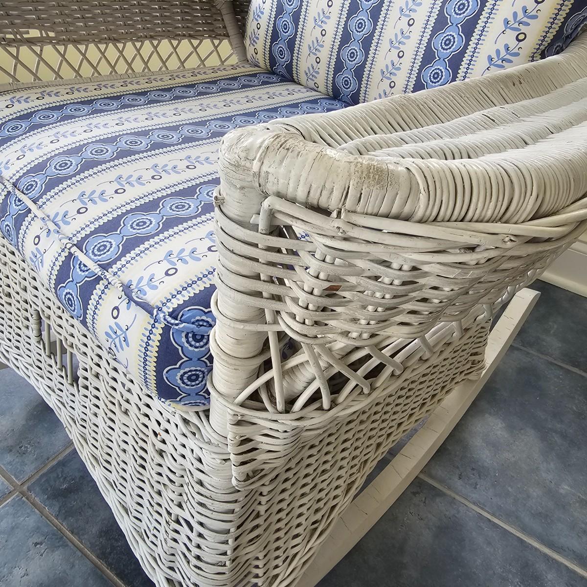 Solid white wicker ensemble of rocker, pedestal chair and side table. Pedestal chair measures 30" x 27" x 33"H, has 18" seat height. Rocker is 31" x 31" x 34"H, 19" seat height. Table is 15" x 30" x 17"H. Two sets of cushions, one set blue/ white pattern, the other set yellow with cheery flowers. Some scratched paint on lower parts of items, and tops of blue cushions are sun faded. See photos for details. Local pickup only.