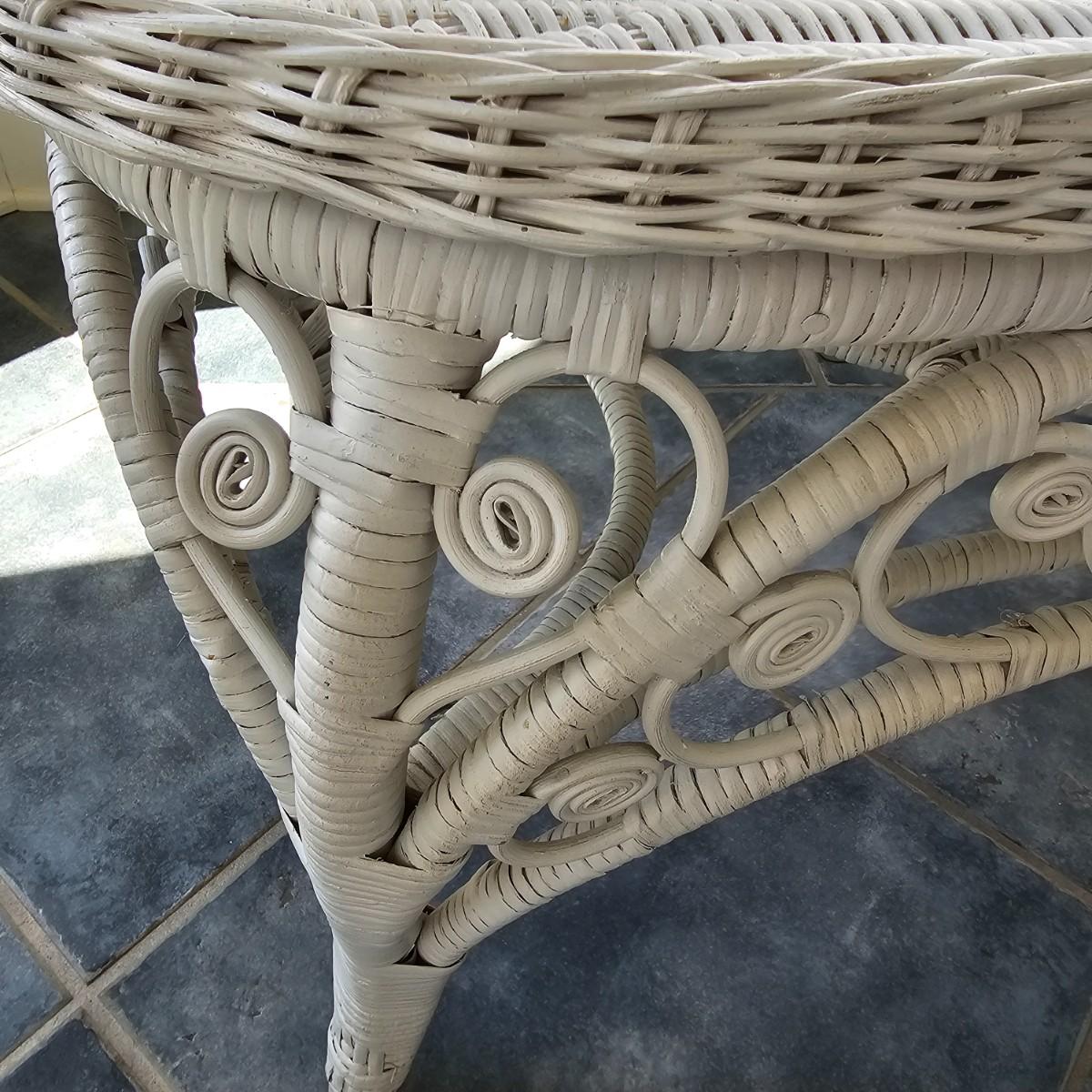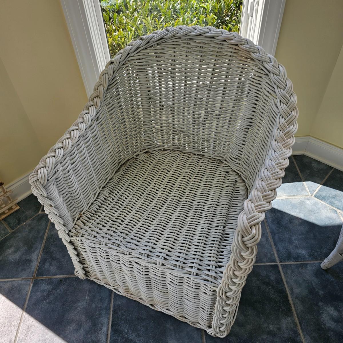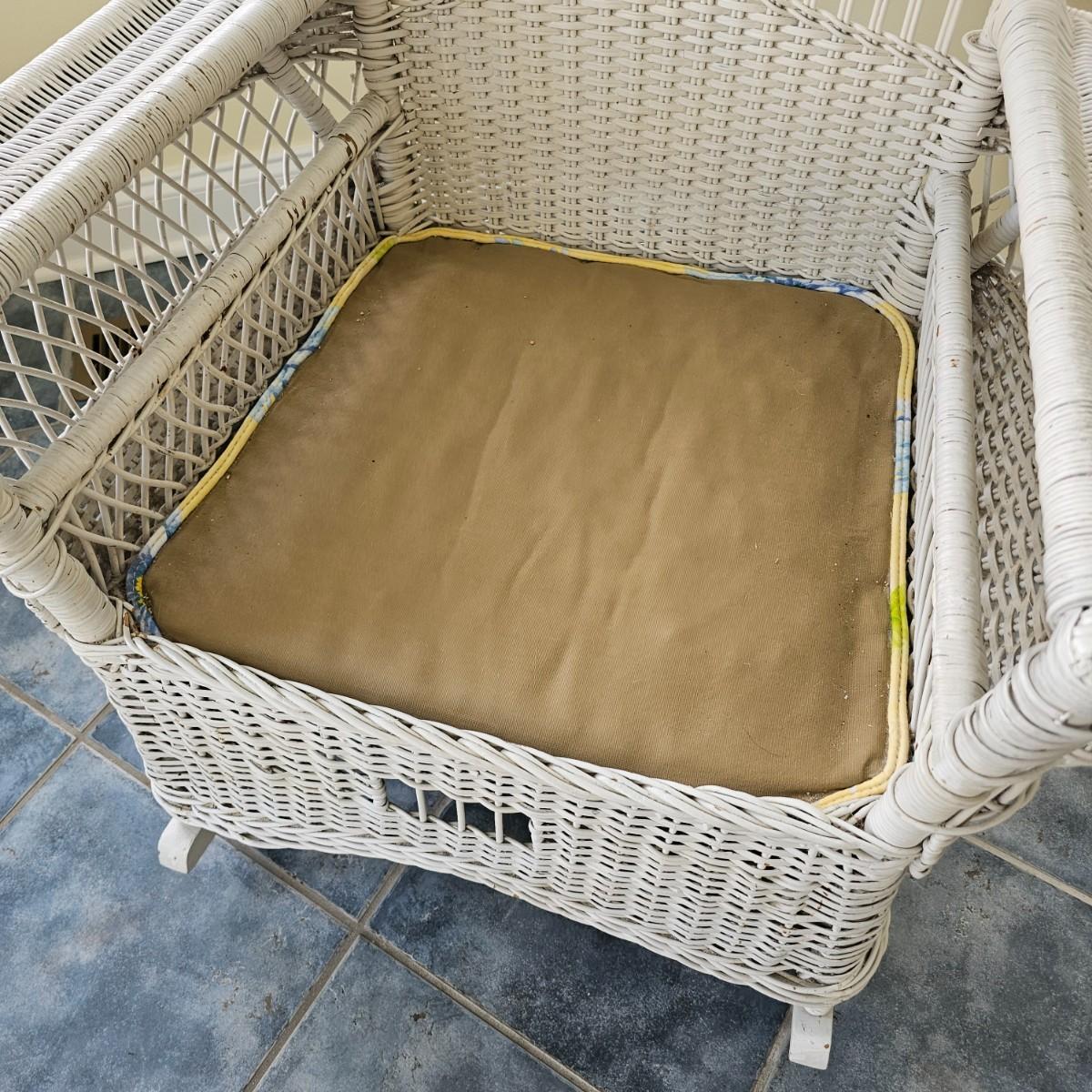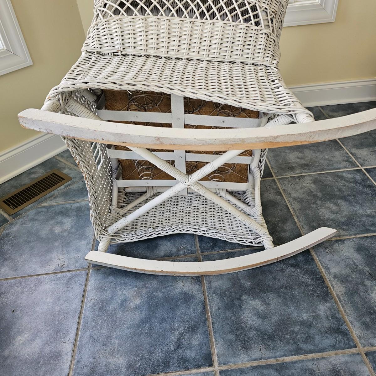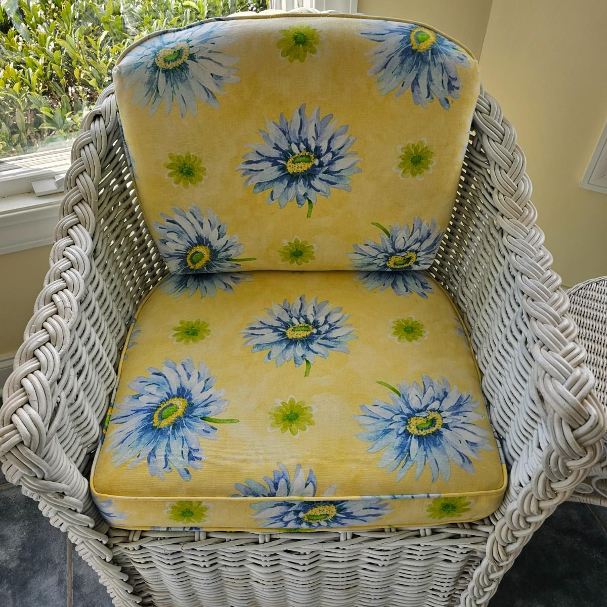 Solid white wicker ensemble of rocker, pedestal chair and side table. Pedestal chair measures 30" x 27" x 33"H, has 18" seat height. Rocker is 31" x 31" x 34"H, 19" seat height. Table is 15" x 30" x 17"H. Two sets of cushions, one set blue/ white pattern, the other set yellow with cheery flowers. Some scratched paint on lower parts of items, and tops of blue cushions are sun faded. See photos for details. Local pickup only.