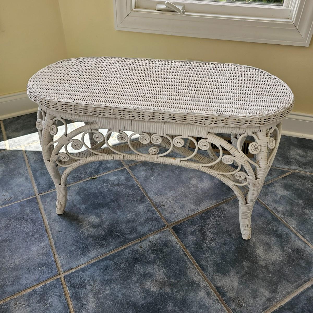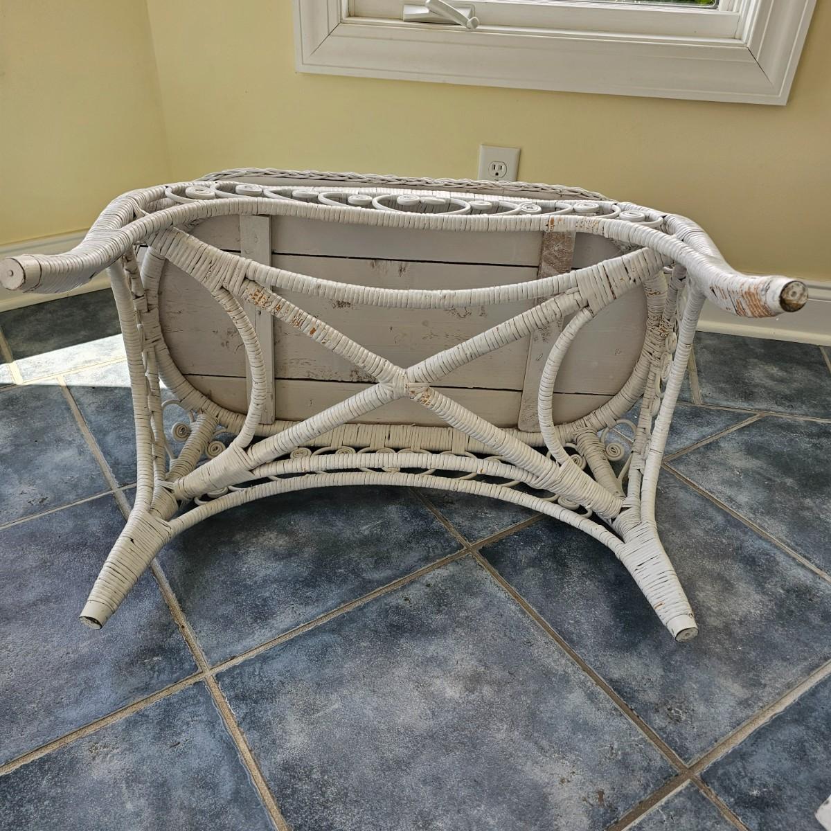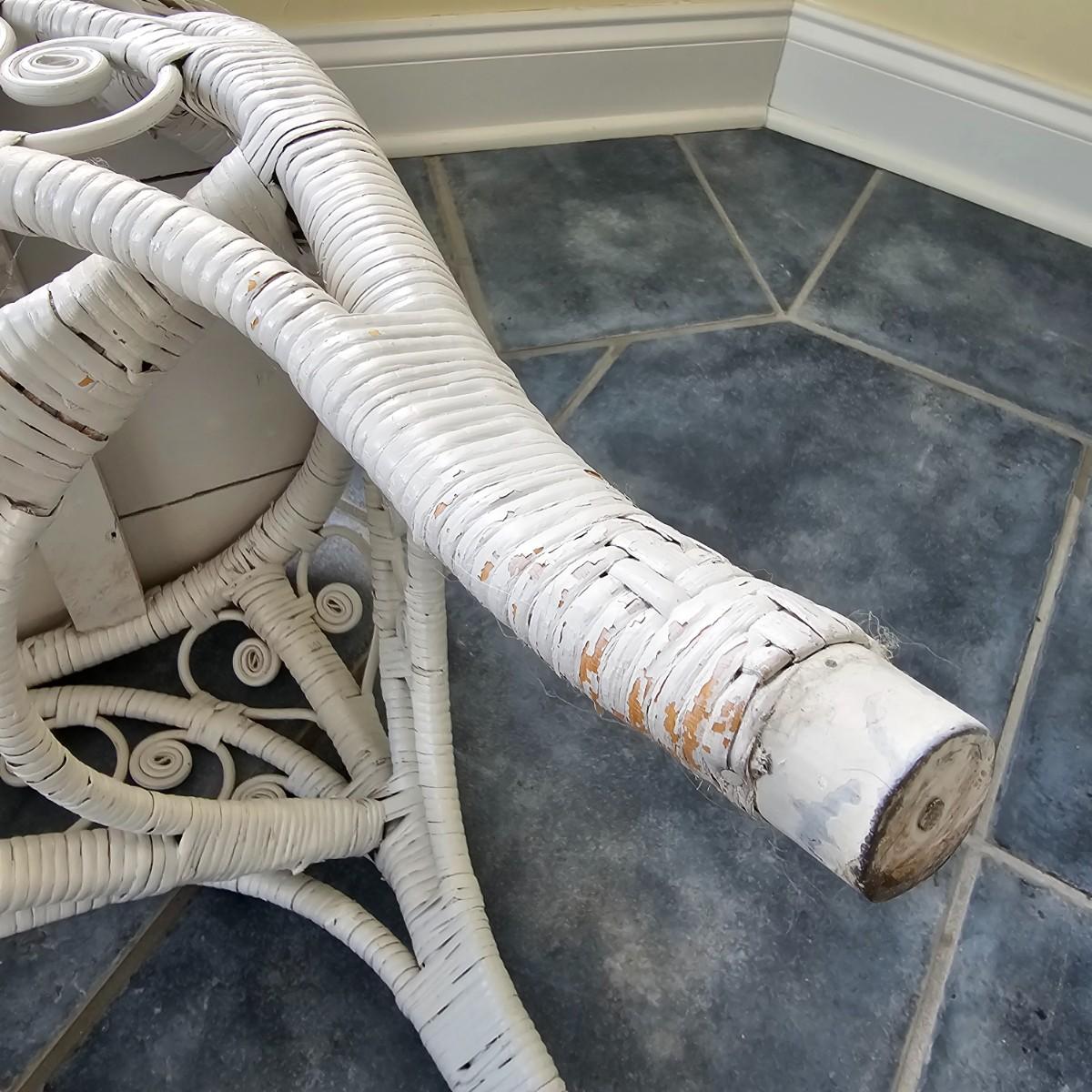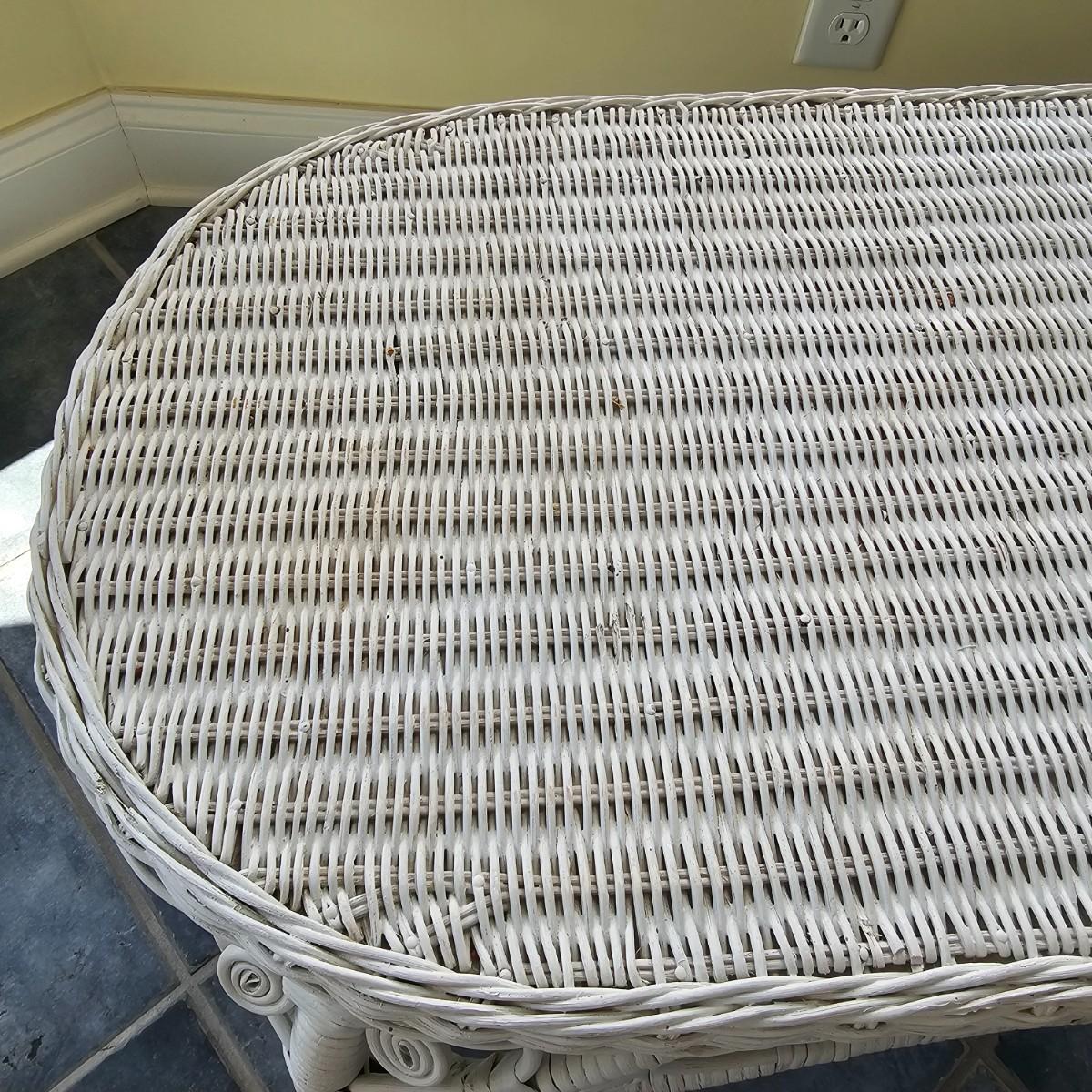Solid white wicker ensemble of rocker, pedestal chair and side table. Pedestal chair measures 30" x 27" x 33"H, has 18" seat height. Rocker is 31" x 31" x 34"H, 19" seat height. Table is 15" x 30" x 17"H. Two sets of cushions, one set blue/ white pattern, the other set yellow with cheery flowers. Some scratched paint on lower parts of items, and tops of blue cushions are sun faded. See photos for details. Local pickup only.