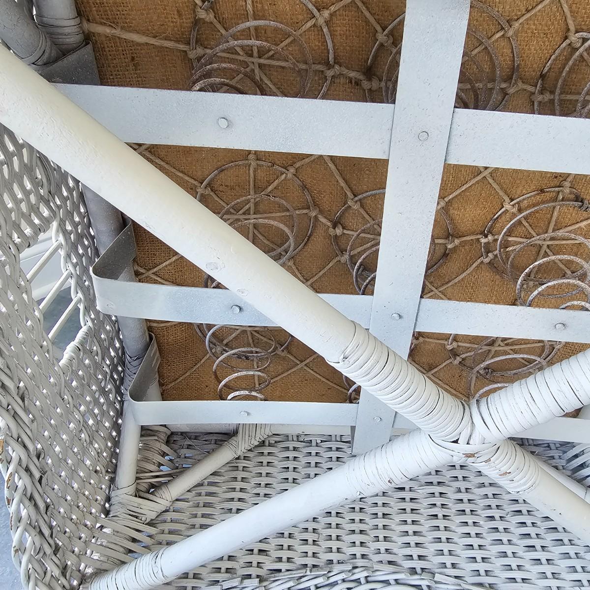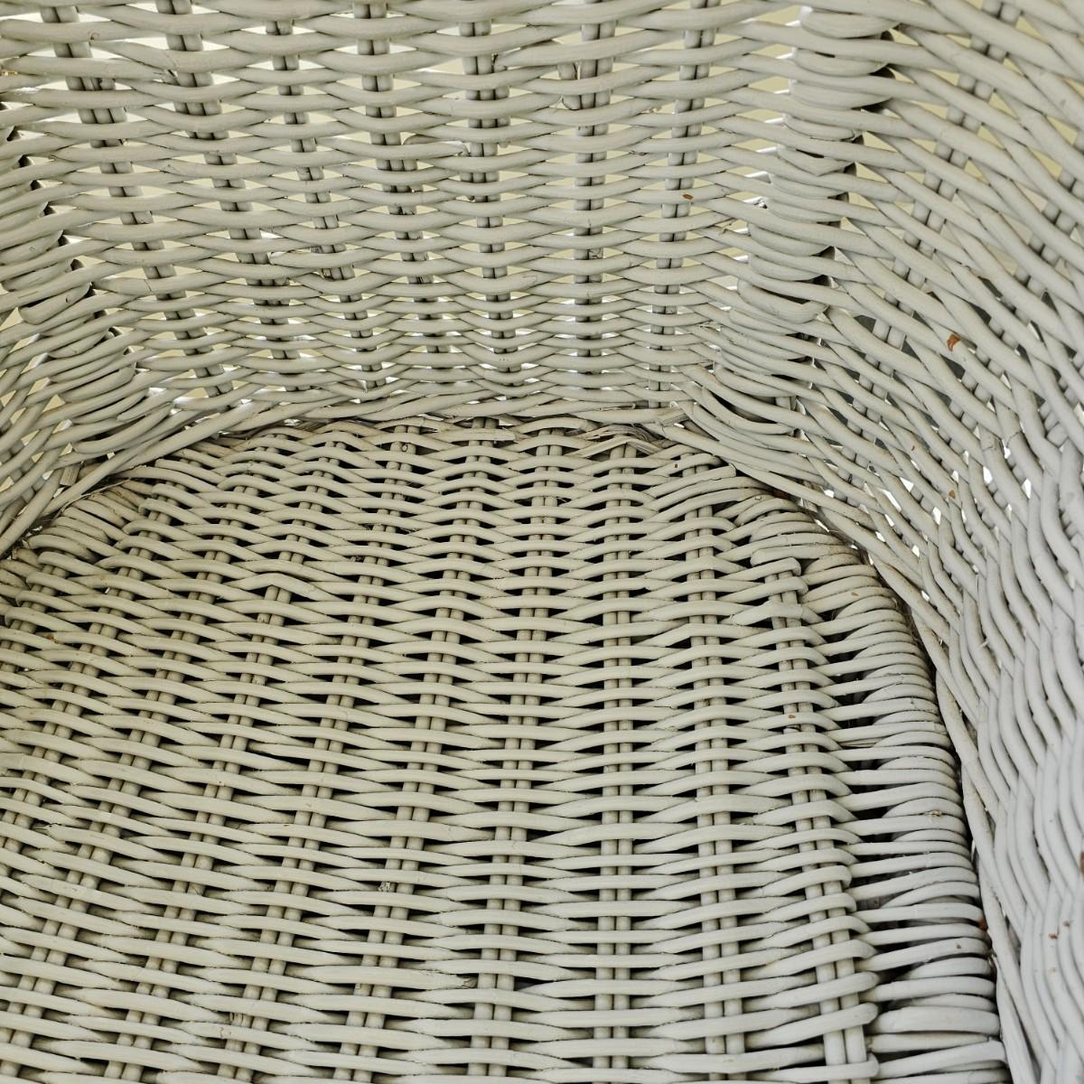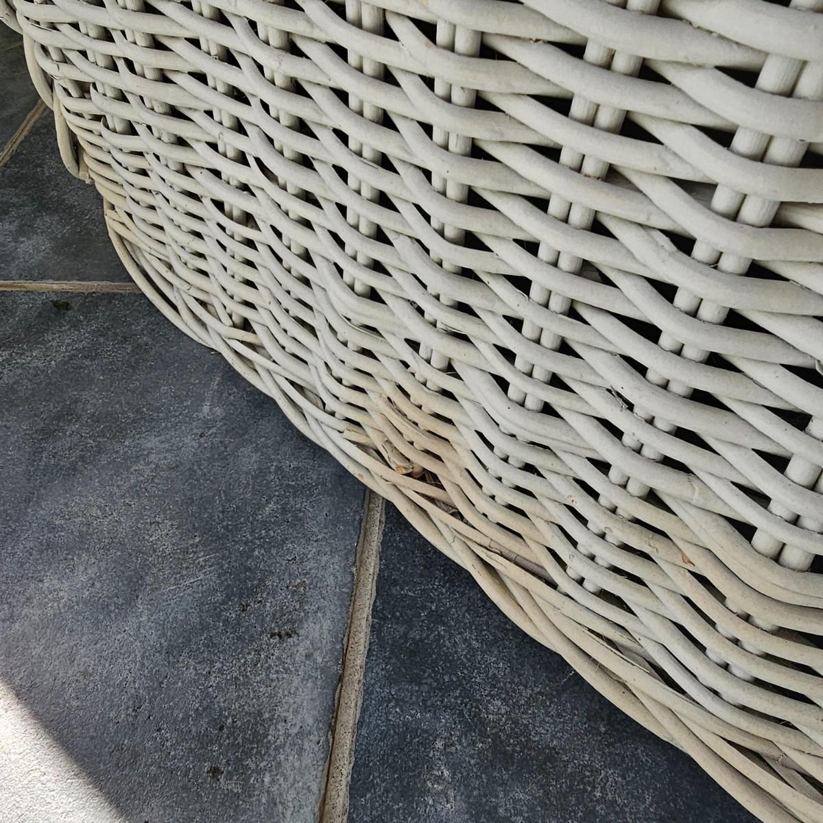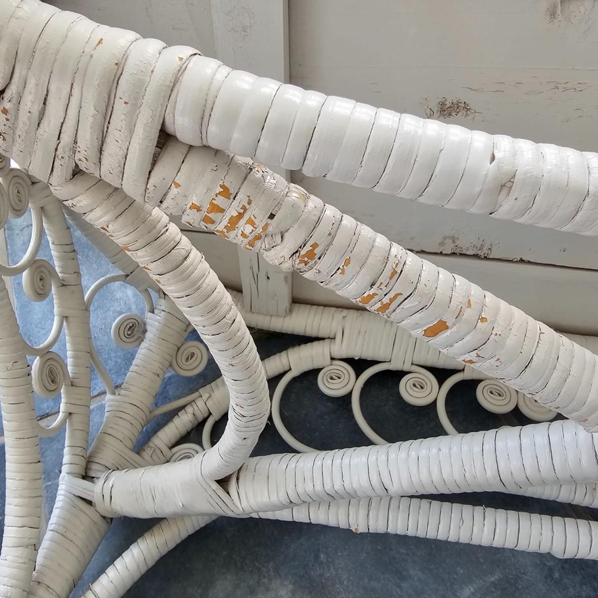 Solid white wicker ensemble of rocker, pedestal chair and side table. Pedestal chair measures 30" x 27" x 33"H, has 18" seat height. Rocker is 31" x 31" x 34"H, 19" seat height. Table is 15" x 30" x 17"H. Two sets of cushions, one set blue/ white pattern, the other set yellow with cheery flowers. Some scratched paint on lower parts of items, and tops of blue cushions are sun faded. See photos for details. Local pickup only.