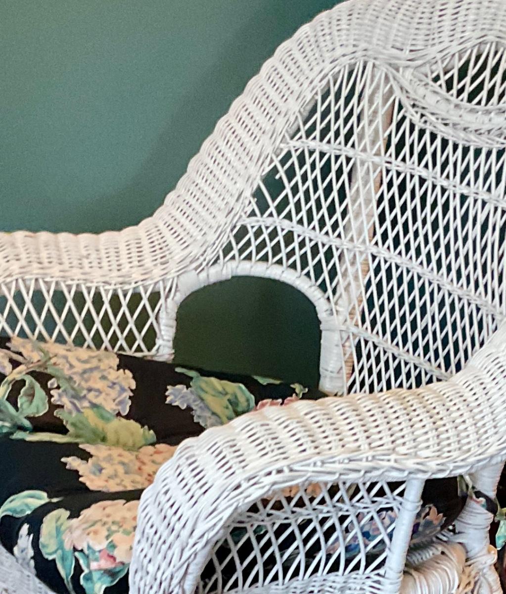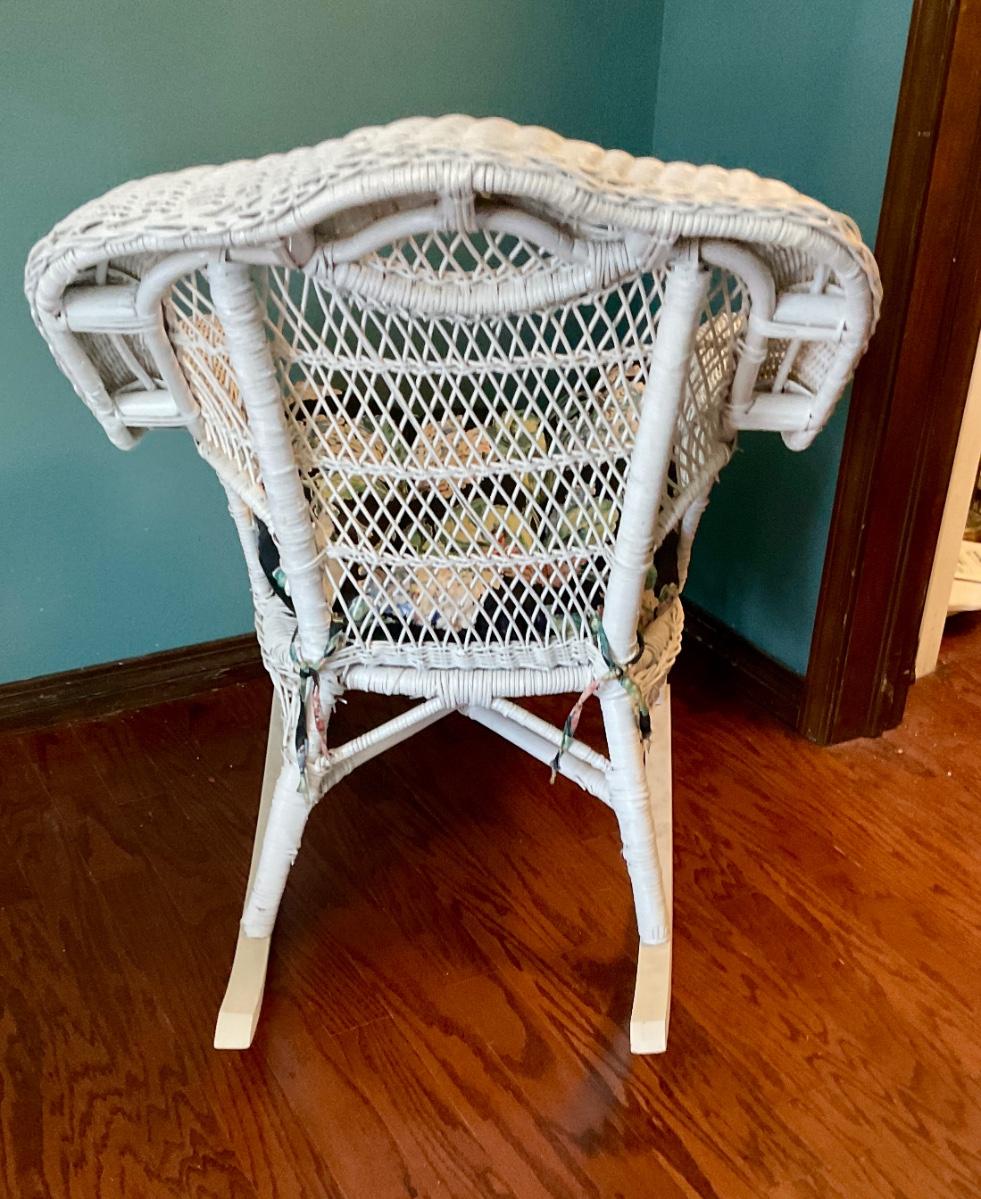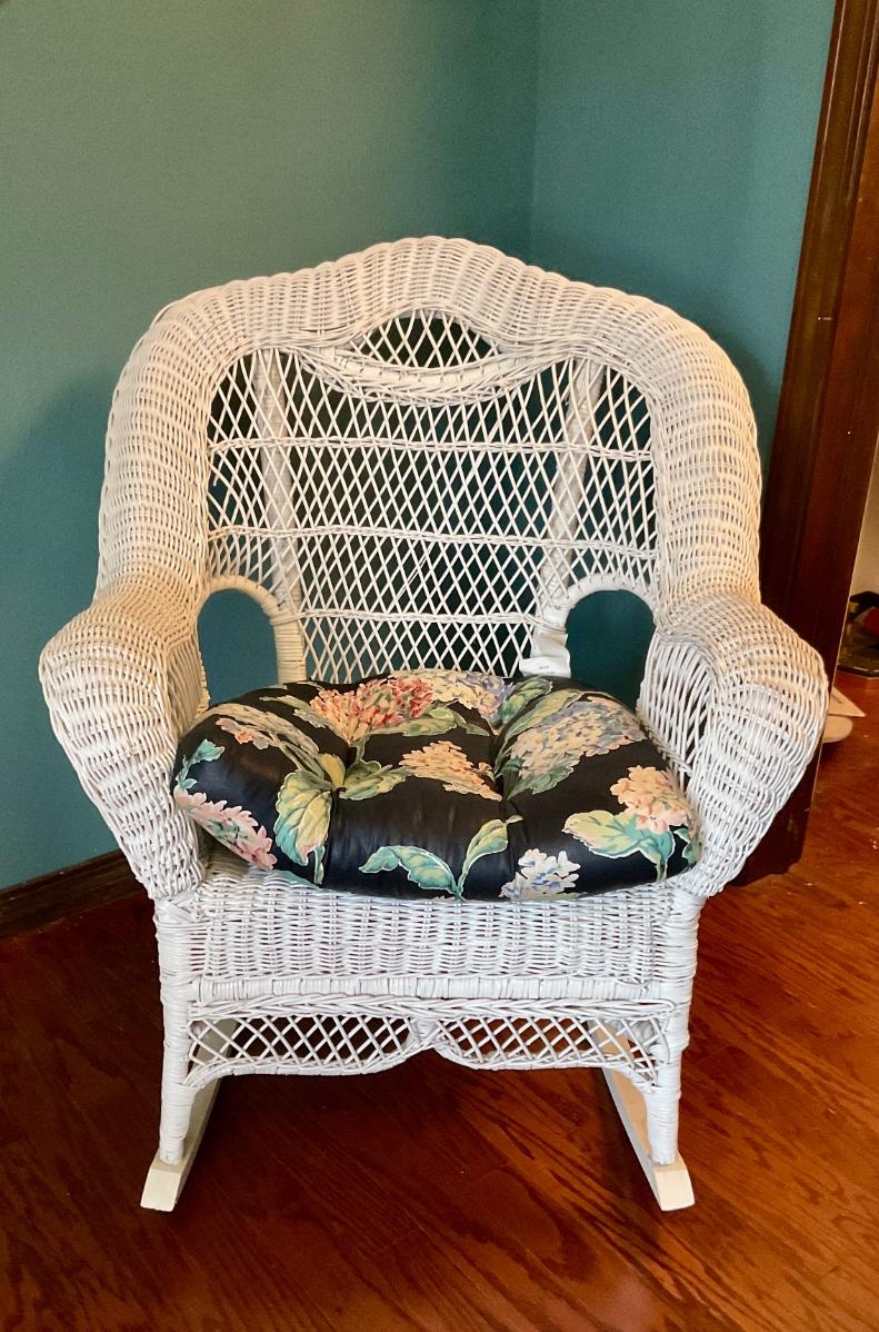 White wicker rocking chair, has floral cushion, some damage shown in pictures