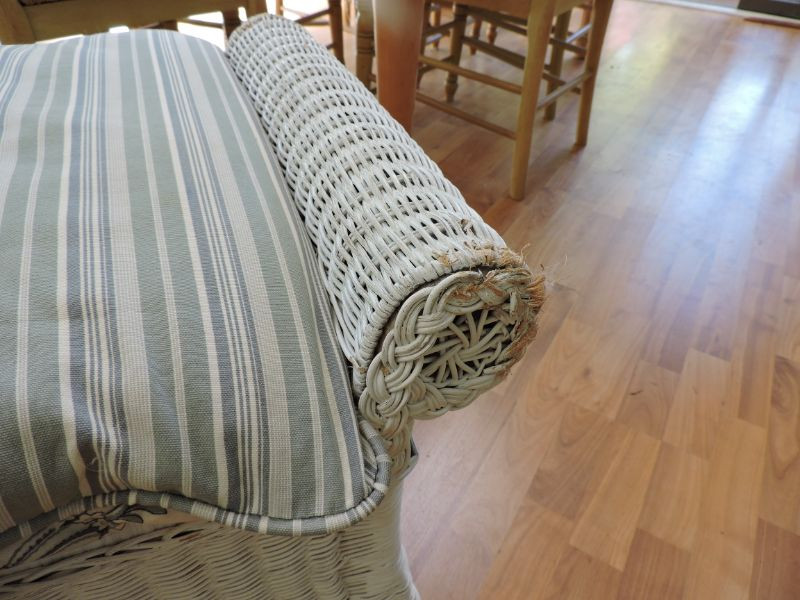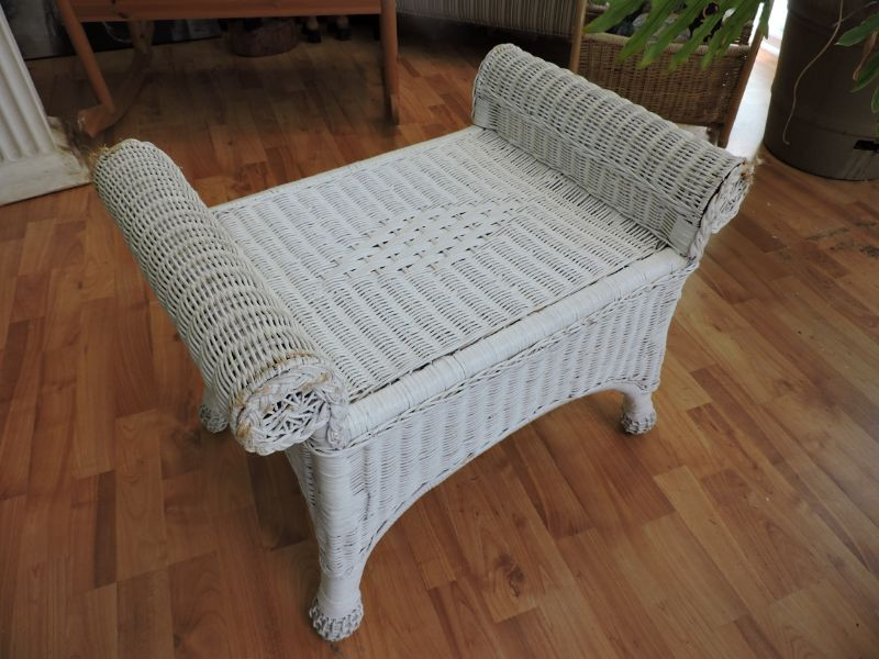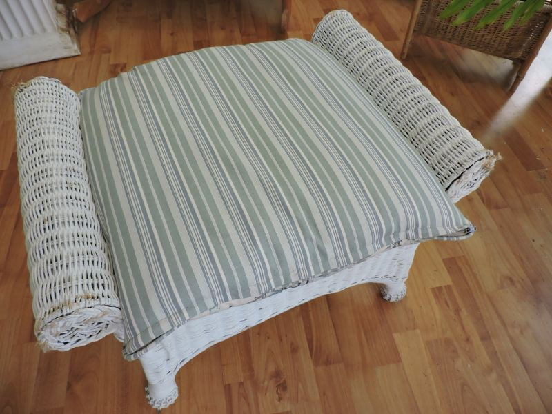Distressed white wicker stool with stiped blue/grey/cream/green zippered cushion (fabric matches the extra-large armchair in this auction). 24”x17”x19”