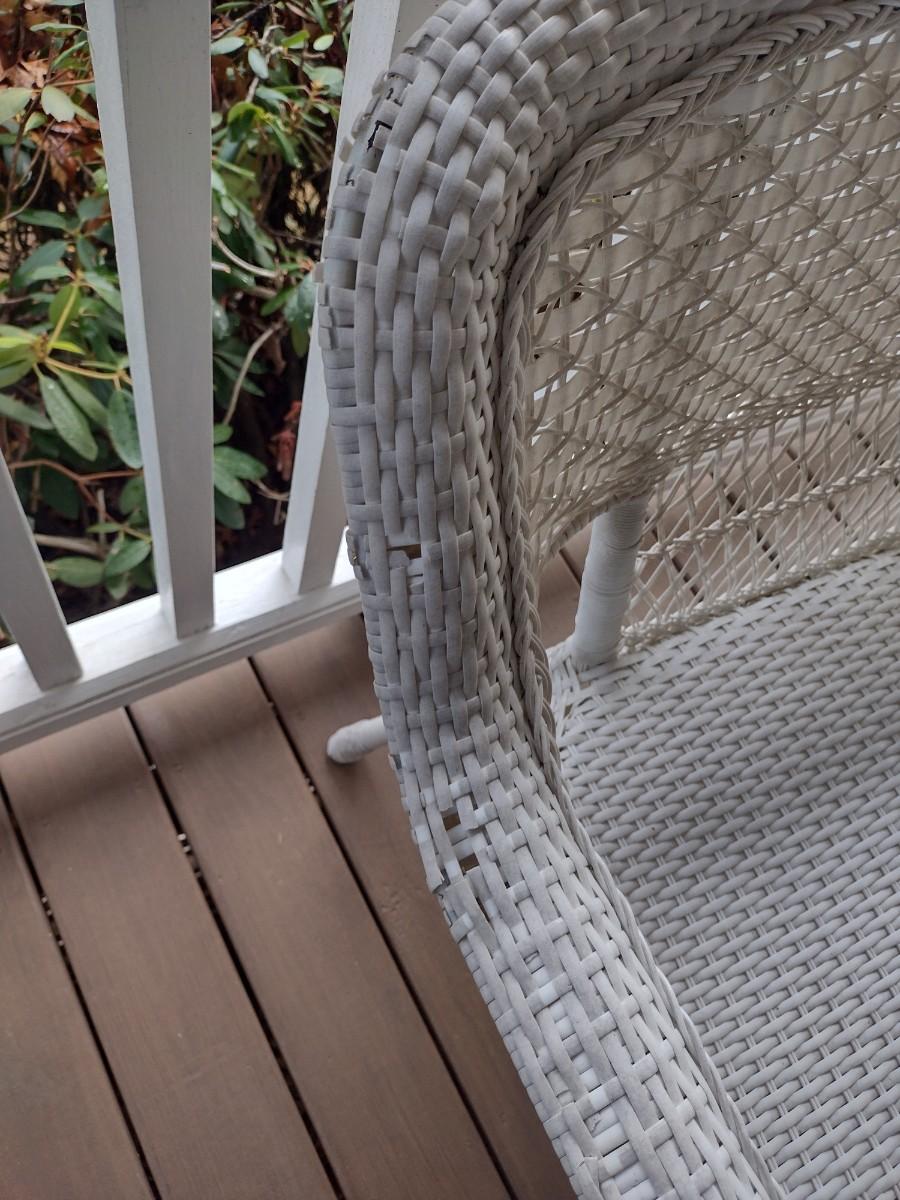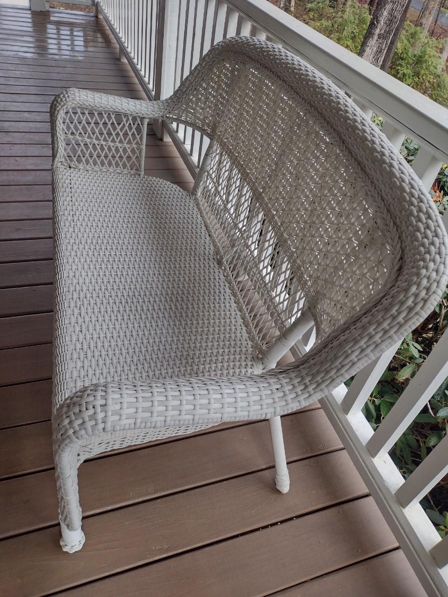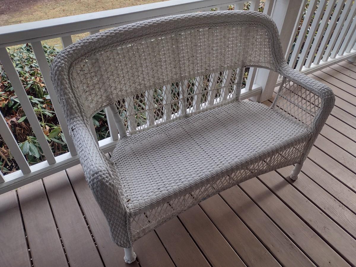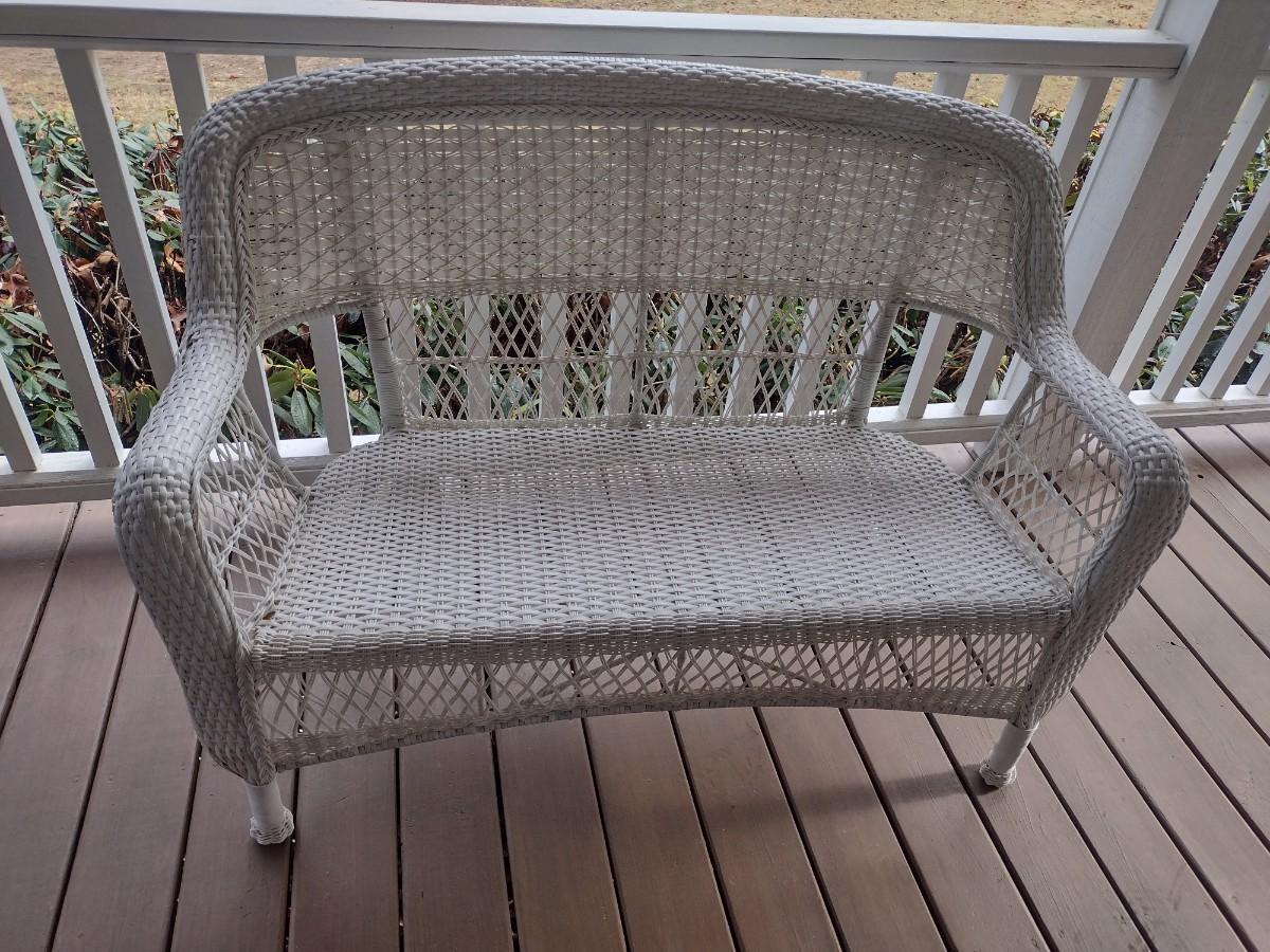 White Wicker Weave Outdoor Patio Loveseat. See photos for possible damage or condition issues.
