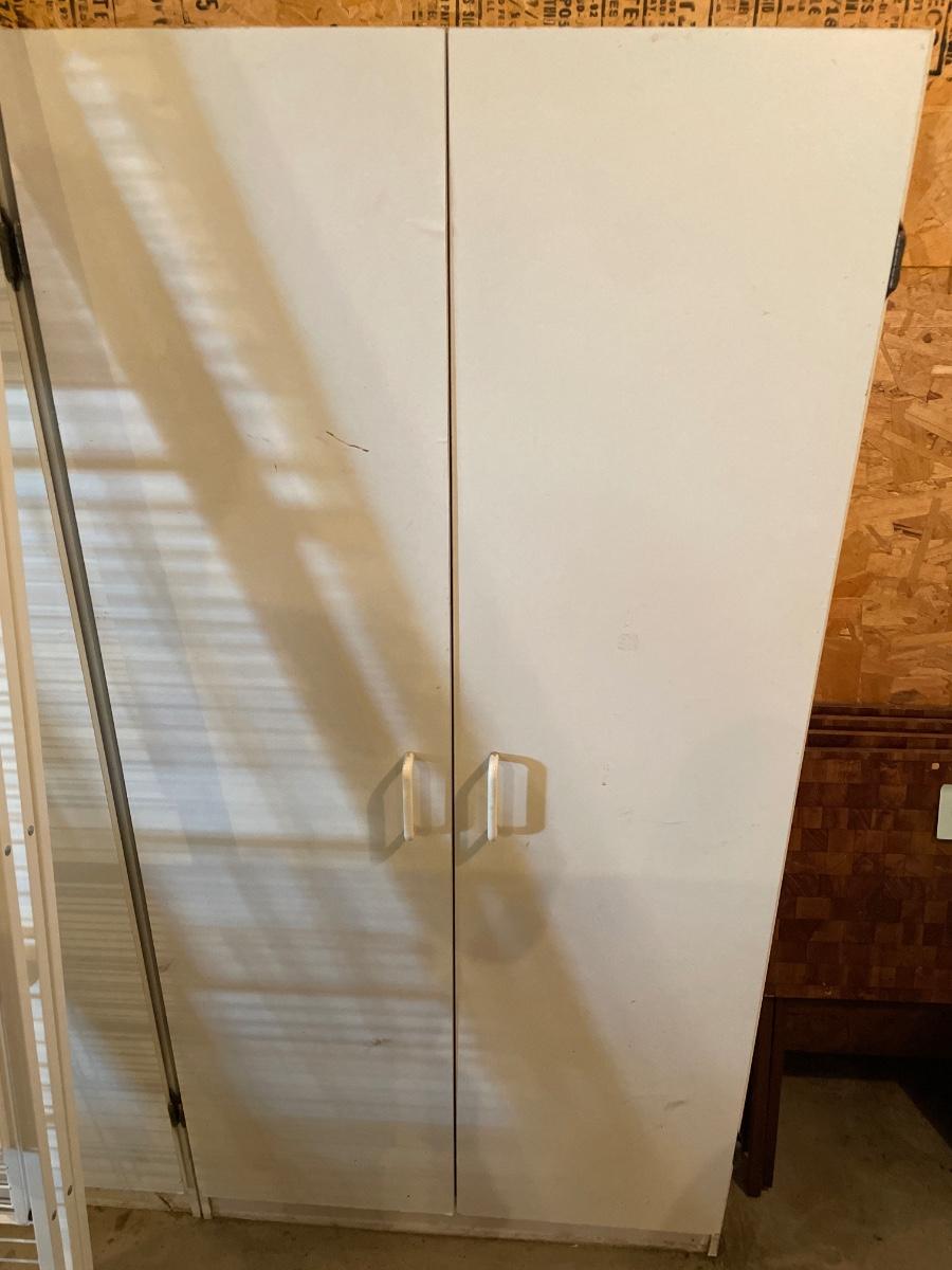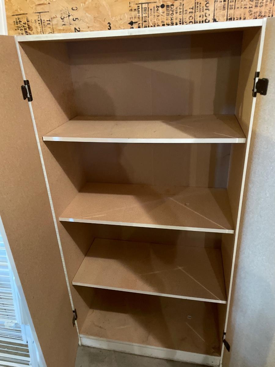 White wood shelving unit. Dimensions are 60 inches tall by 30 inches wide by 16 inches deep