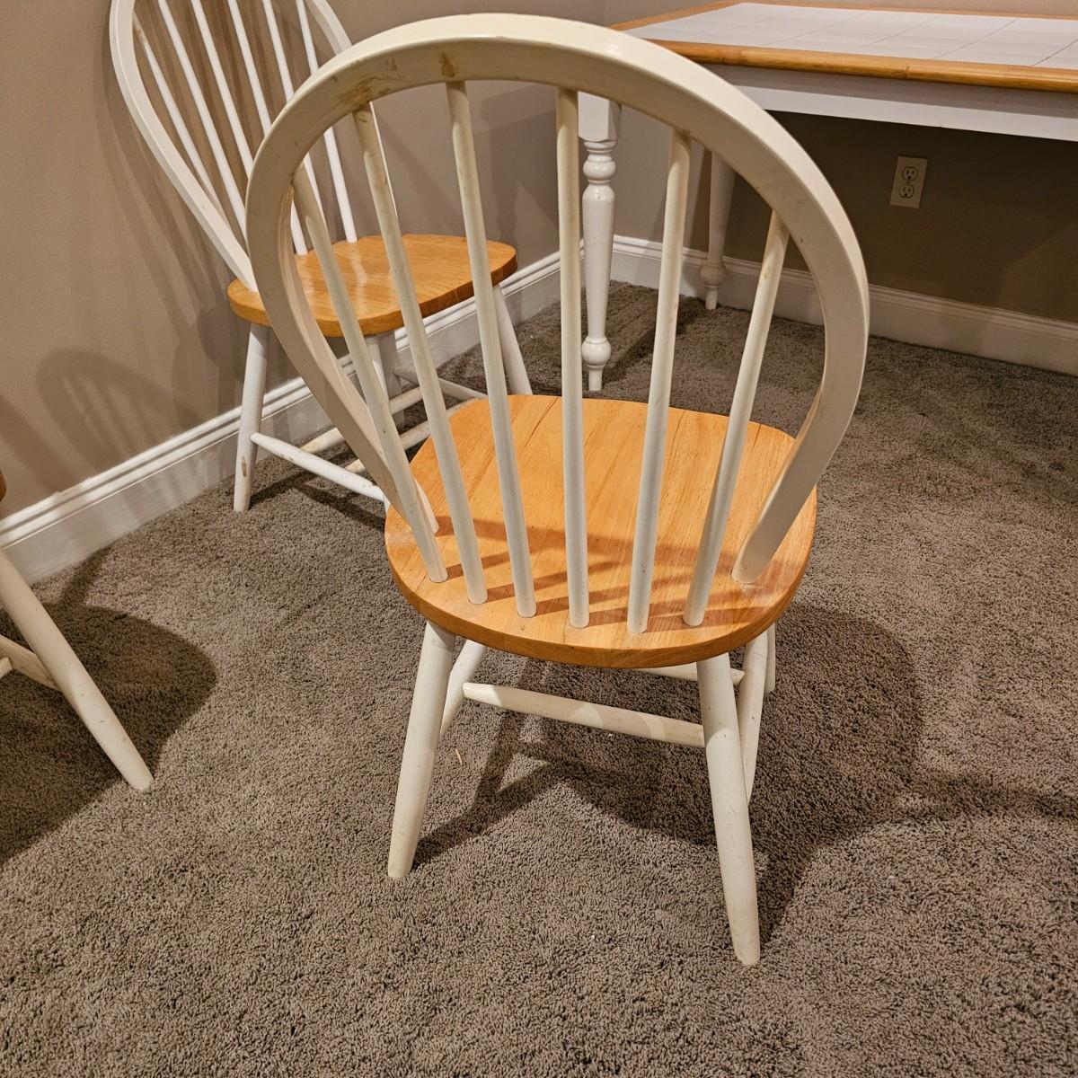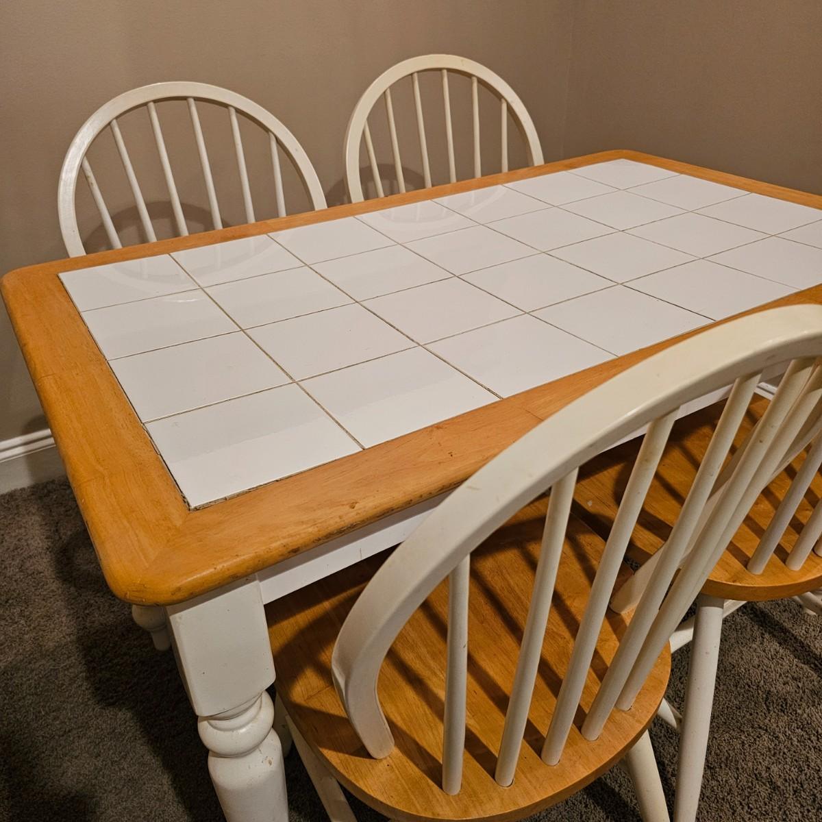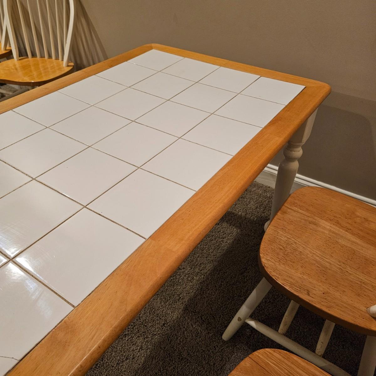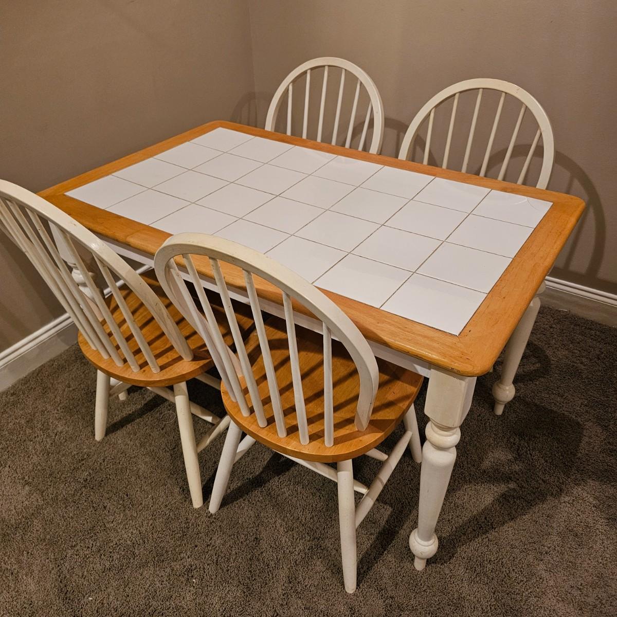 Rectangular table with white legs and blonde wood top edge. Center is white tile squares; one corner tile has chip in it. Table measures 47" x 29" x 29"H. Four matching chairs have white backs and legs, blonde wood seats. Chairs are 17.5" x 18" x 36"H, with an 18" seat height. Table and chairs need some cleaning. See photos for details. Local pickup only. Winning bidder must bring assistance to help move and load this item due to its weight and/or size. This lot is located in the basement and will need to be either moved up a flight of stairs to the main level and then down a few stairs at the entry, or it can be moved out the back door of the basement and carried up an incline on the side of the house.