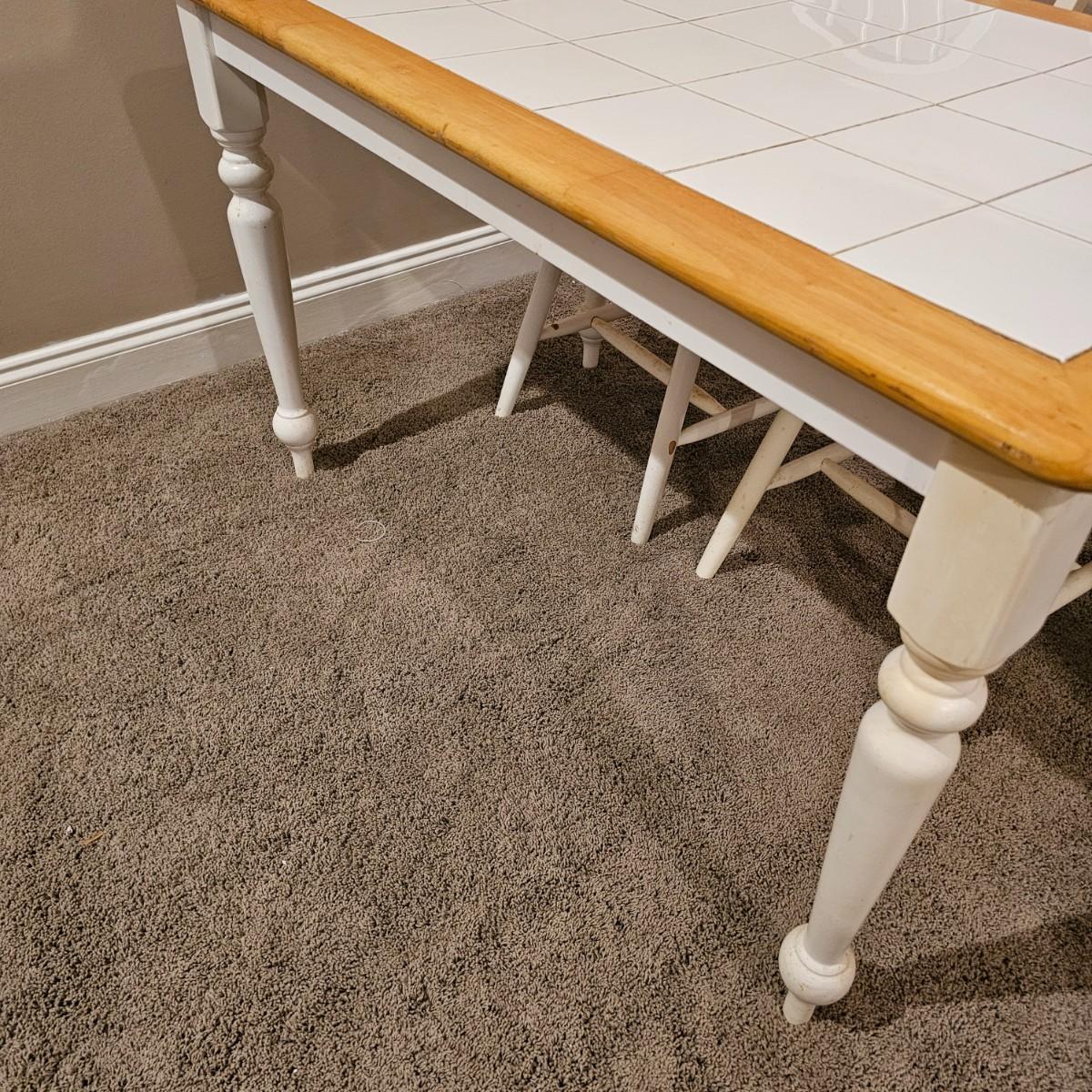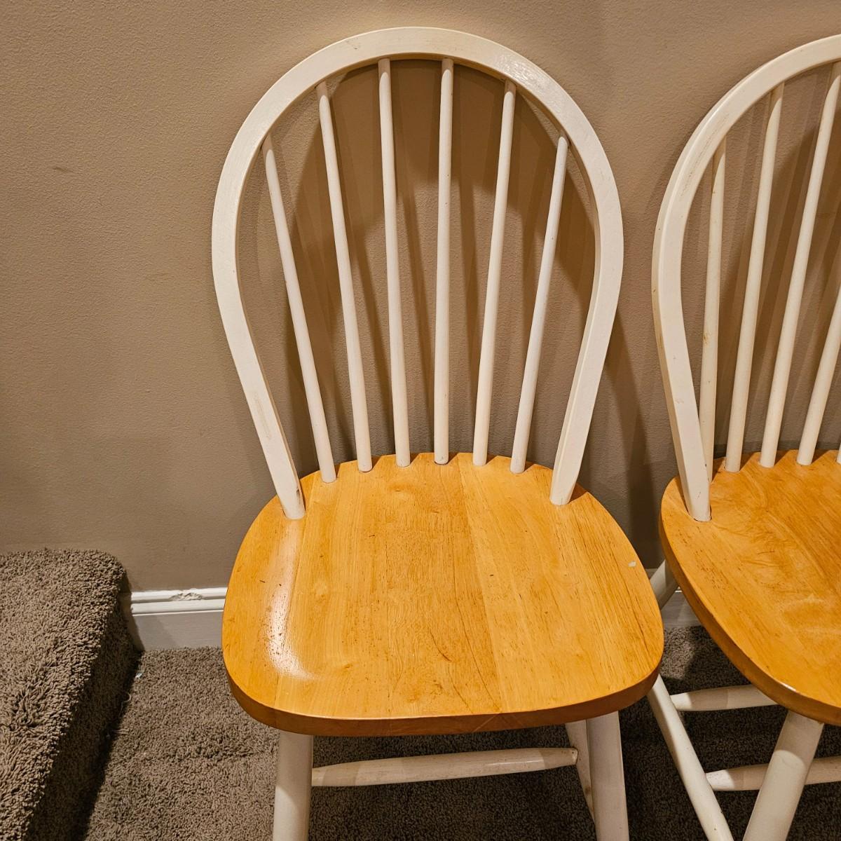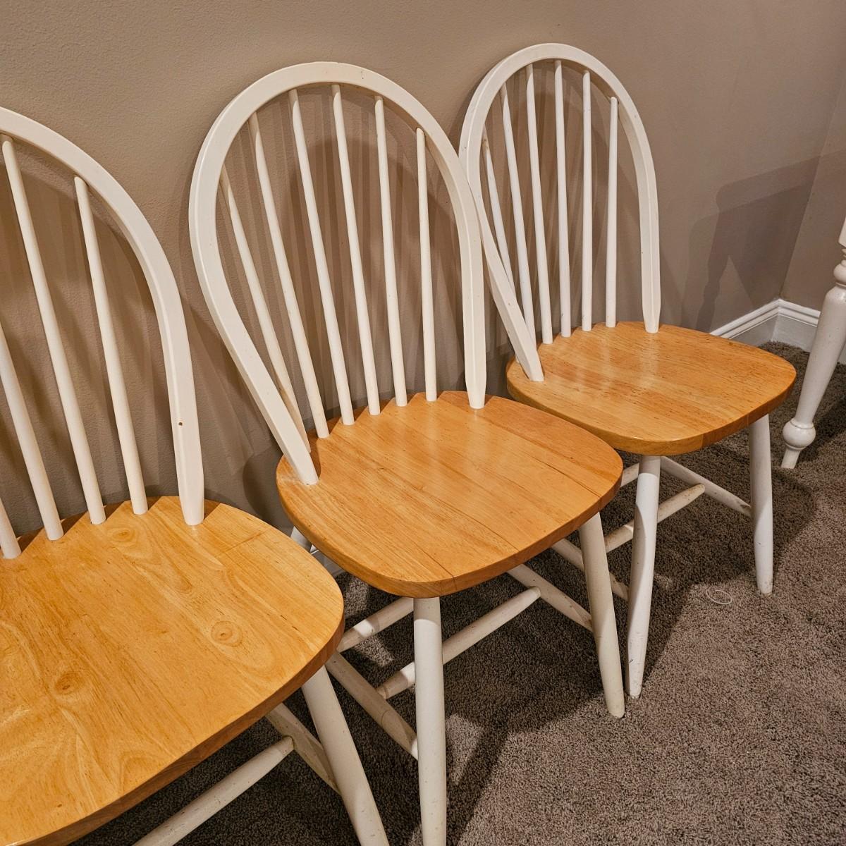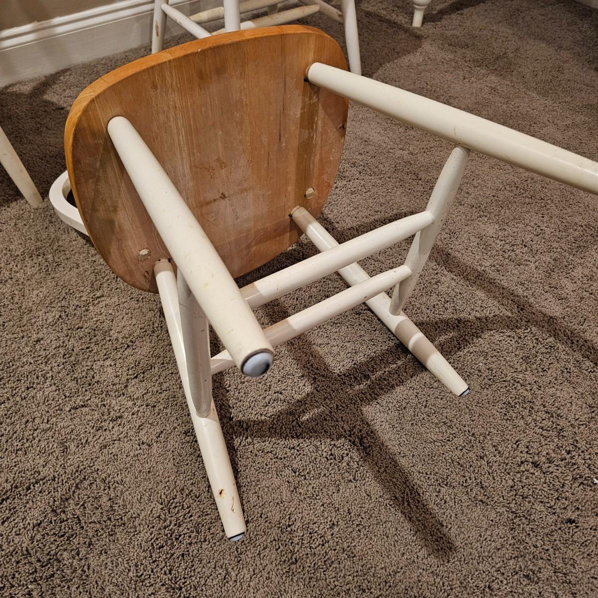 Rectangular table with white legs and blonde wood top edge. Center is white tile squares; one corner tile has chip in it. Table measures 47" x 29" x 29"H. Four matching chairs have white backs and legs, blonde wood seats. Chairs are 17.5" x 18" x 36"H, with an 18" seat height. Table and chairs need some cleaning. See photos for details. Local pickup only. Winning bidder must bring assistance to help move and load this item due to its weight and/or size. This lot is located in the basement and will need to be either moved up a flight of stairs to the main level and then down a few stairs at the entry, or it can be moved out the back door of the basement and carried up an incline on the side of the house.