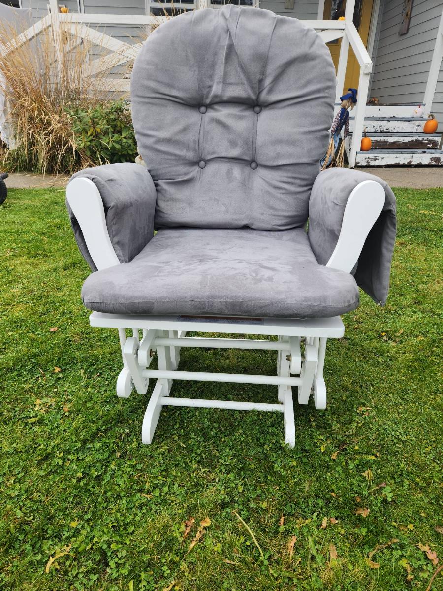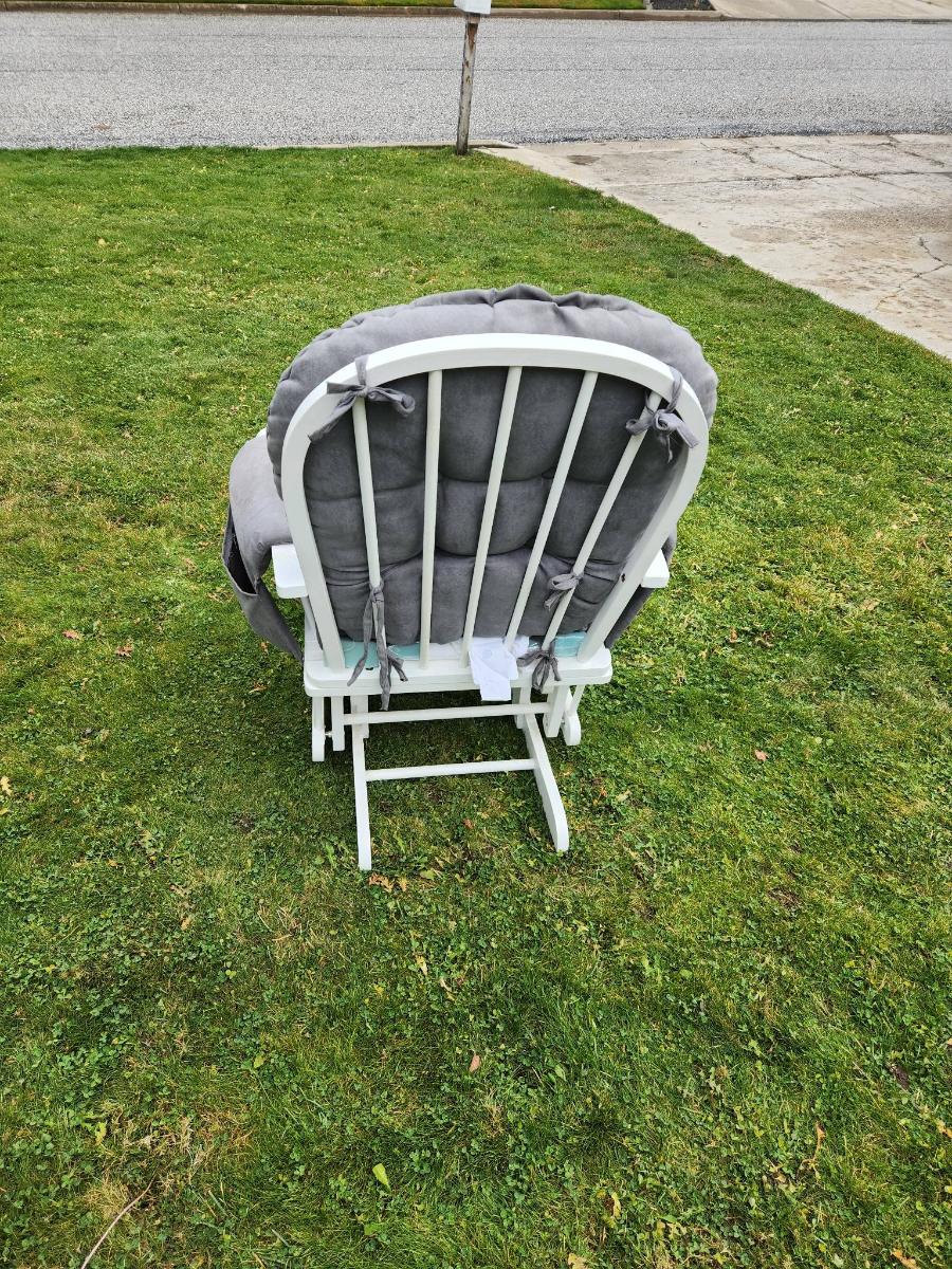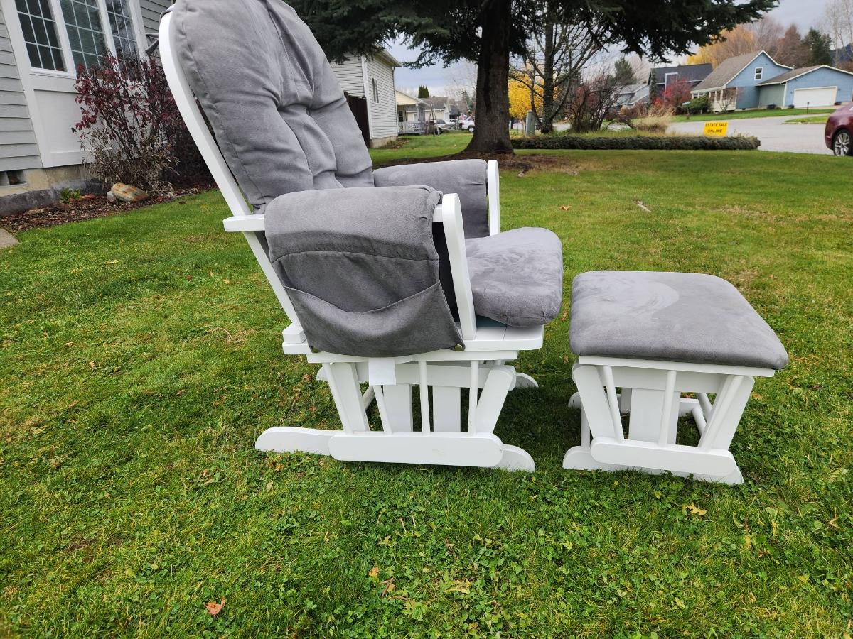 White Wooden Glider Chair and Ottoman with Gray Cushions