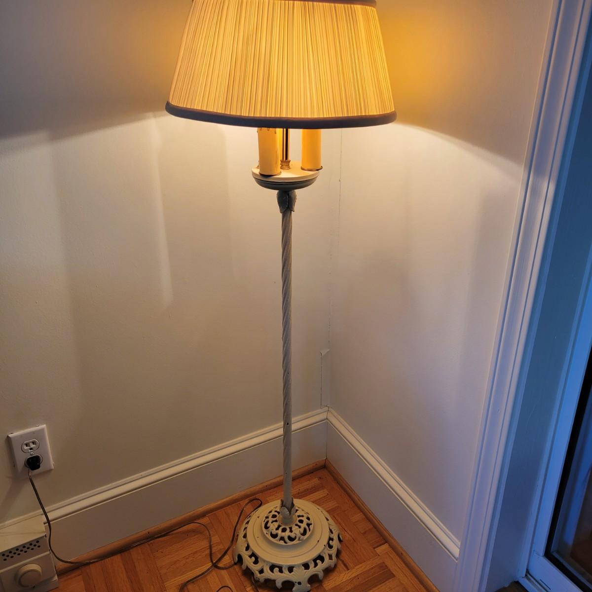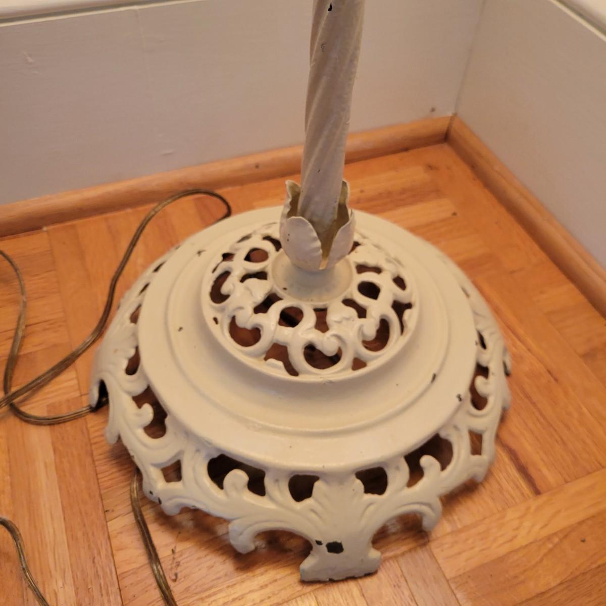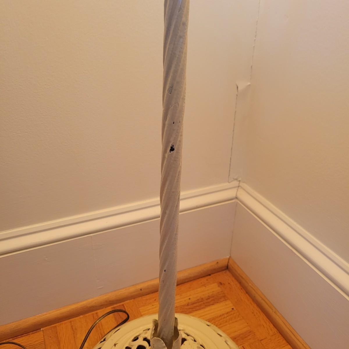 A white painted wrought iron floor lamp with candle-like light holders in good condition with some minor paint chips. This lamp features a decorative base with a twisted metal lamp body and three bulbs. Measures approximately 11" x 50". Local pickup only.