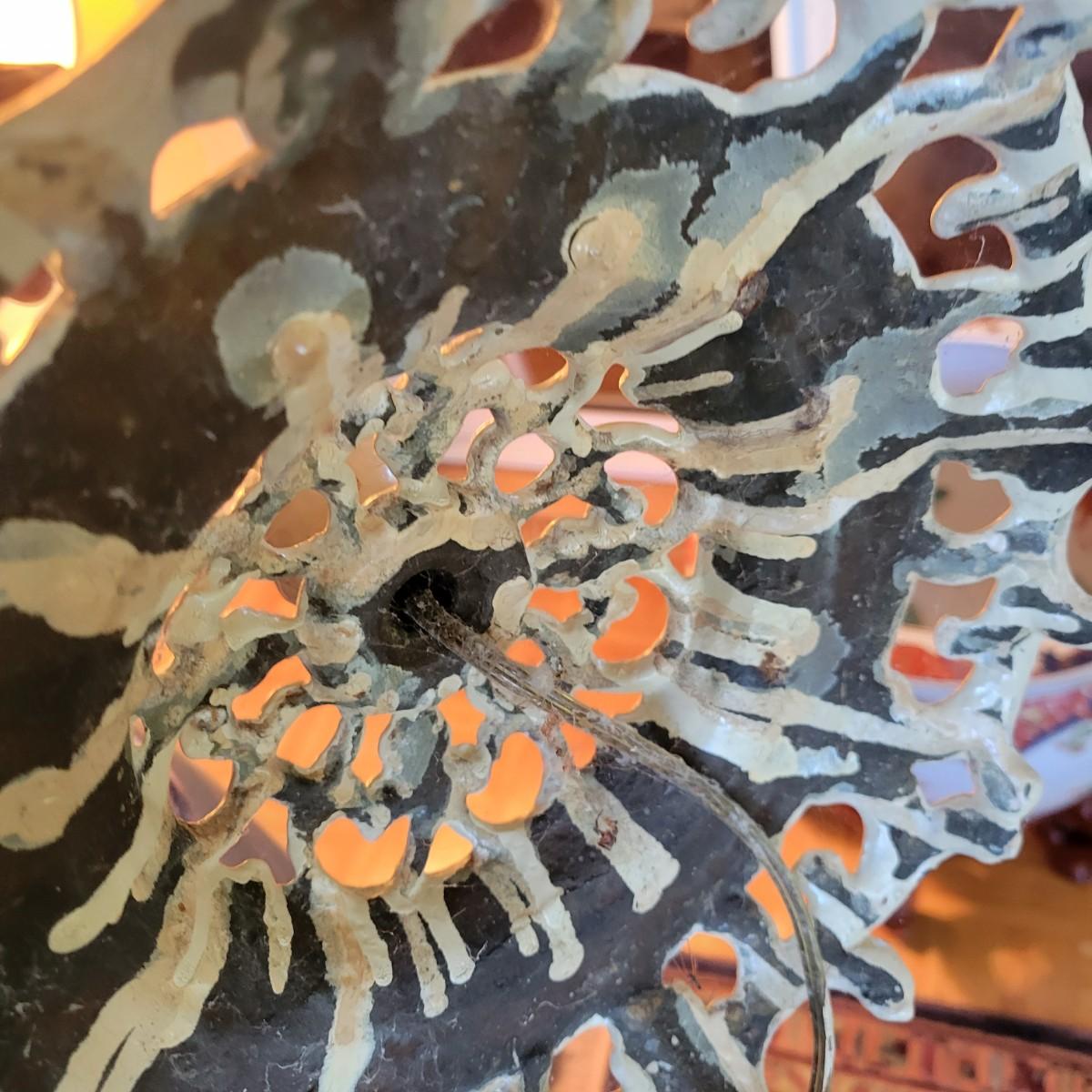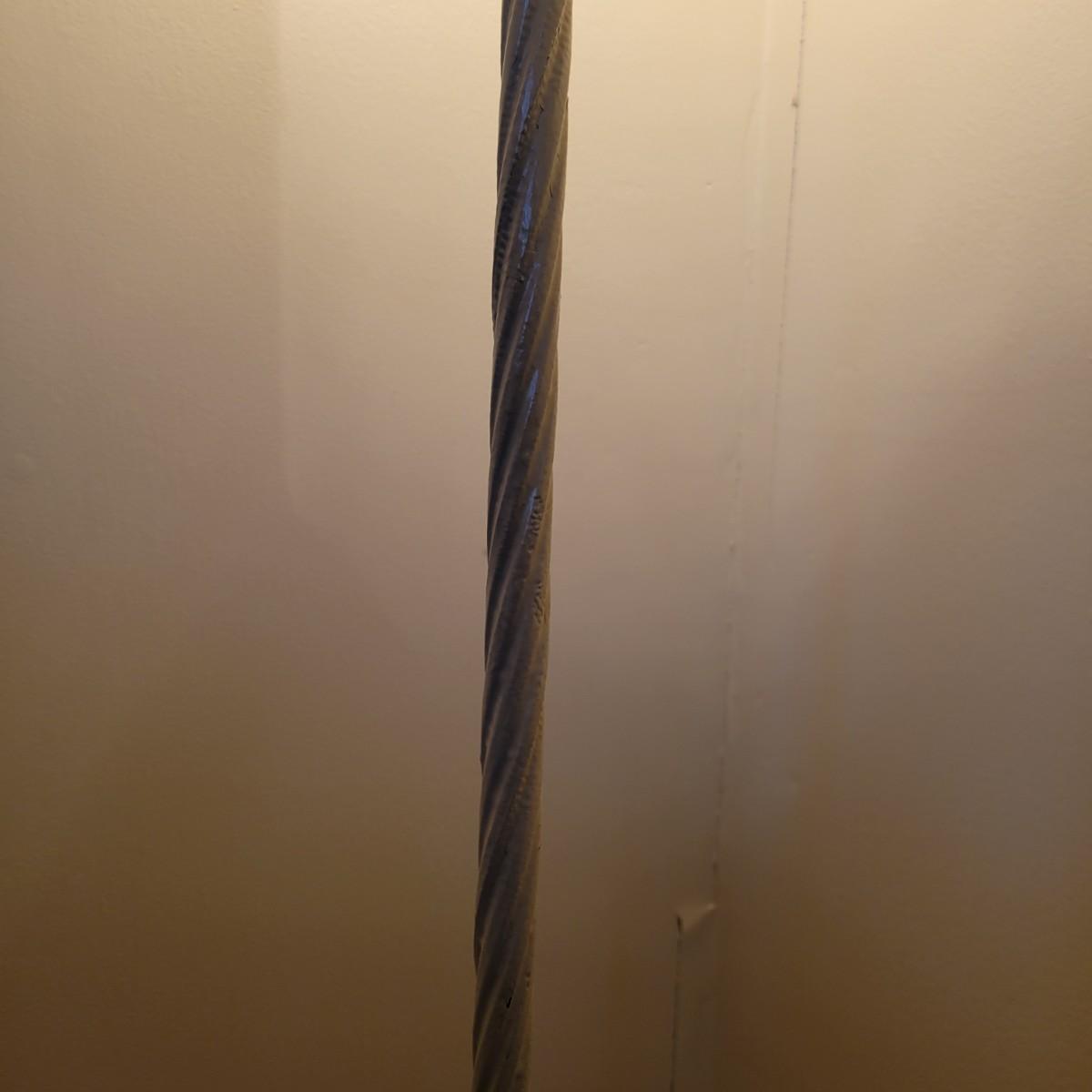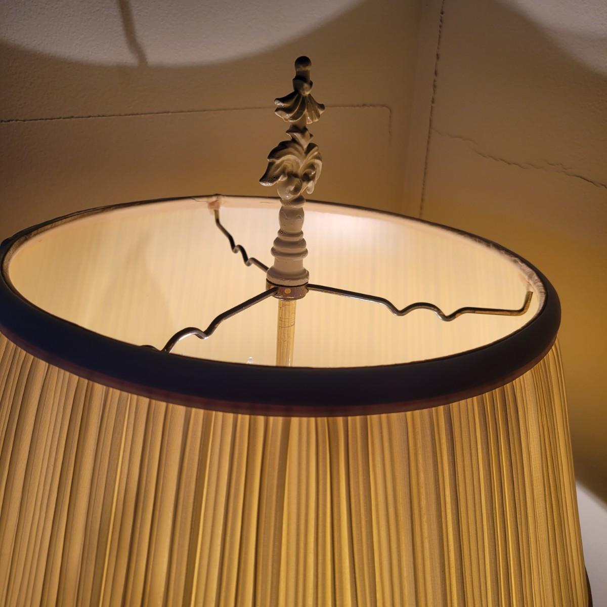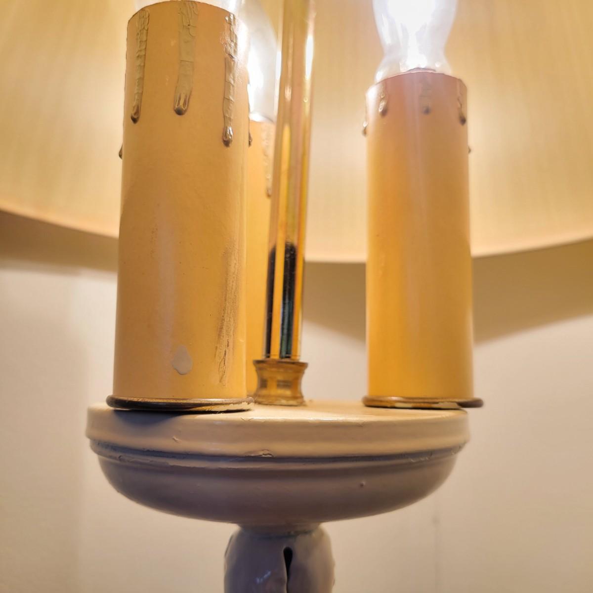 A white painted wrought iron floor lamp with candle-like light holders in good condition with some minor paint chips. This lamp features a decorative base with a twisted metal lamp body and three bulbs. Measures approximately 11" x 50". Local pickup only.