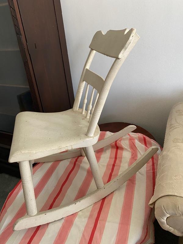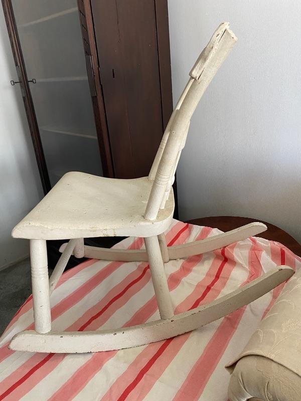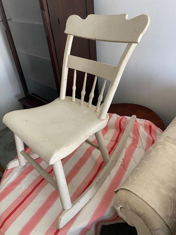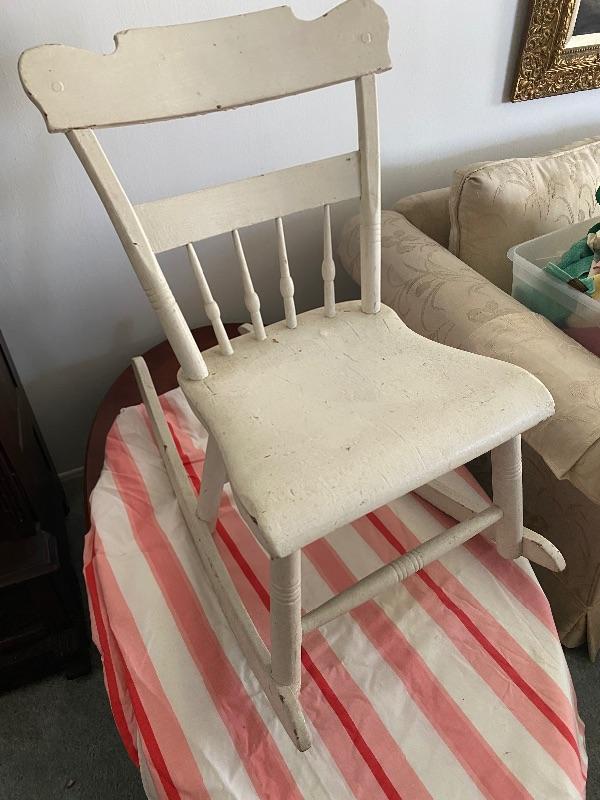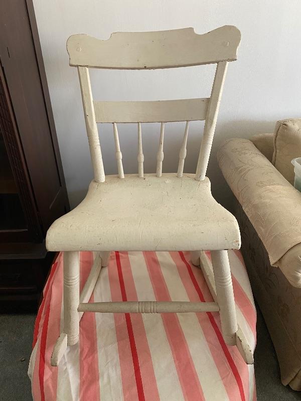 Youth size rocking chair. Currently painted white, looks like it may have been painted multiple times. The back is slanted back more then usual. Good condition.
