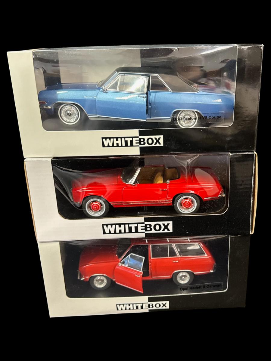 Includes Opel Kadett B Caravan, Opel Kadett V8 Coups, and Mercedes 230SL. Total of three pieces. The Mercedes has some damage, including a broken mirror. These are in the original boxes.
