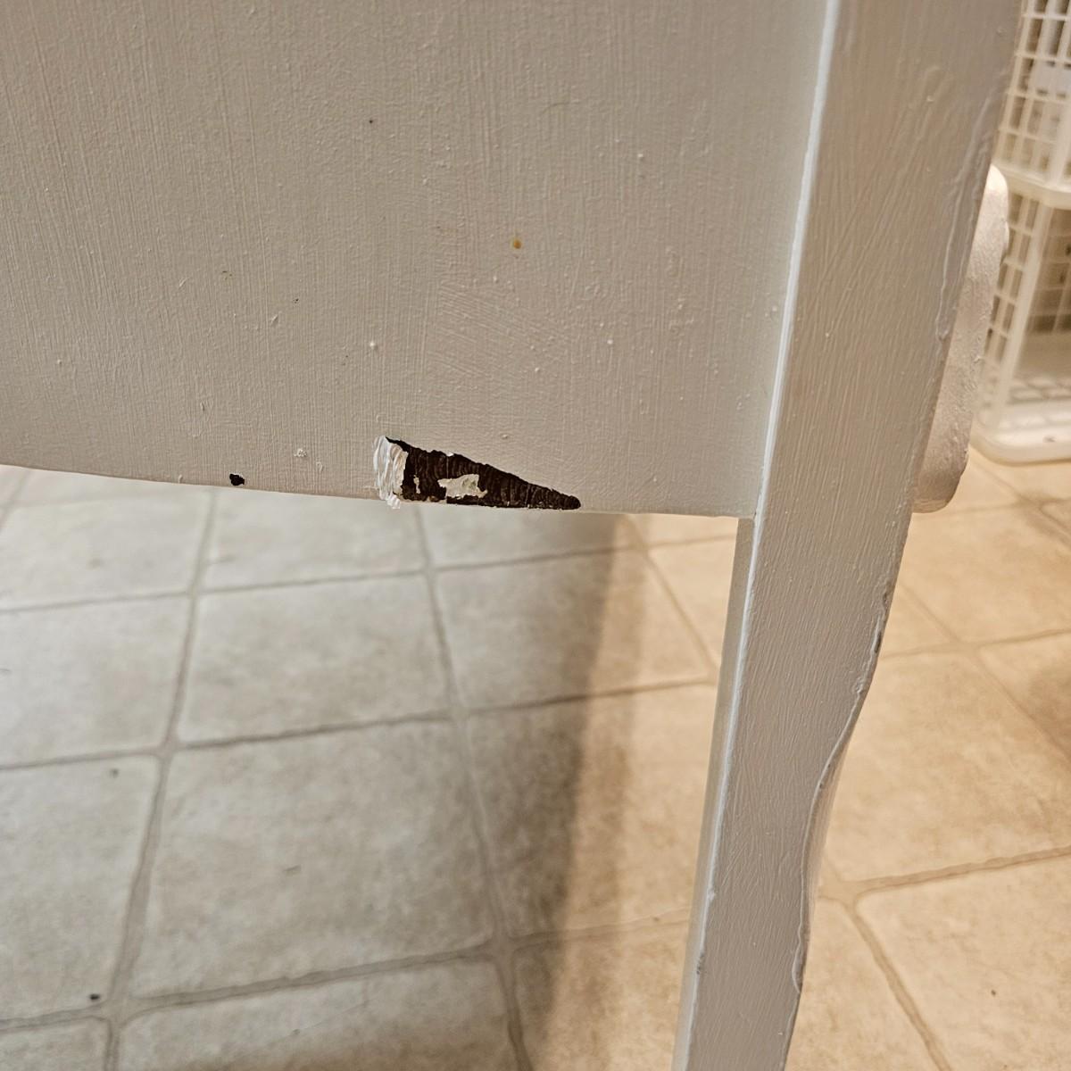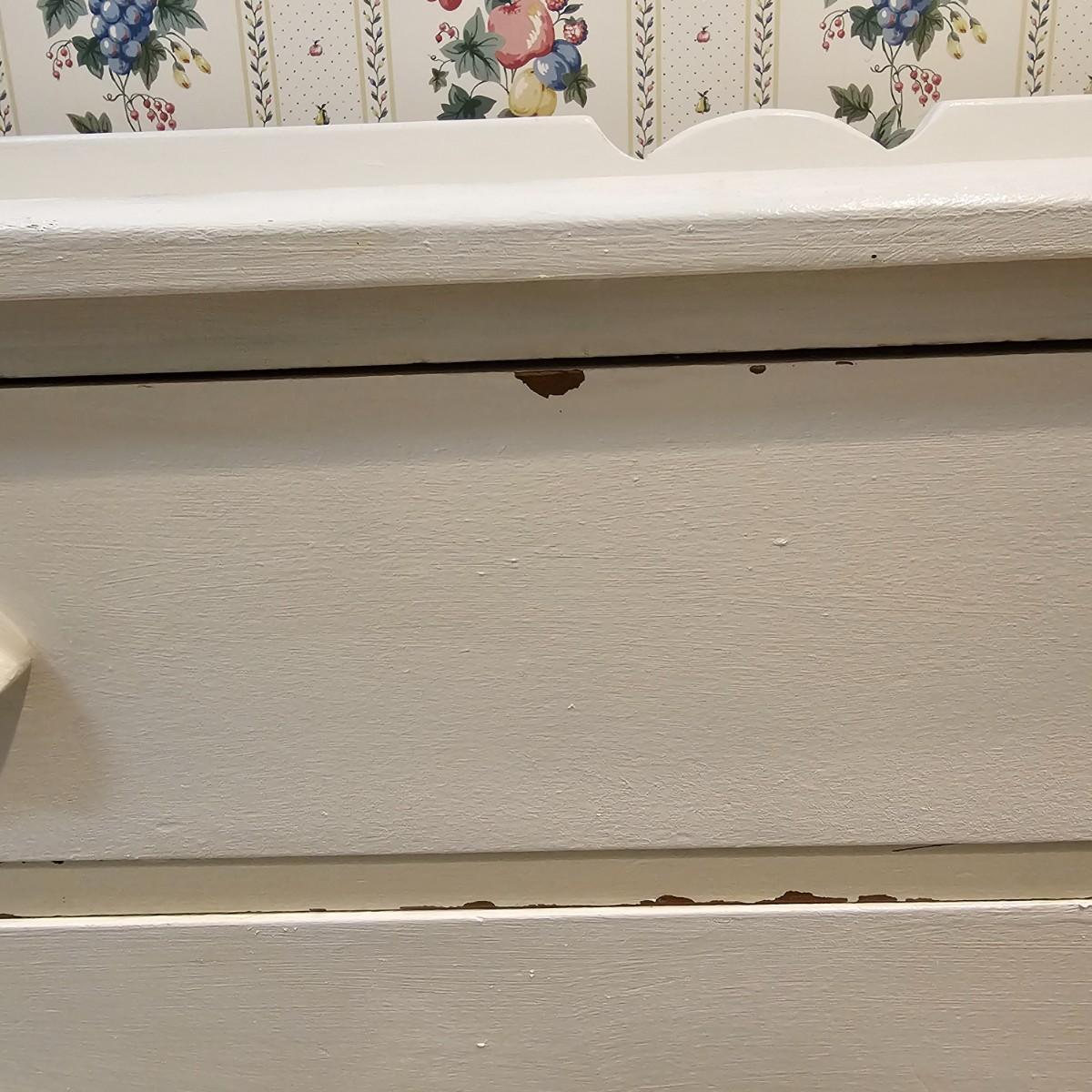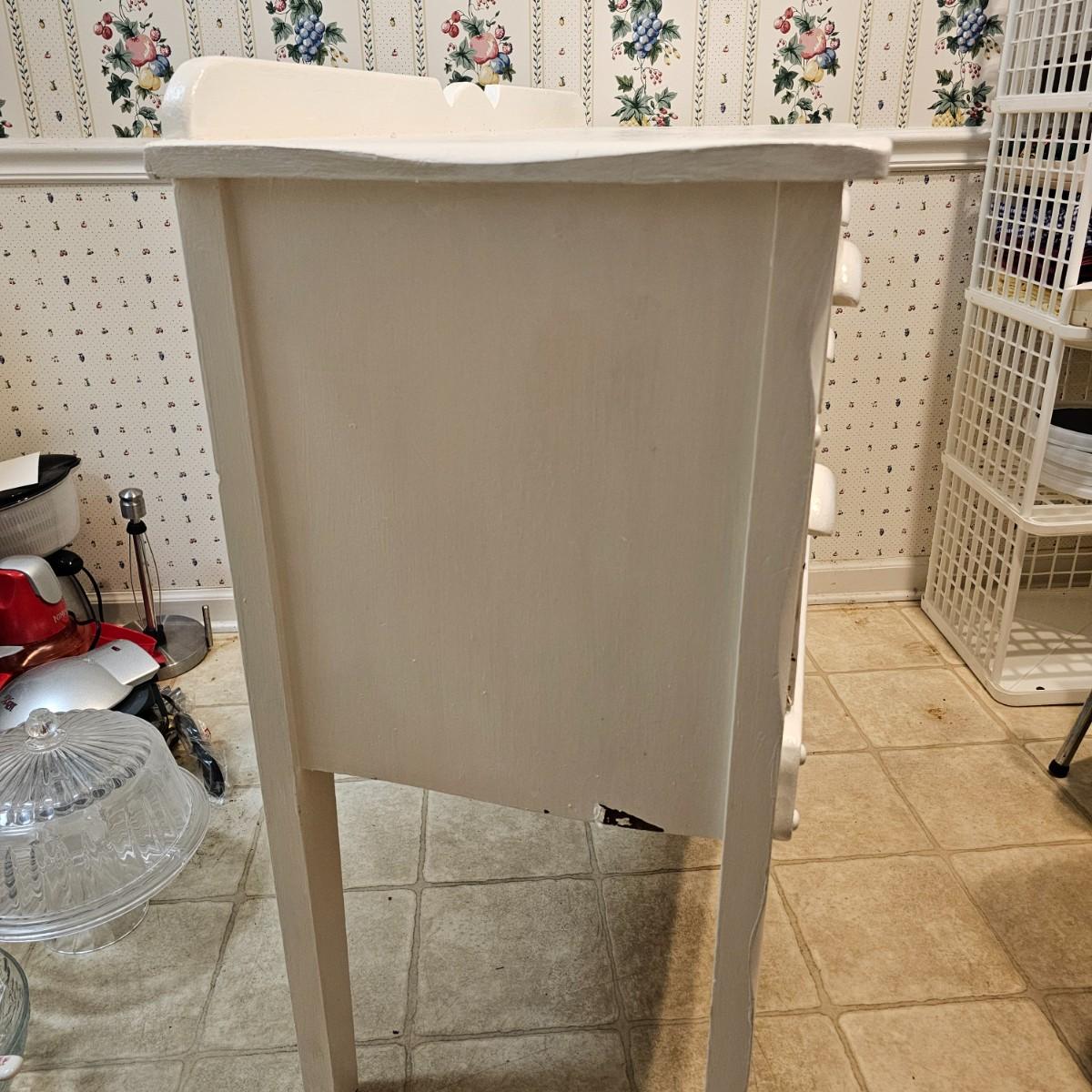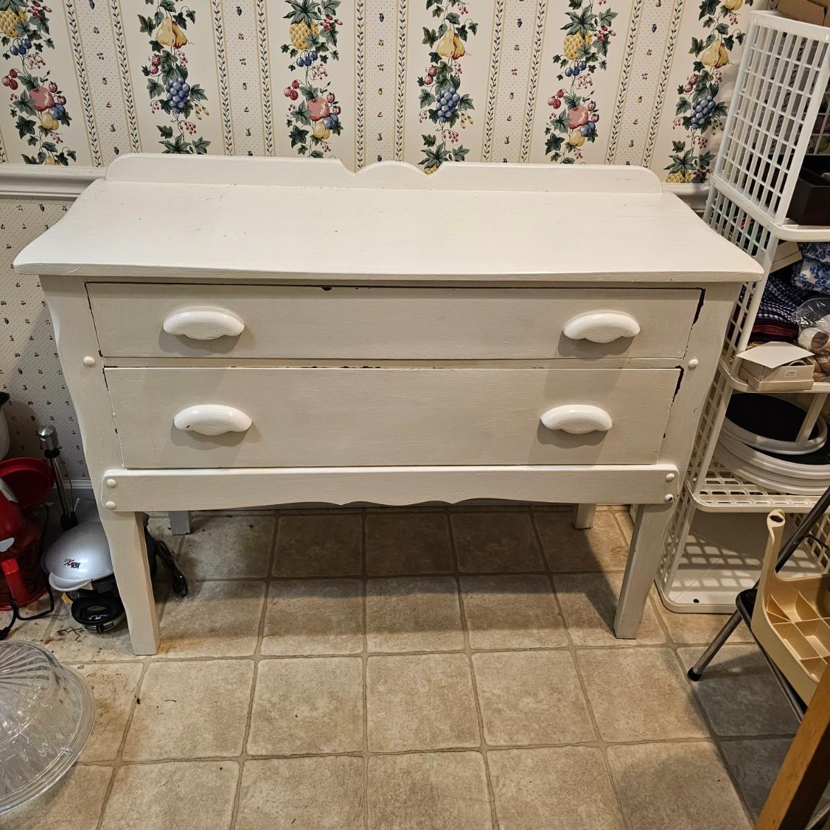Vintage two drawer wooden cabinet on legs with carved drawer pulls. Has been painted white, some spots showing base color underneath. Dovetail drawer joints. Cabinet measures 17" x 45" x 35" H. Light wear and tear on top. See photos for details. Local pickup only.