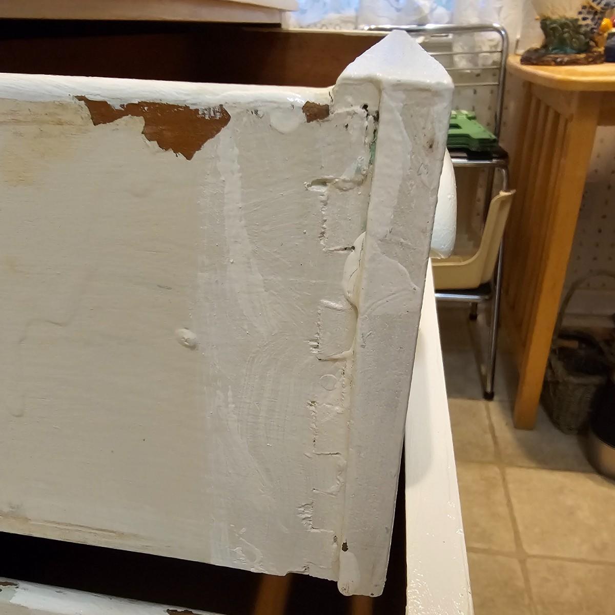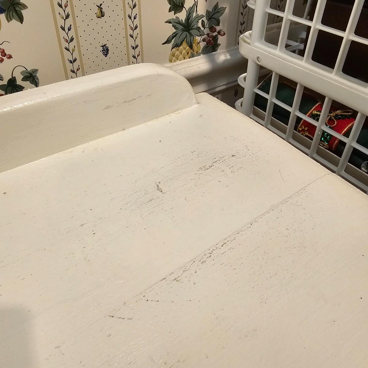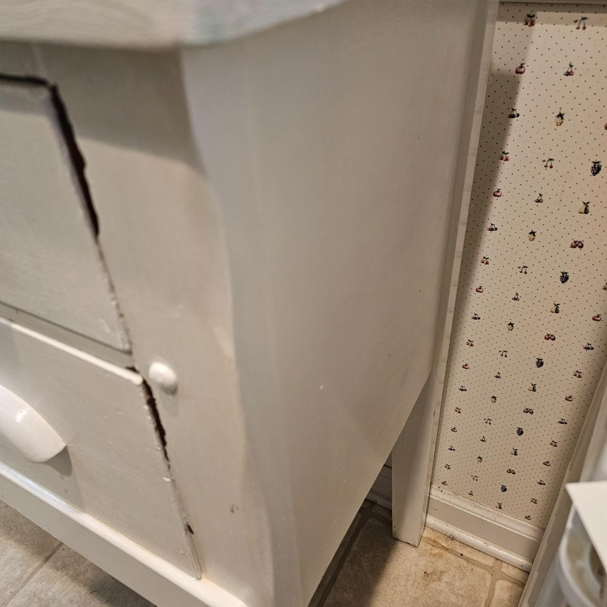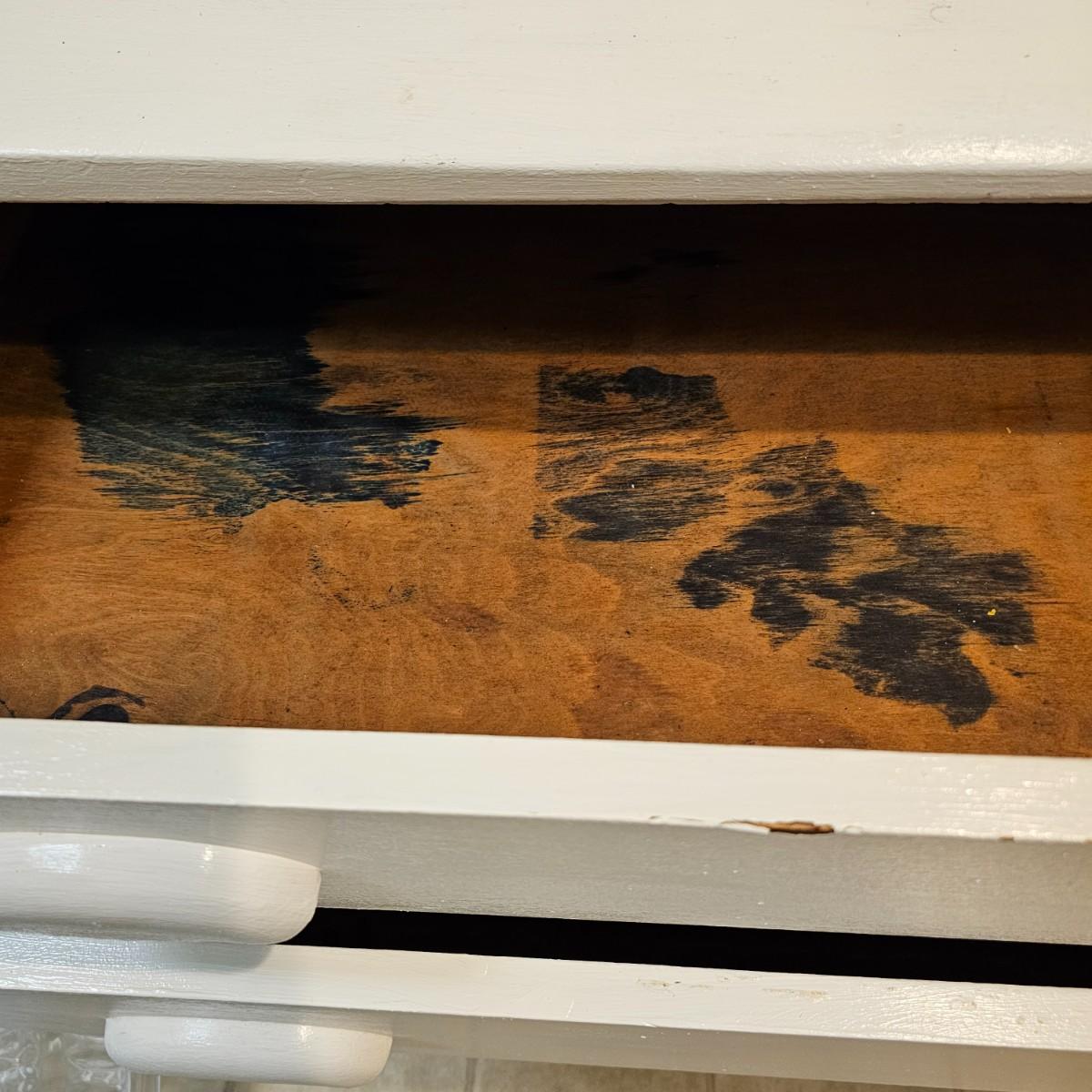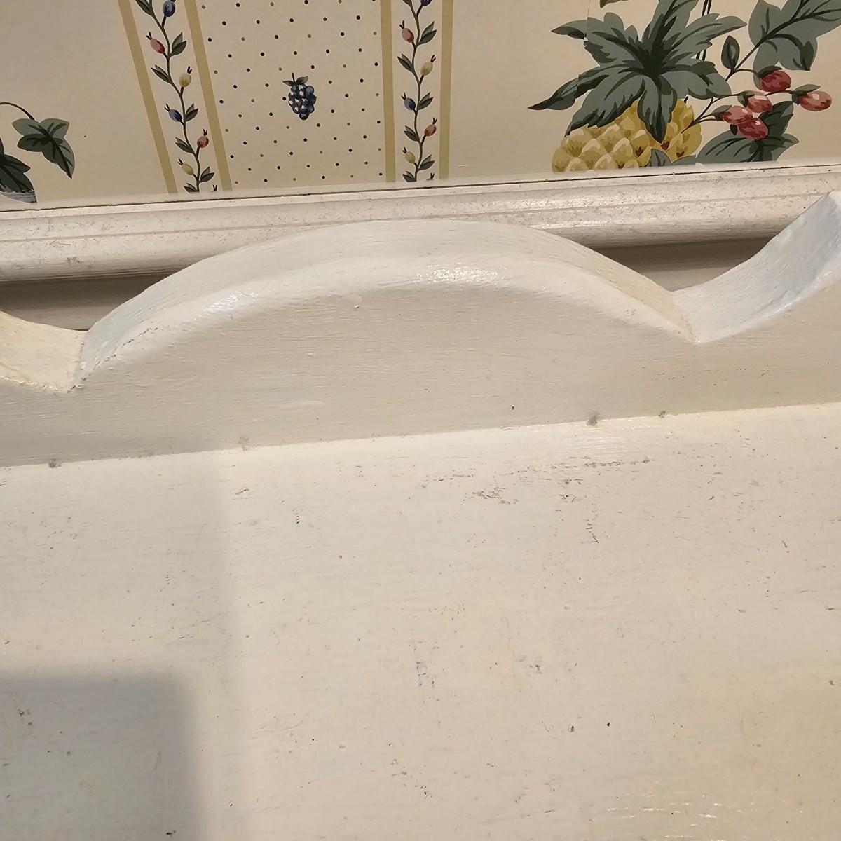 Vintage two drawer wooden cabinet on legs with carved drawer pulls. Has been painted white, some spots showing base color underneath. Dovetail drawer joints. Cabinet measures 17" x 45" x 35" H. Light wear and tear on top. See photos for details. Local pickup only.