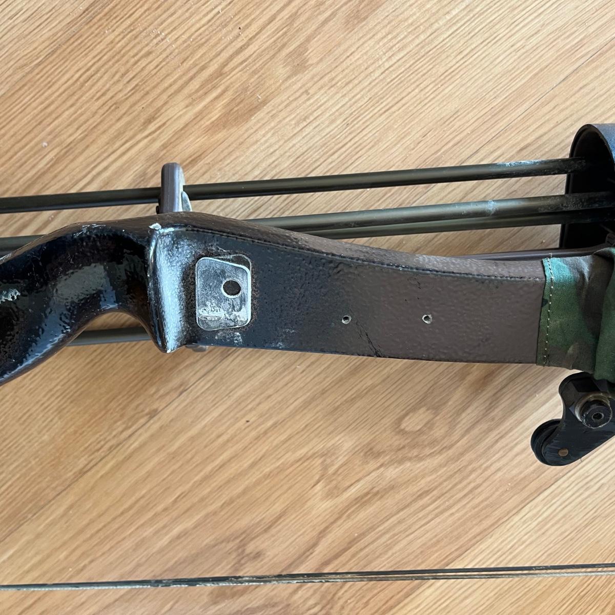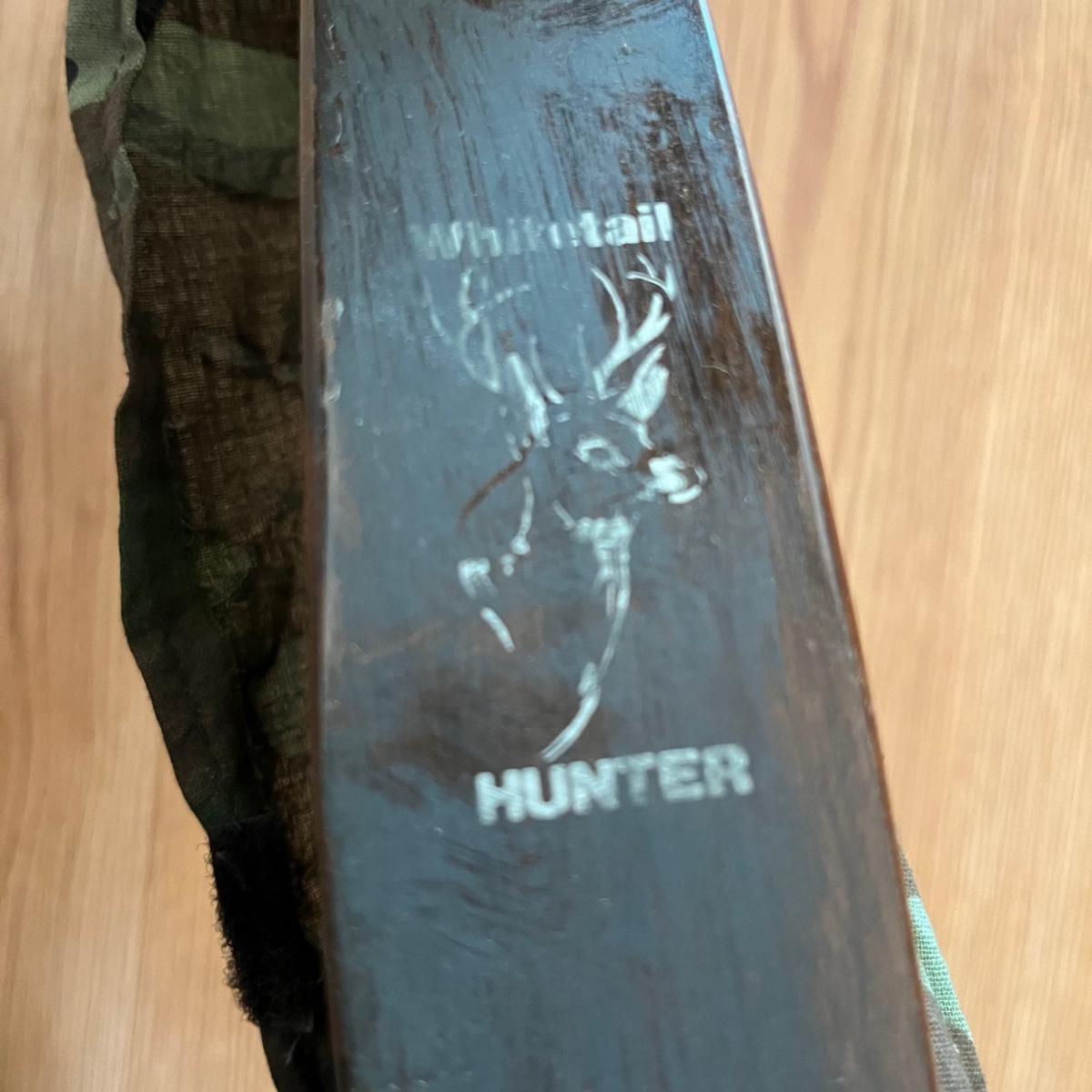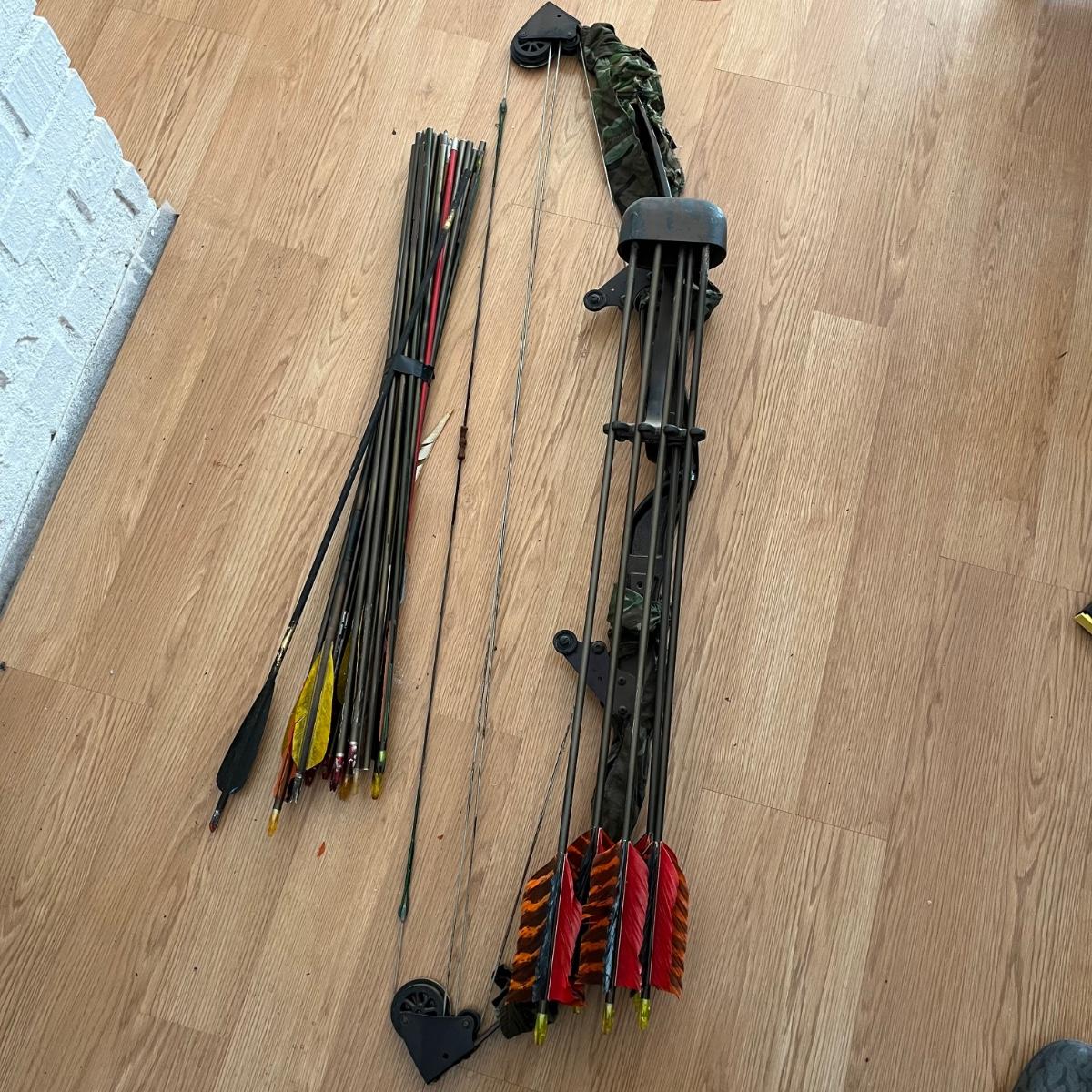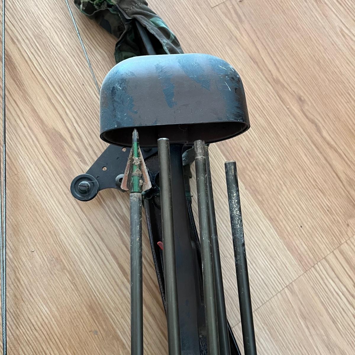 Lot includes a Whitetail Hunter compound bow with over twenty arrows. Bow measures 10.5” x 50” x 5”. Most loose arrows are missing the feathers. Also includes clay pigeons, hand thrower, gun cleaning rods and gun lock with key.