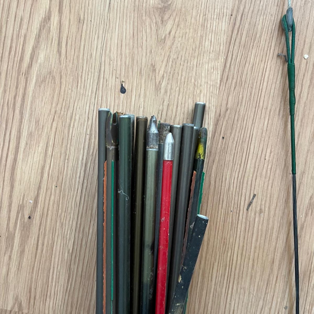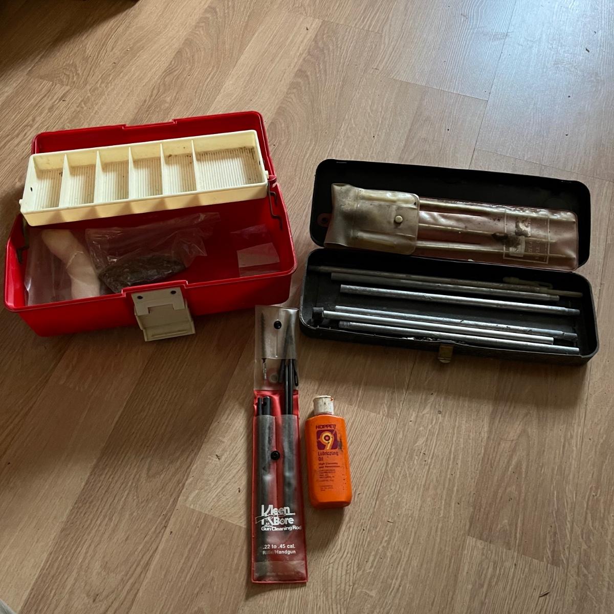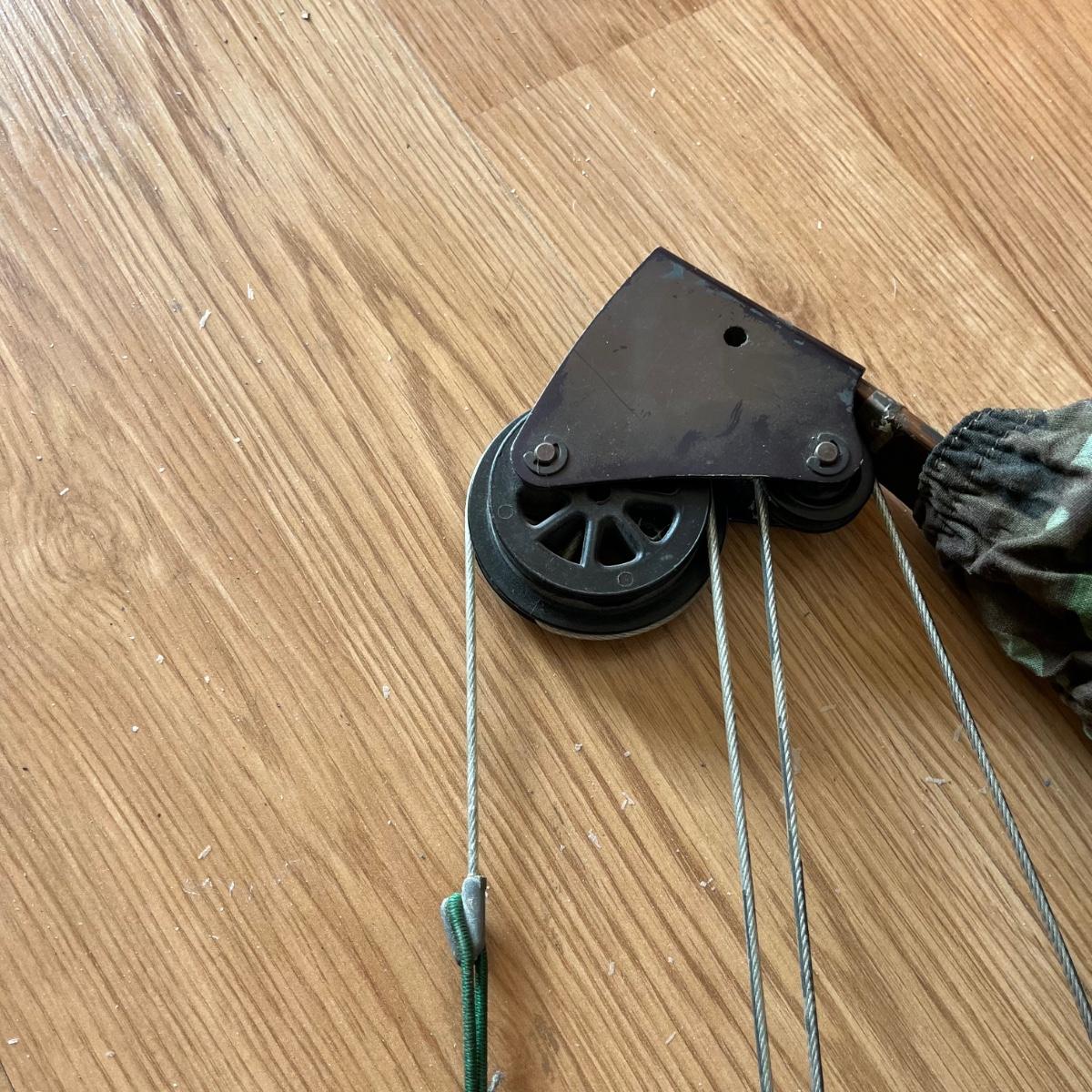 Lot includes a Whitetail Hunter compound bow with over twenty arrows. Bow measures 10.5” x 50” x 5”. Most loose arrows are missing the feathers. Also includes clay pigeons, hand thrower, gun cleaning rods and gun lock with key.