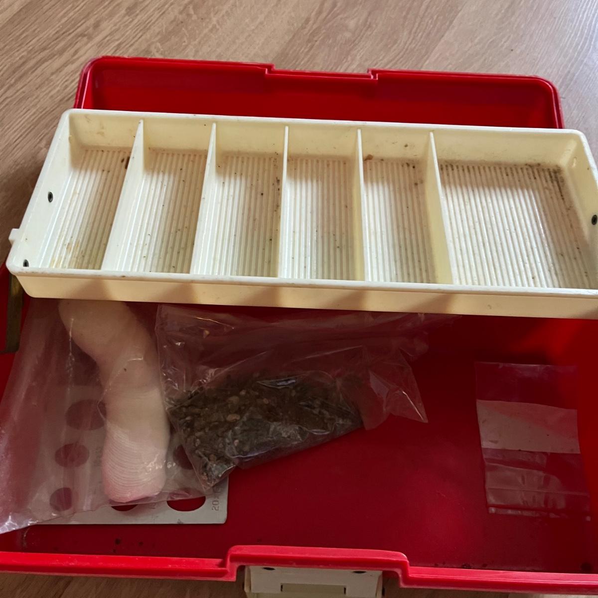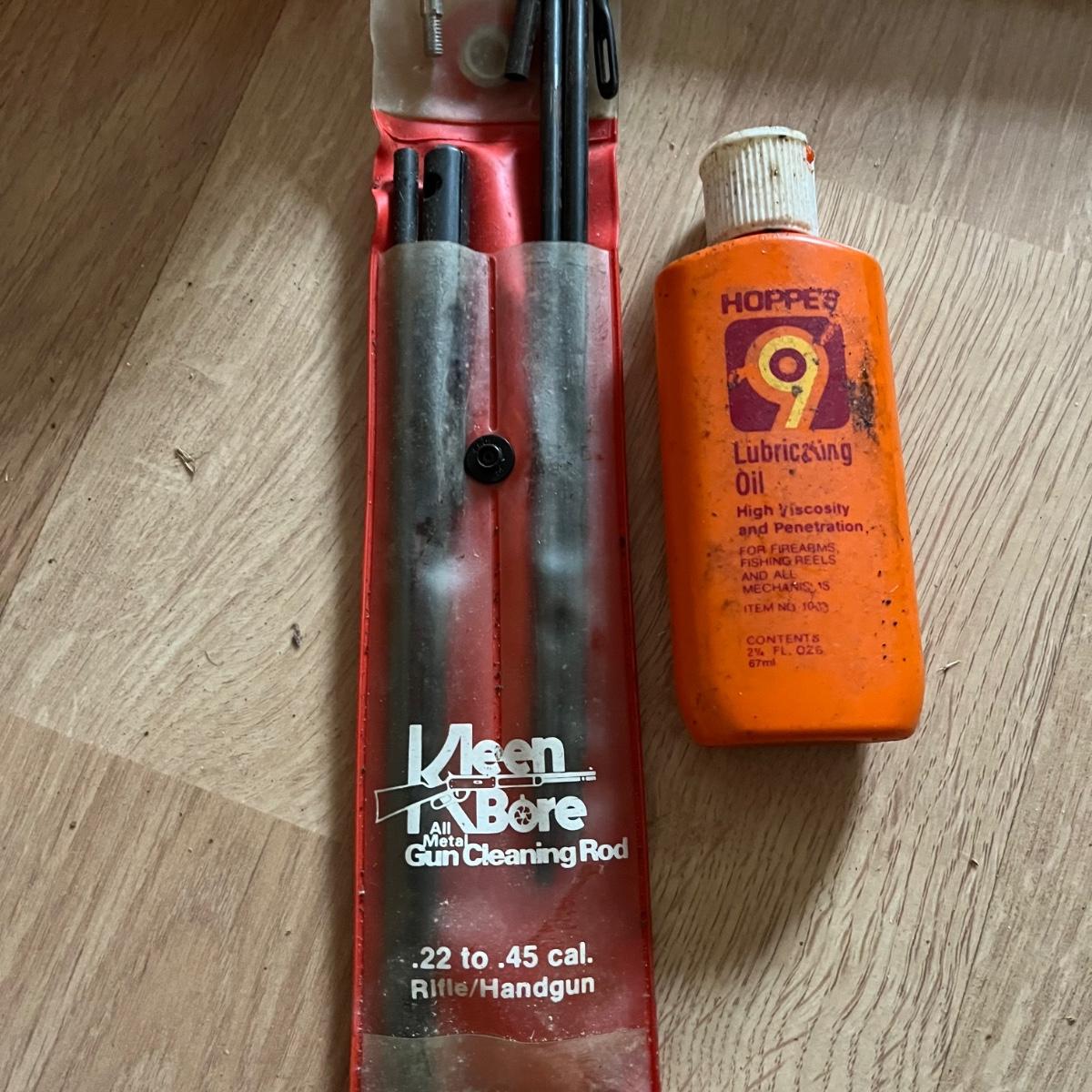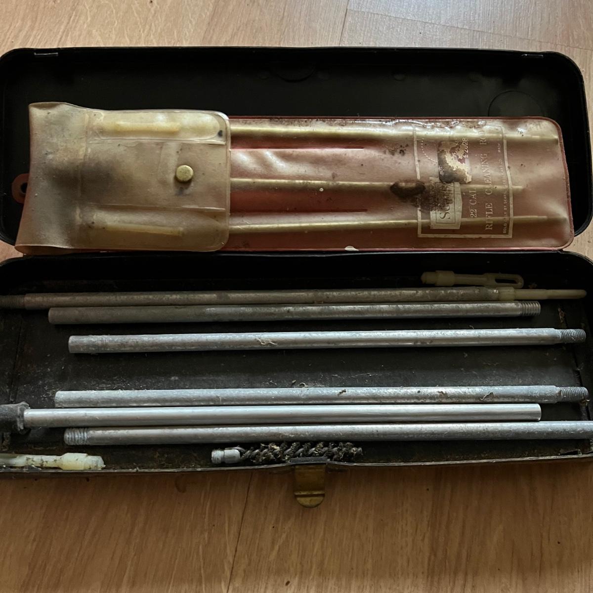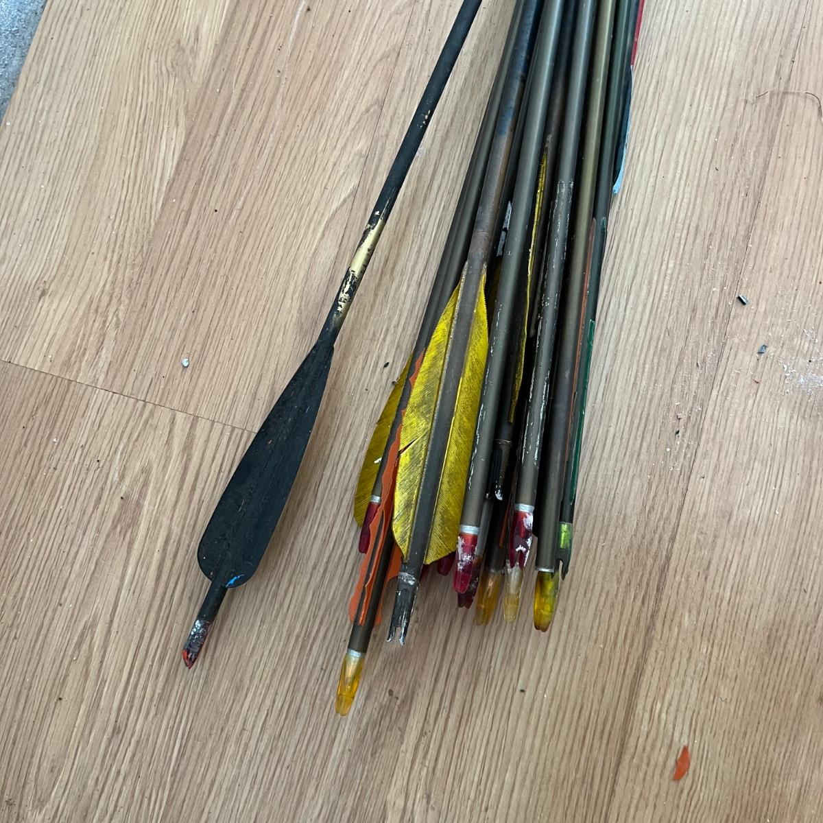 Lot includes a Whitetail Hunter compound bow with over twenty arrows. Bow measures 10.5” x 50” x 5”. Most loose arrows are missing the feathers. Also includes clay pigeons, hand thrower, gun cleaning rods and gun lock with key.
