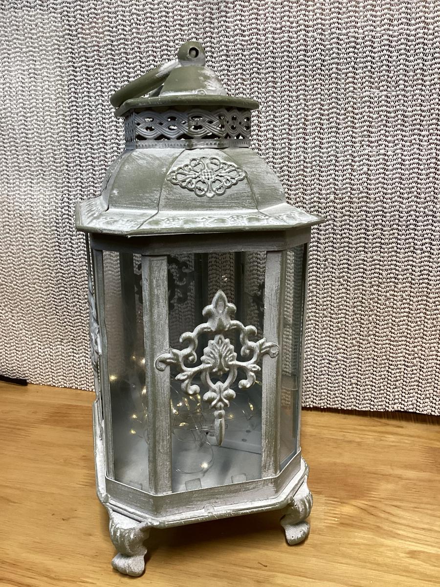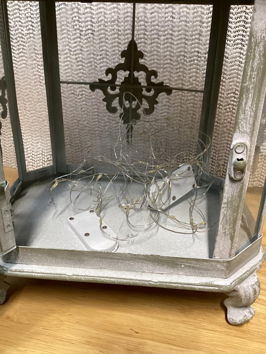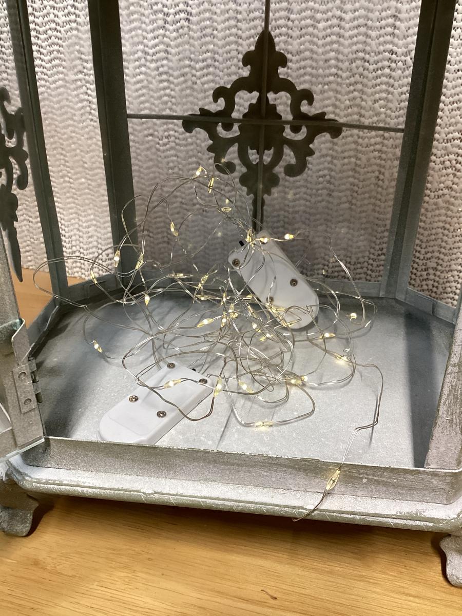 whitewash metal lantern with battery led light strips in it