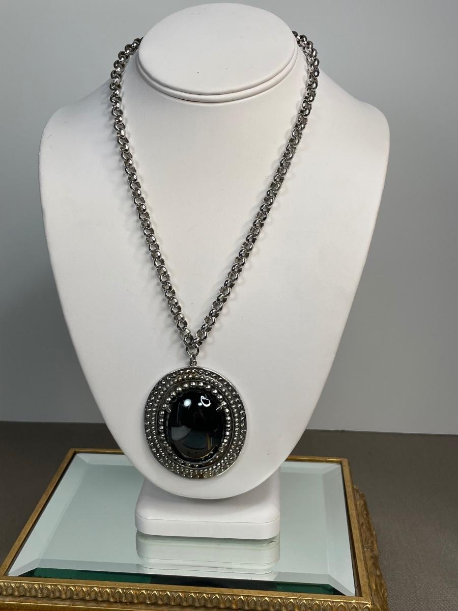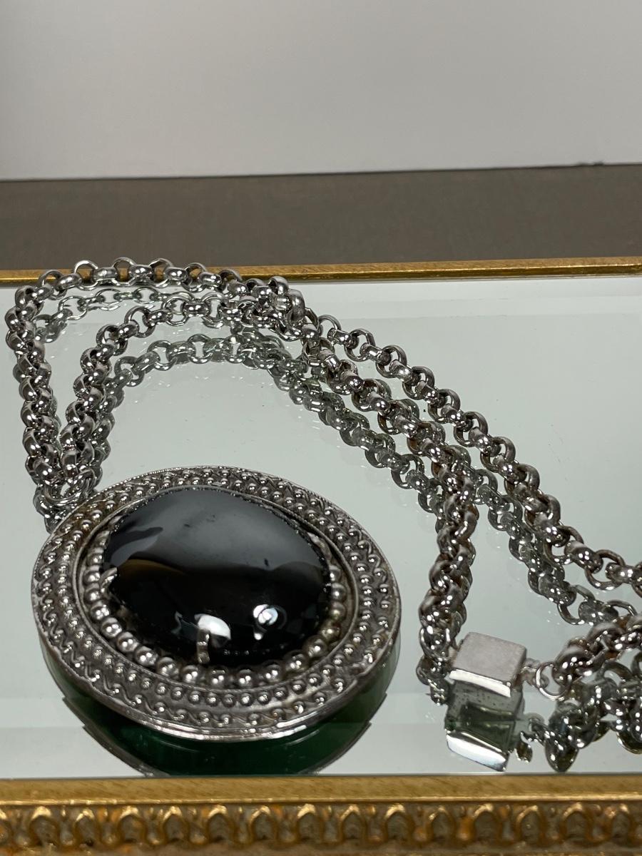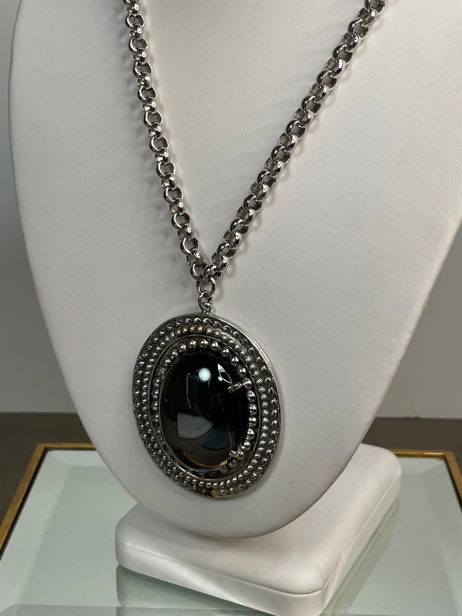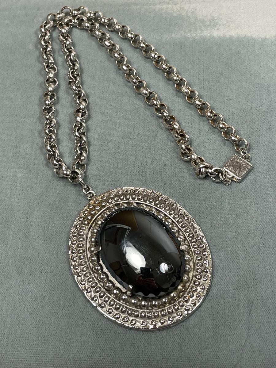 Large glass pendant measures 2” by 2 1/2” with silver tone chain. Signed