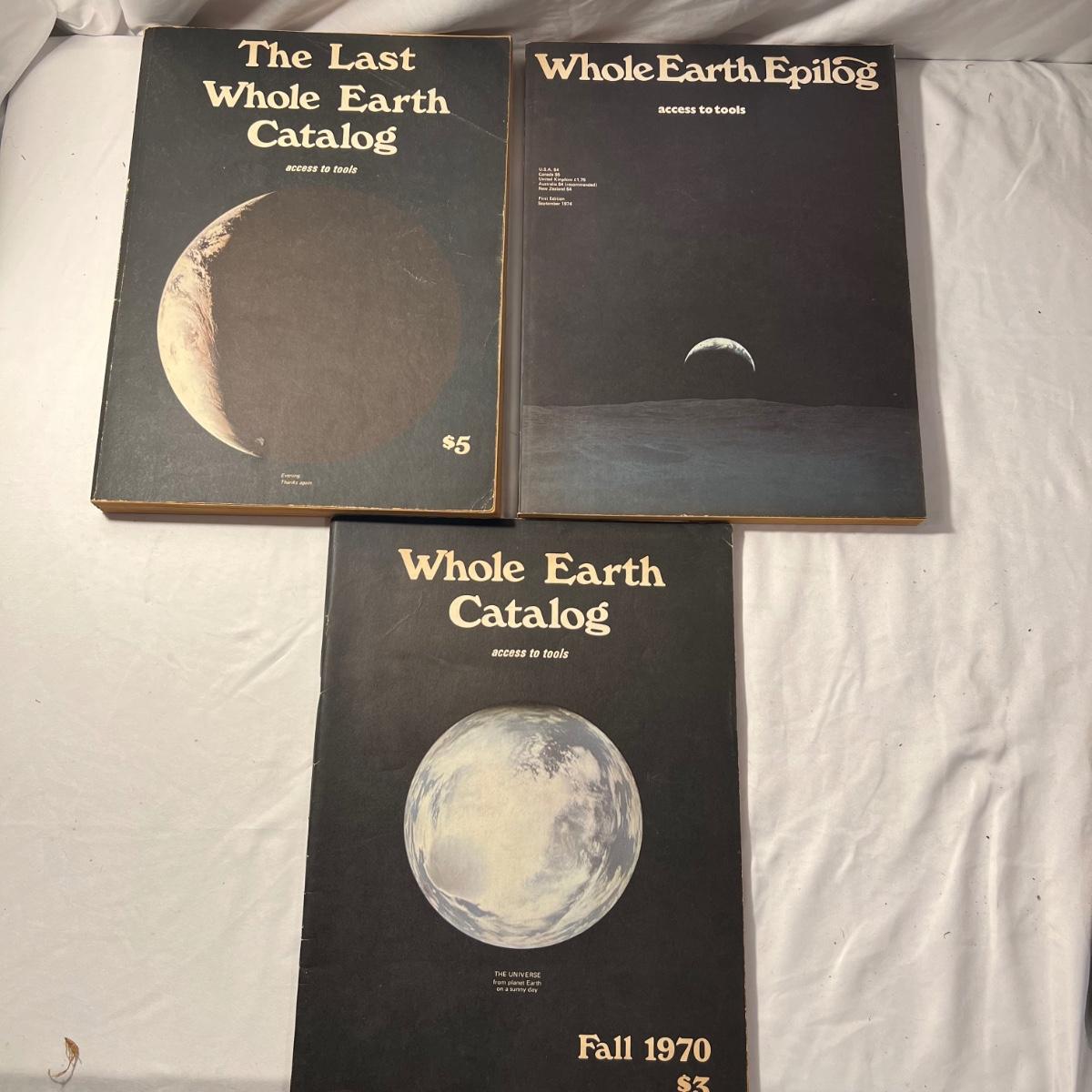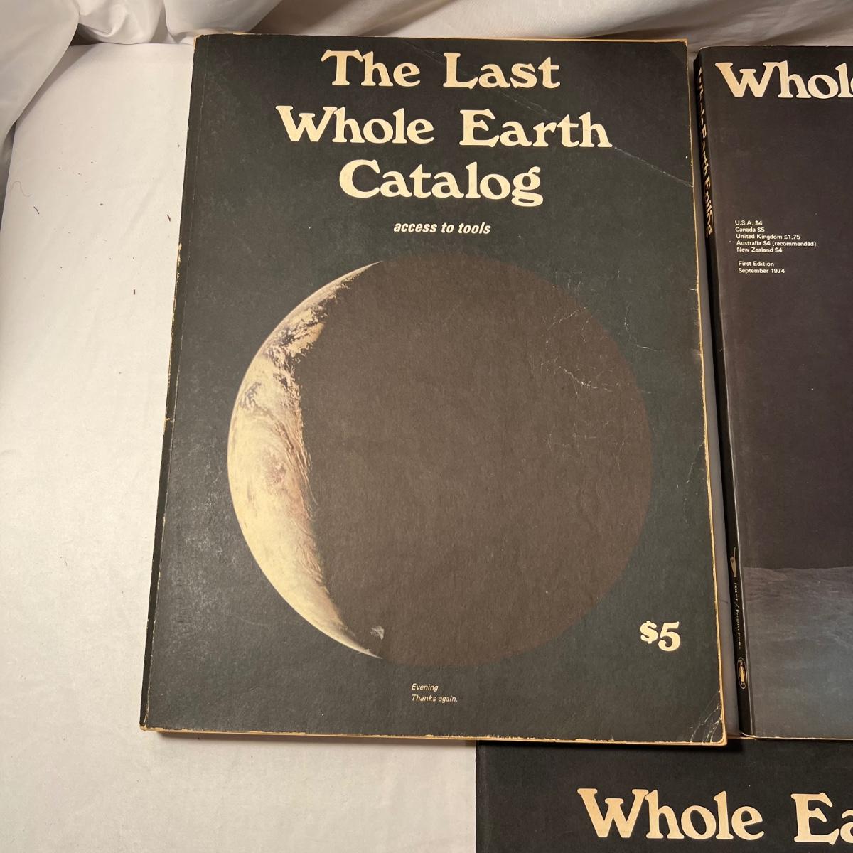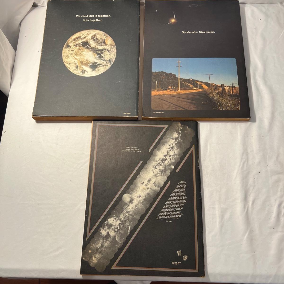 Three Whole Earth Catalogues that measure 11” x 14.5”. See images for more information and note the binding is coming loose on one catalogue.