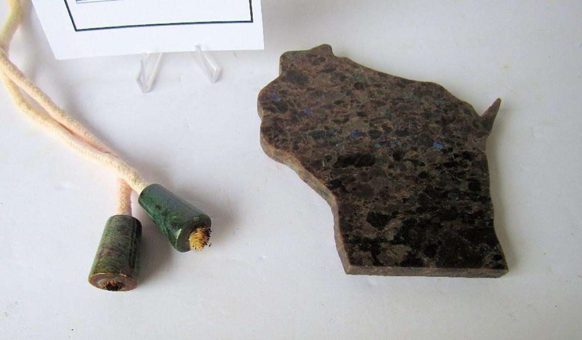 Good shape. You can use the beads for just about anything crafty, nice green color. The WI piece may be a trivet, not sure, but sure is nice. Shipping is available on this lot with additional shipping and handling fees. Please see our terms for details.