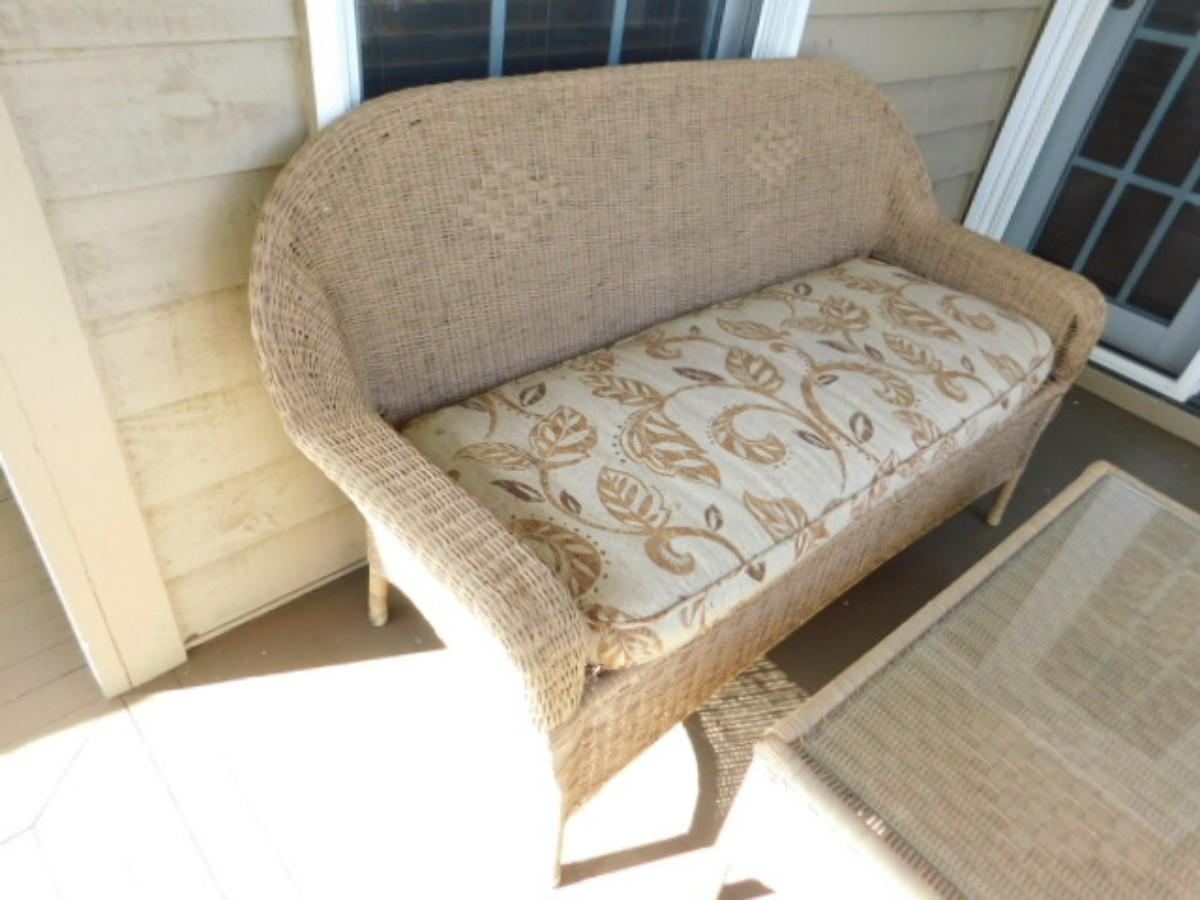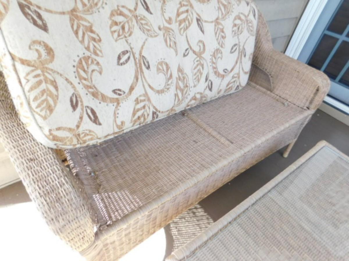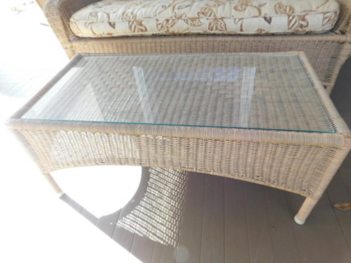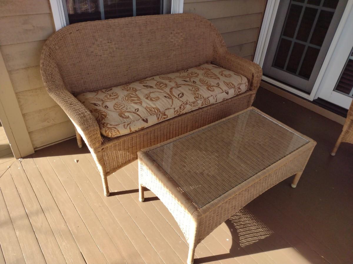 Wicker Weave Patio Couch and Matching Glass Top Coffee Table