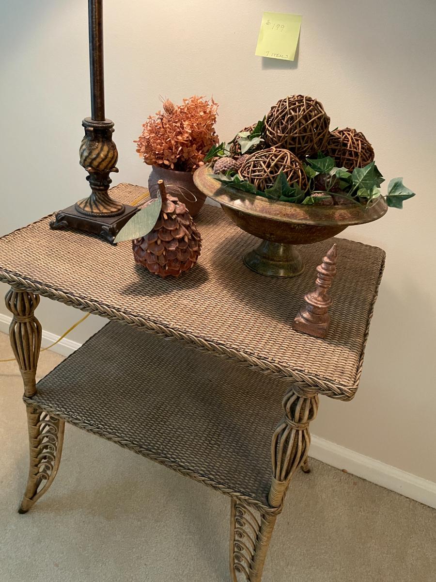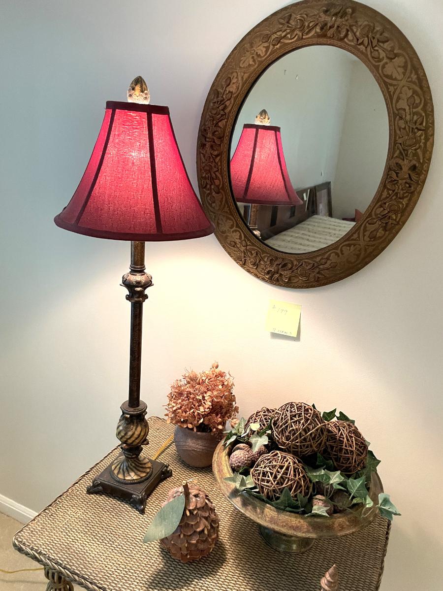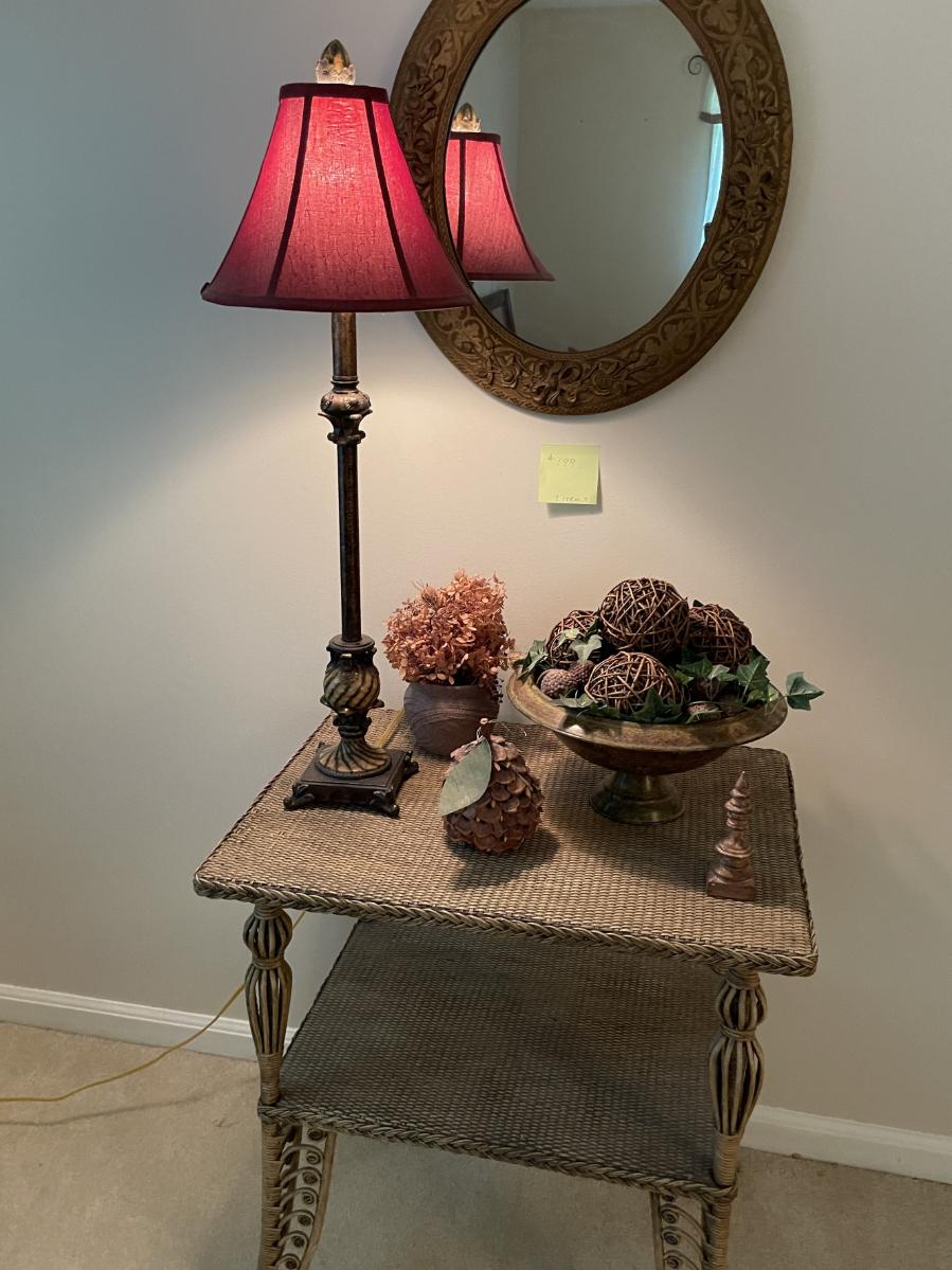 Vintage wicker table with lamp, mirroer and asst decorative pieces