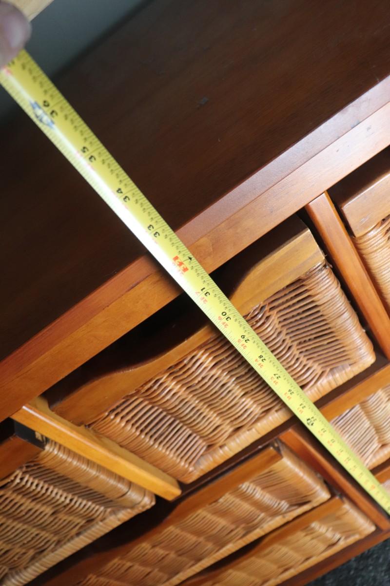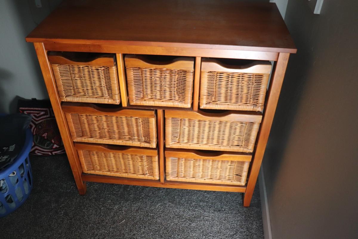 A charming wicker basket storage unit perfect for organizing items in your home while adding a touch of rustic elegance.