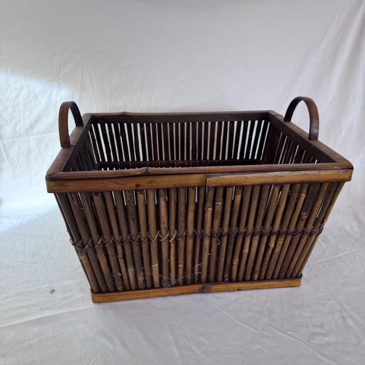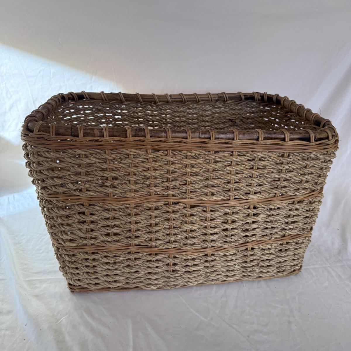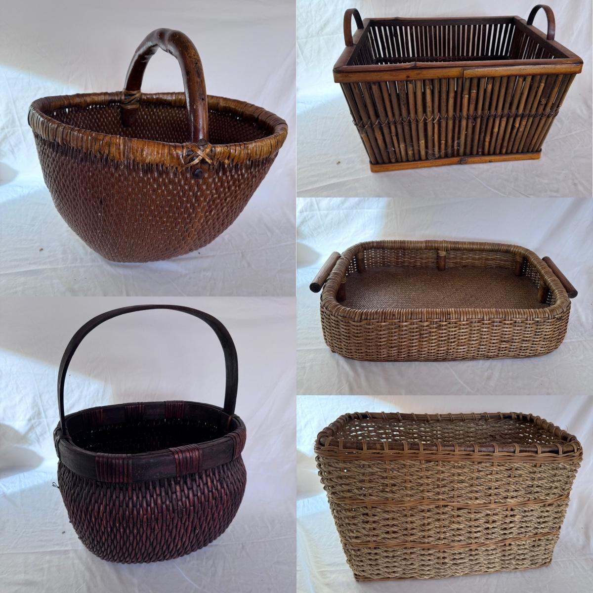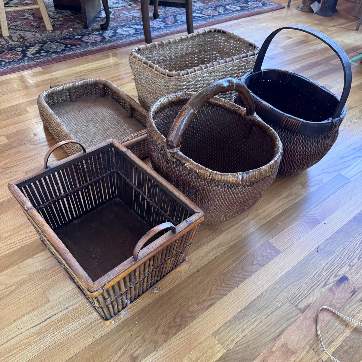 This lot of wicker baskets includes one tray and four baskets of different sizes. Four out of the five baskets have handles. All are made of wicker. The last basket individually pictured measures 21” x 13” x 12”H. Local pickup only.