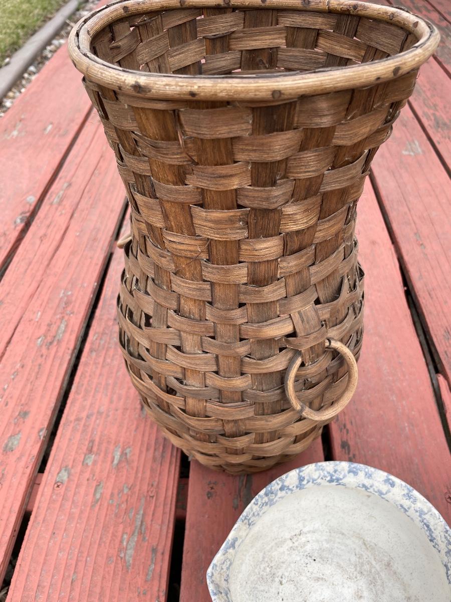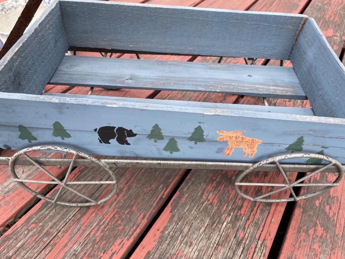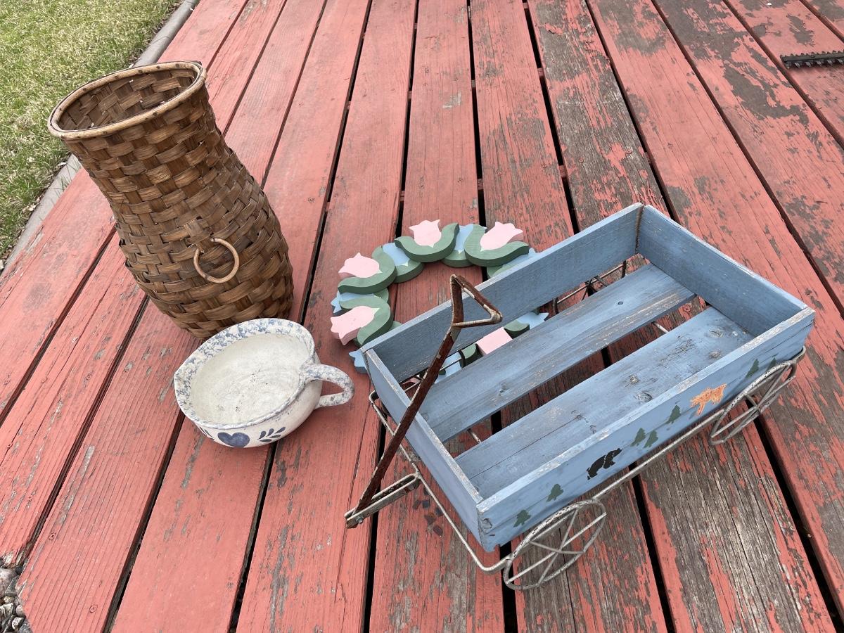 Wicker basket, wood wreath, pottery and wagon