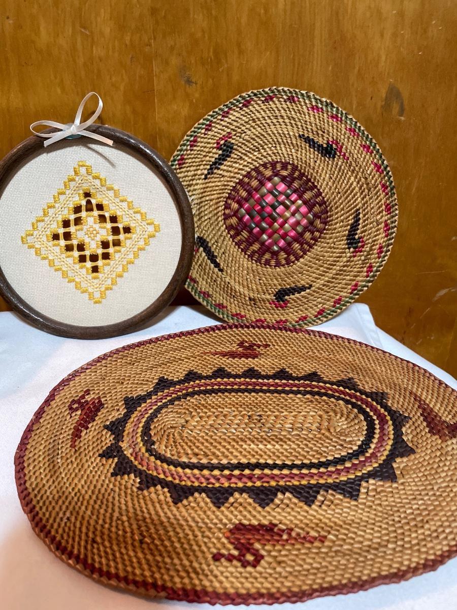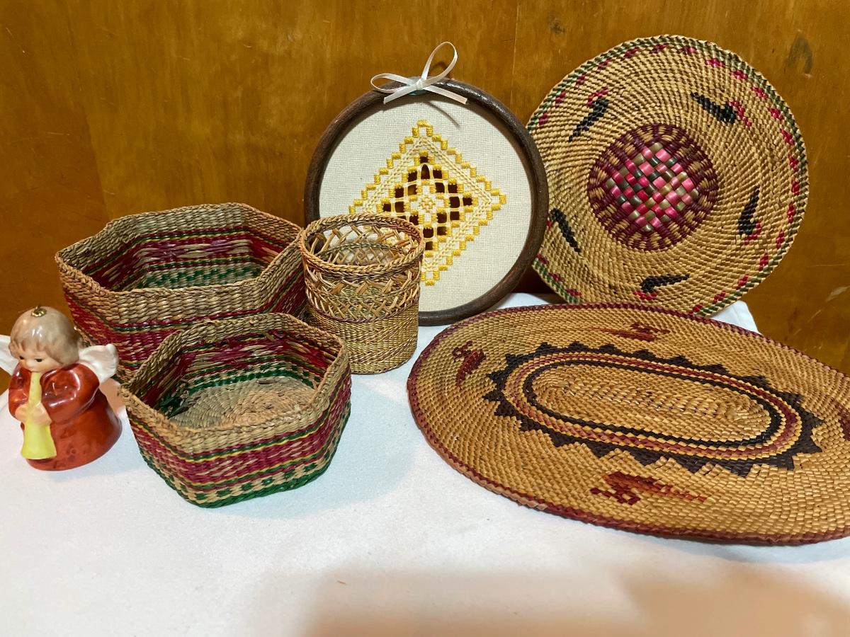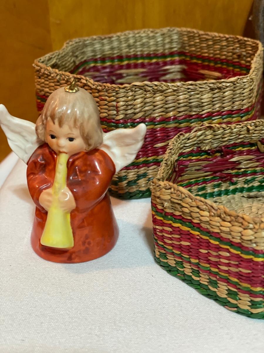 Wicker baskets and mats along with Hummel angel bell