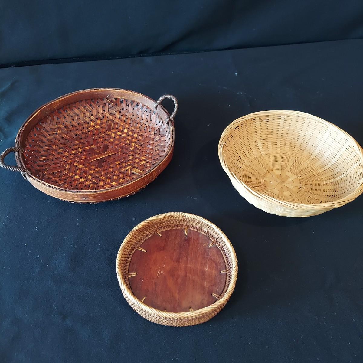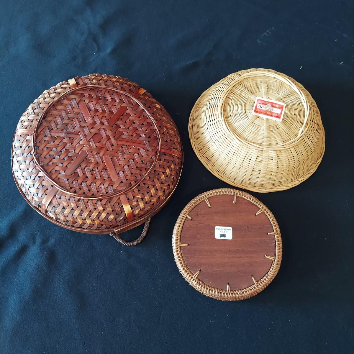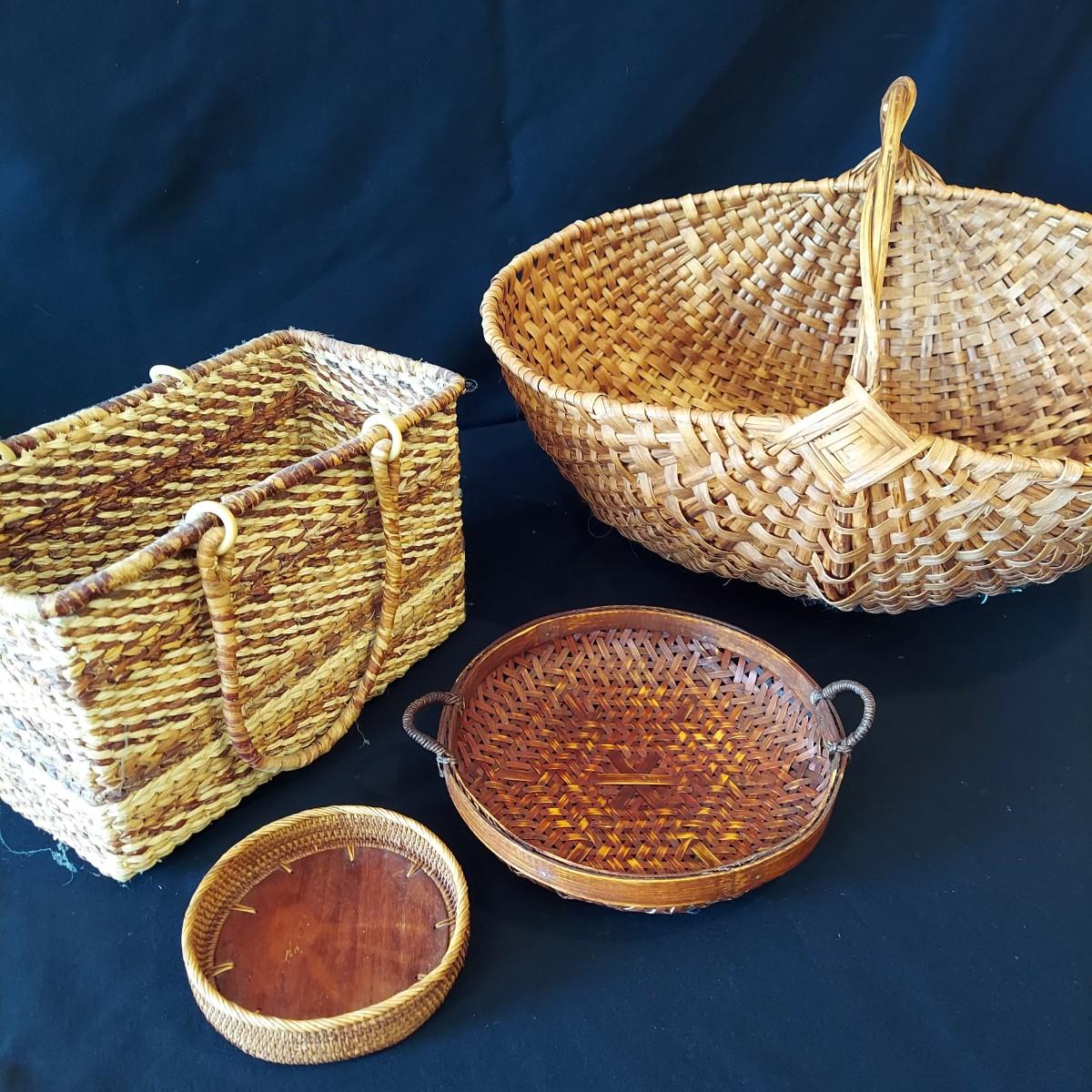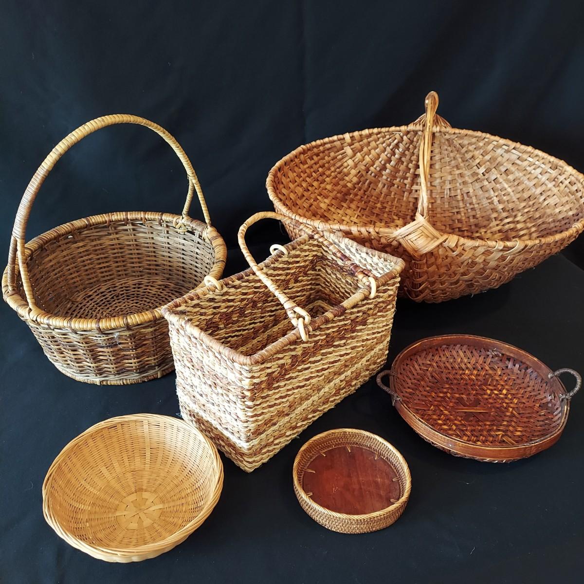 Six woven wicker style baskets made from mixed materials. The smallest has a 5.5"D. The largest measures 22" x 13" x 14"H. Shipping available